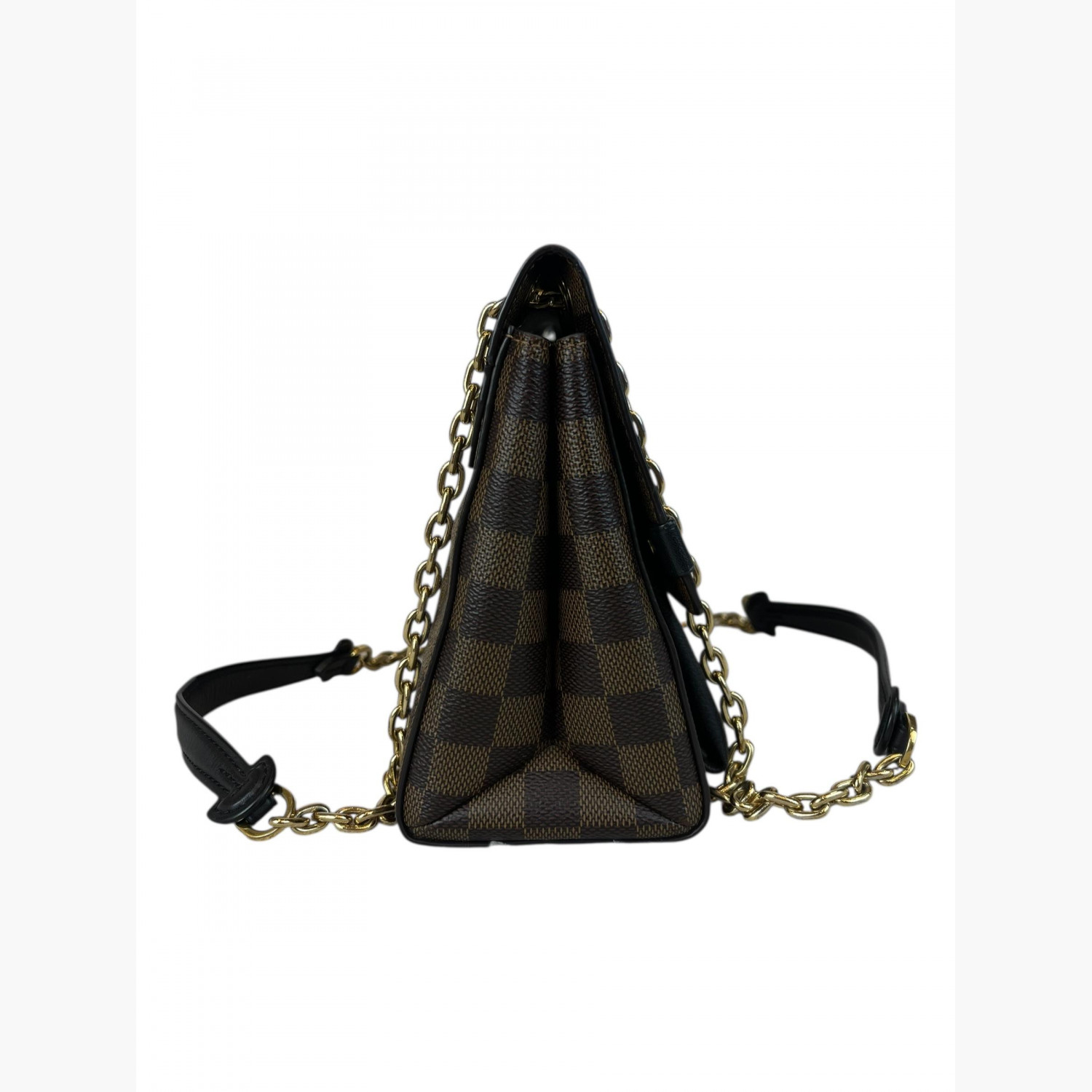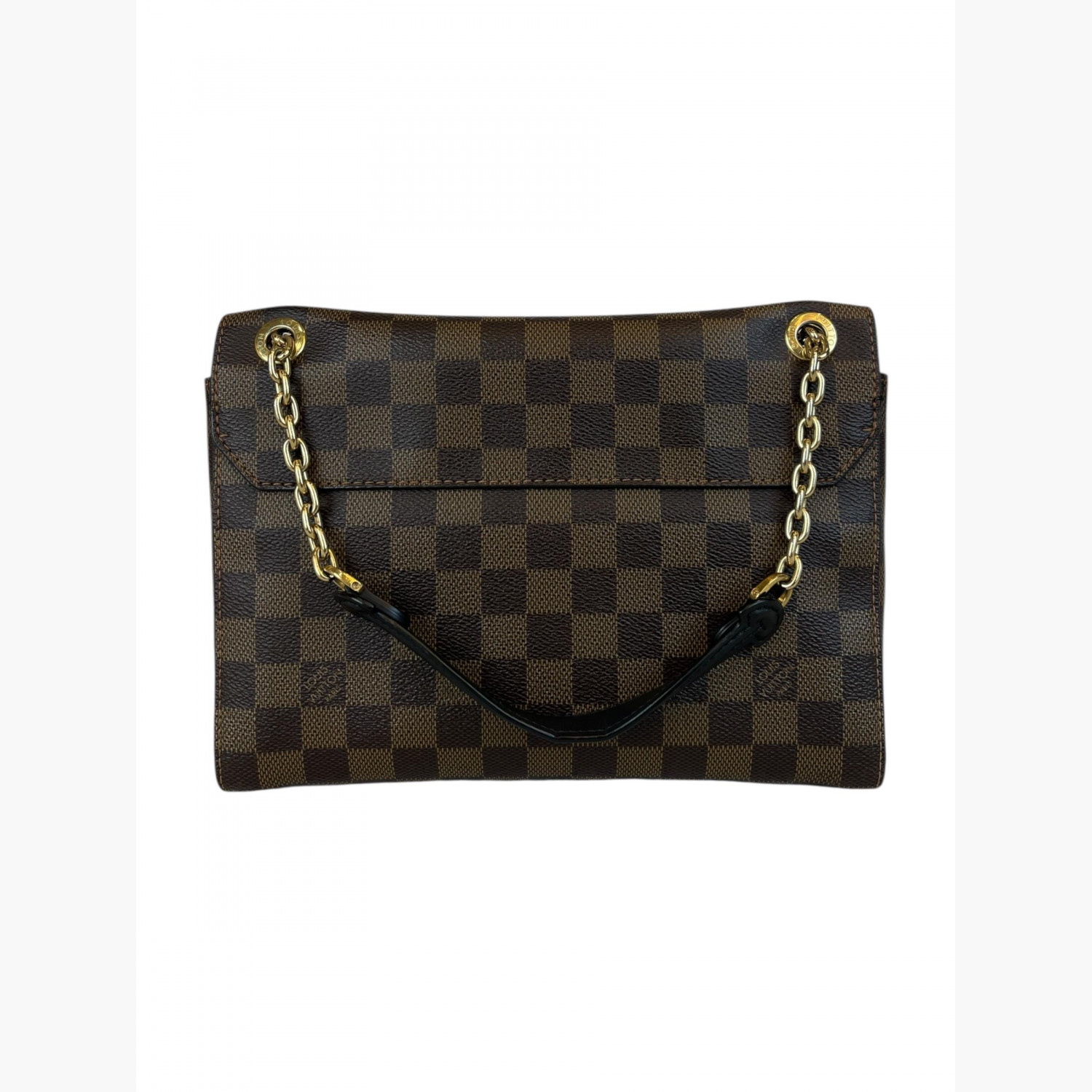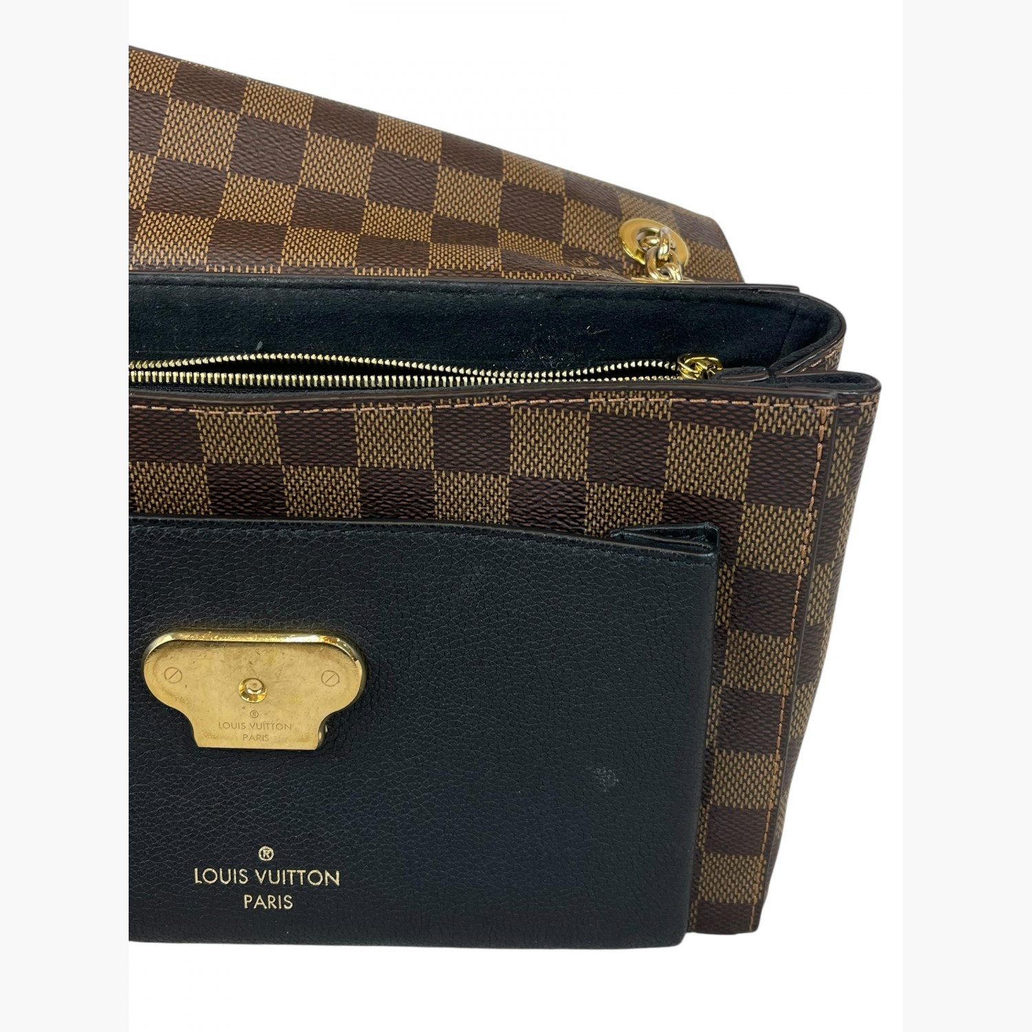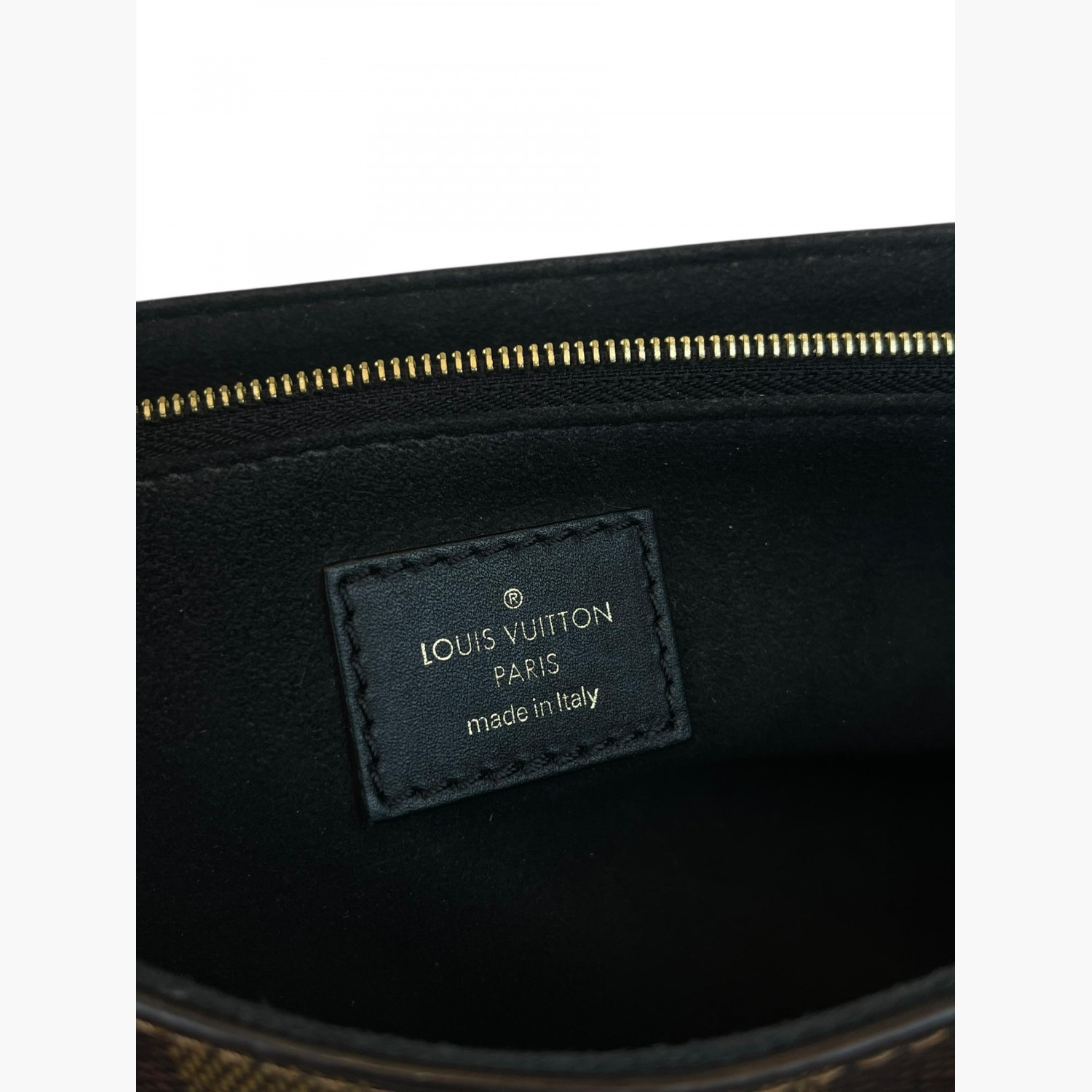 Коричневая сумка выполнена из канвы с чёрным кожаным карманом на металлической цепочке золотого цвета. Внутри одно основное отделение с карманом на молнии и открытым карманом с лицевой стороны. В хорошем состоянии, есть следы носки.