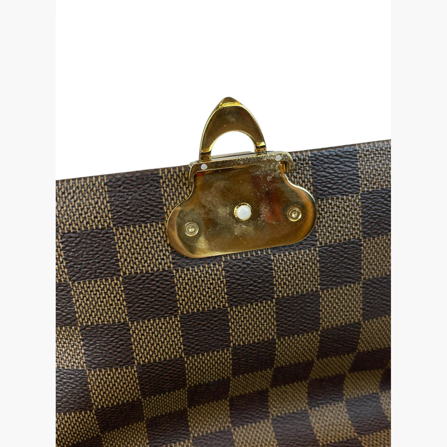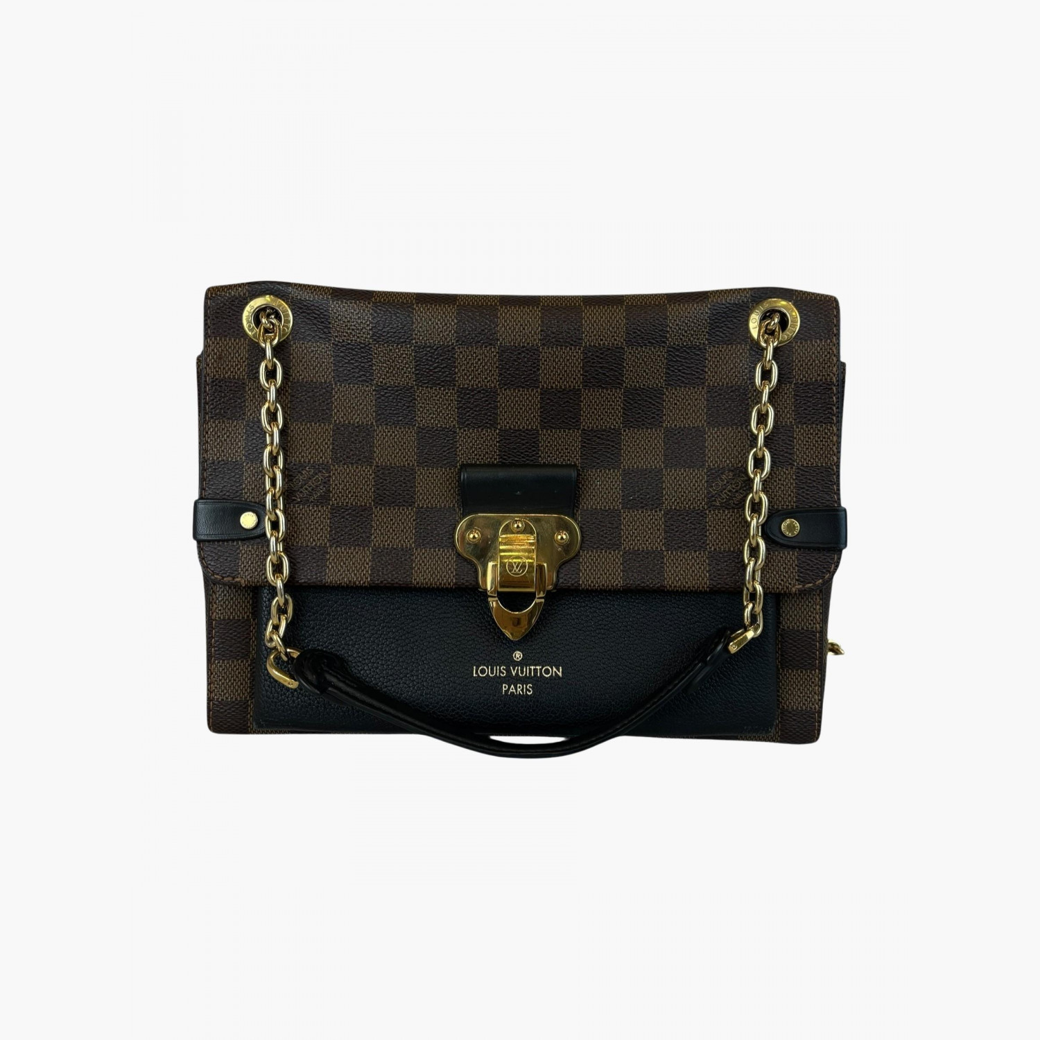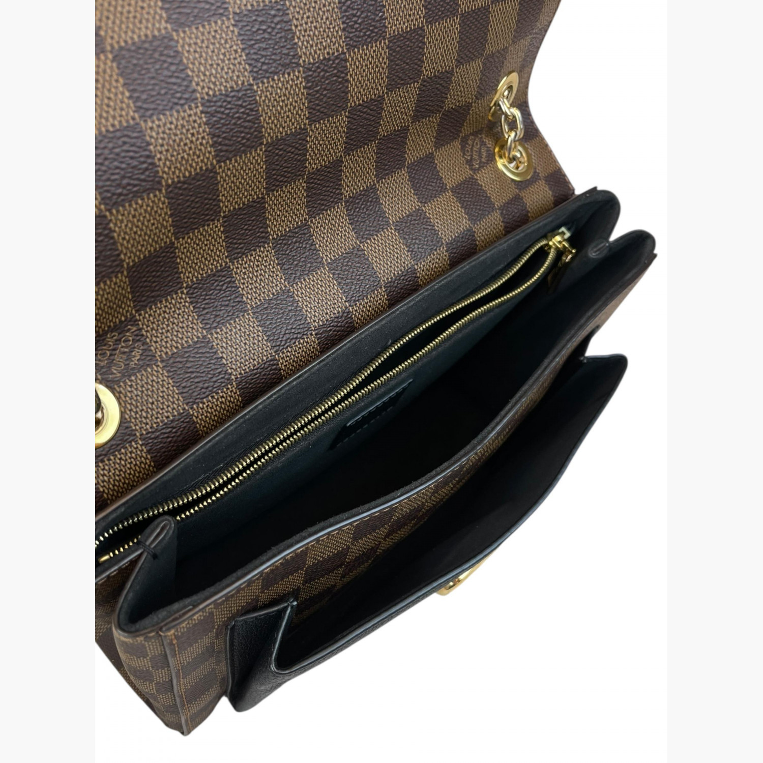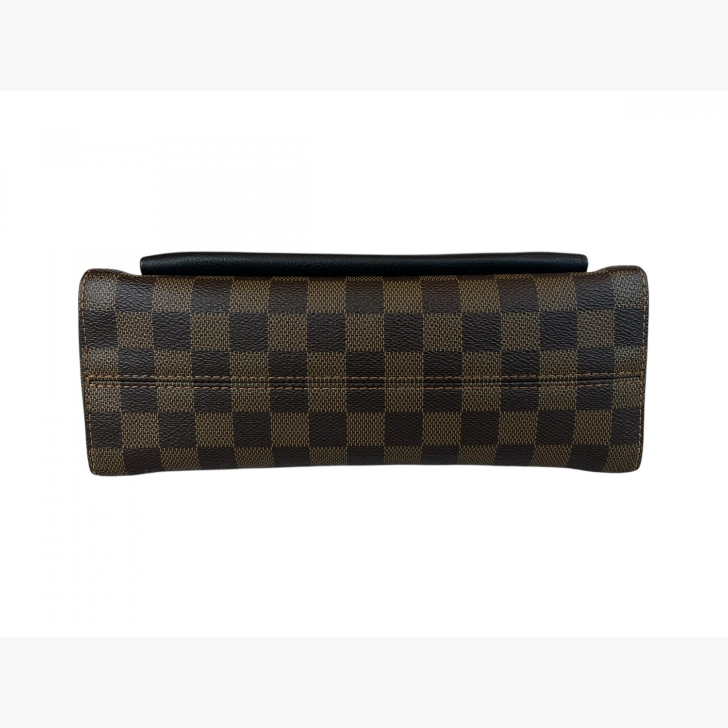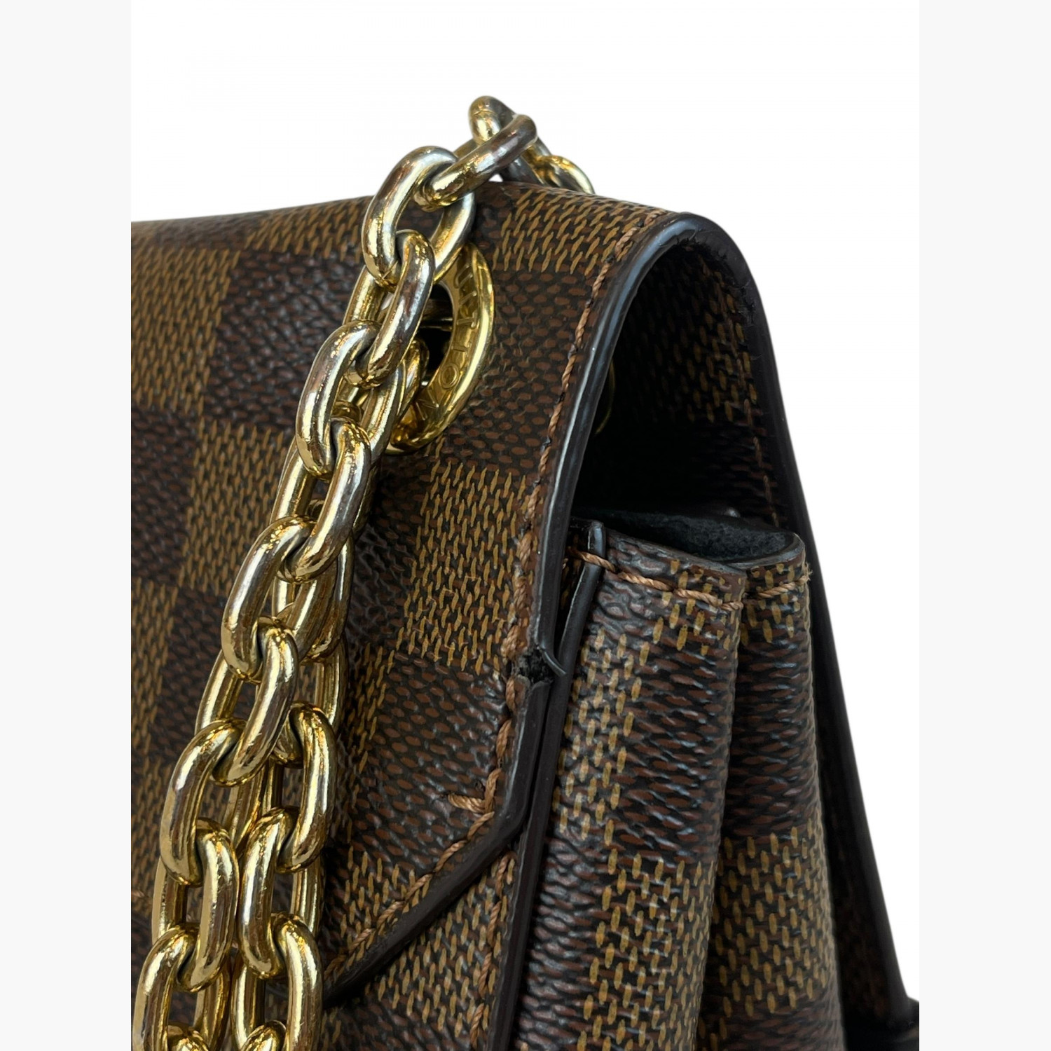 Коричневая сумка выполнена из канвы с чёрным кожаным карманом на металлической цепочке золотого цвета. Внутри одно основное отделение с карманом на молнии и открытым карманом с лицевой стороны. В хорошем состоянии, есть следы носки.