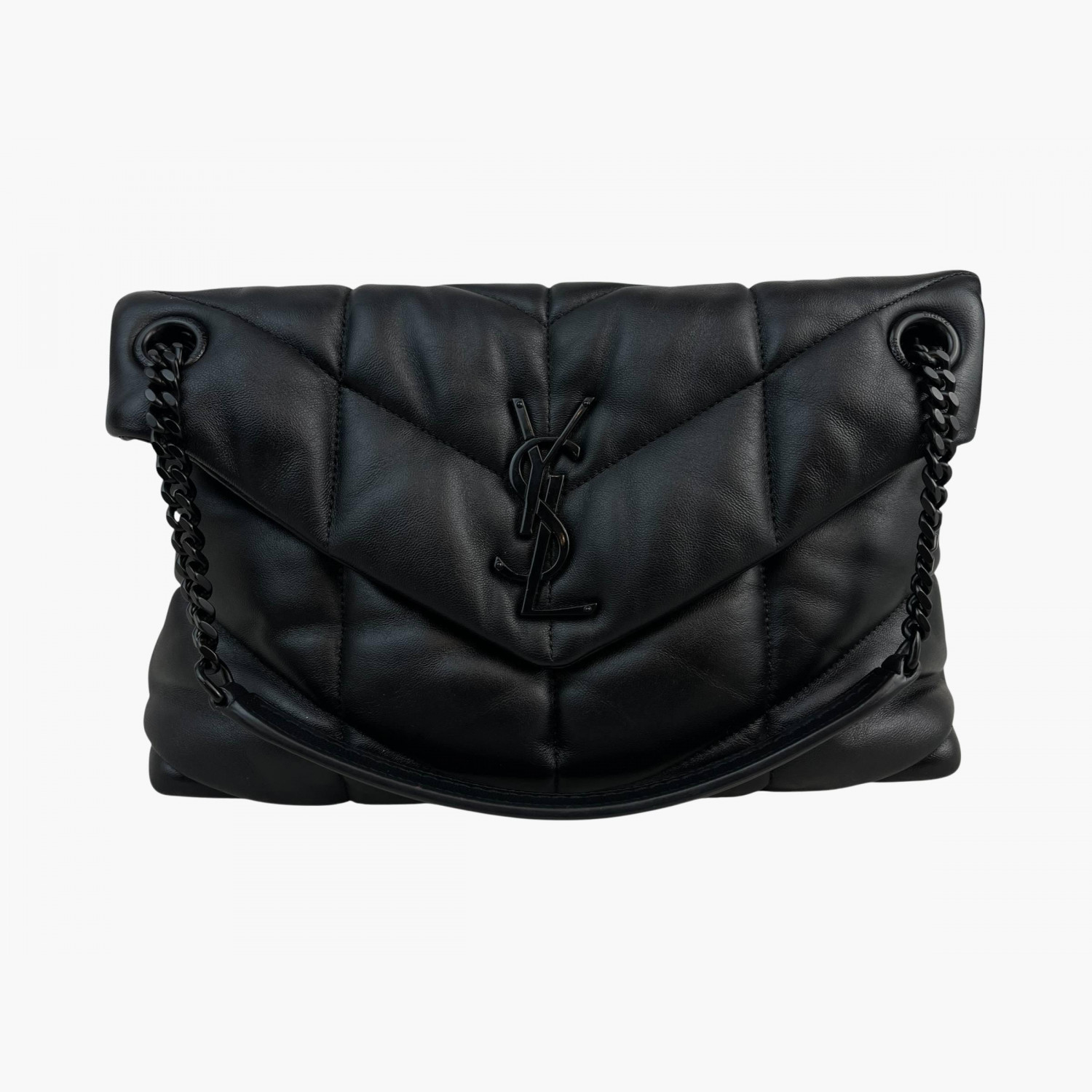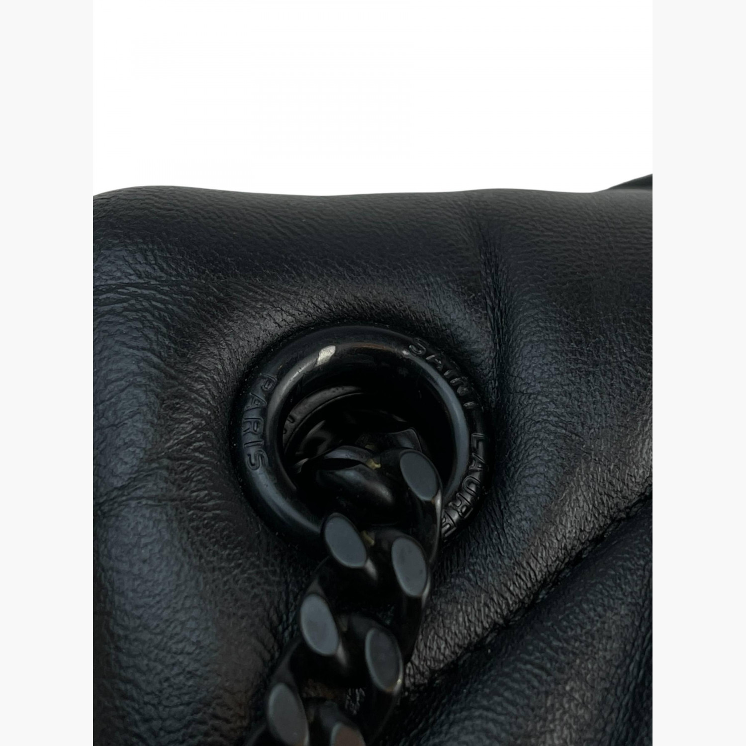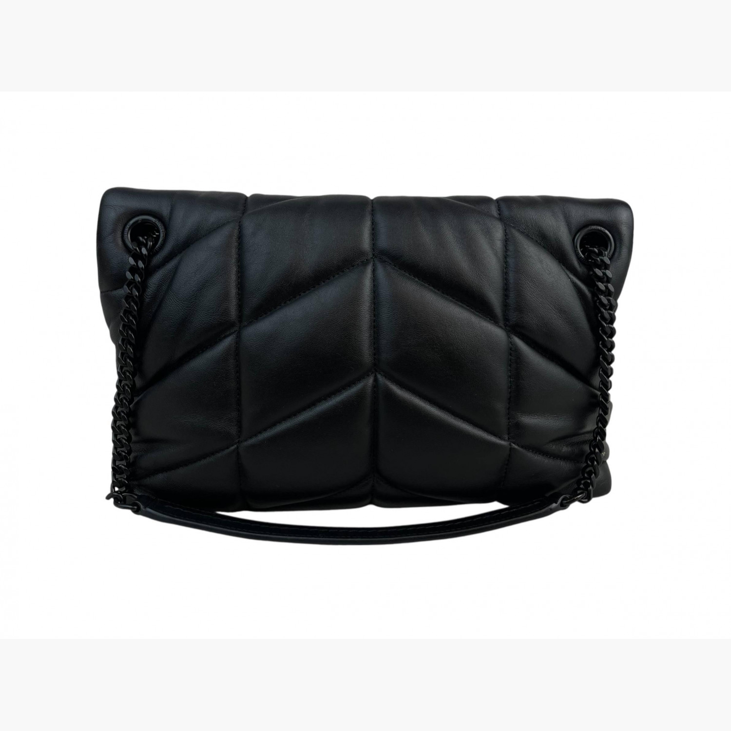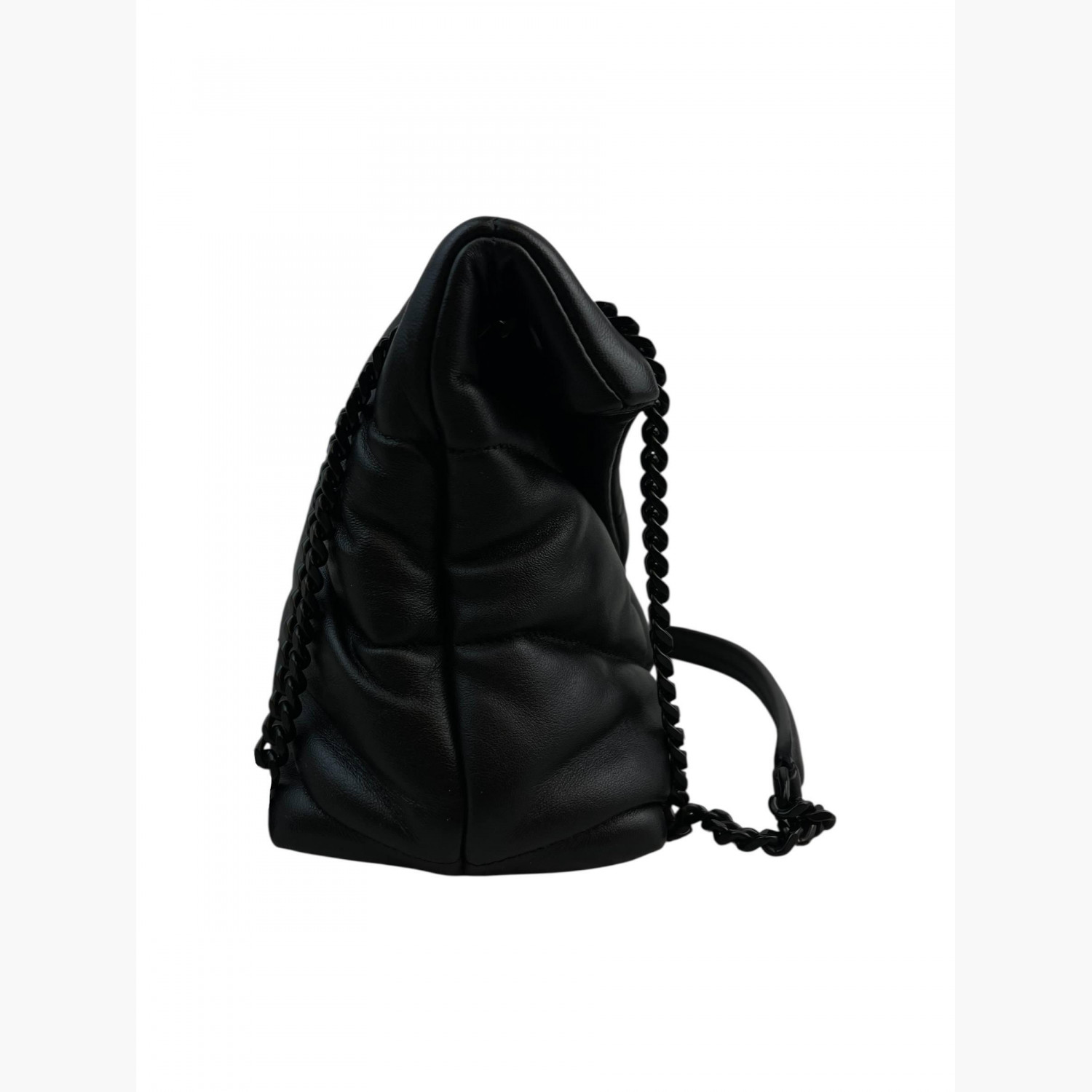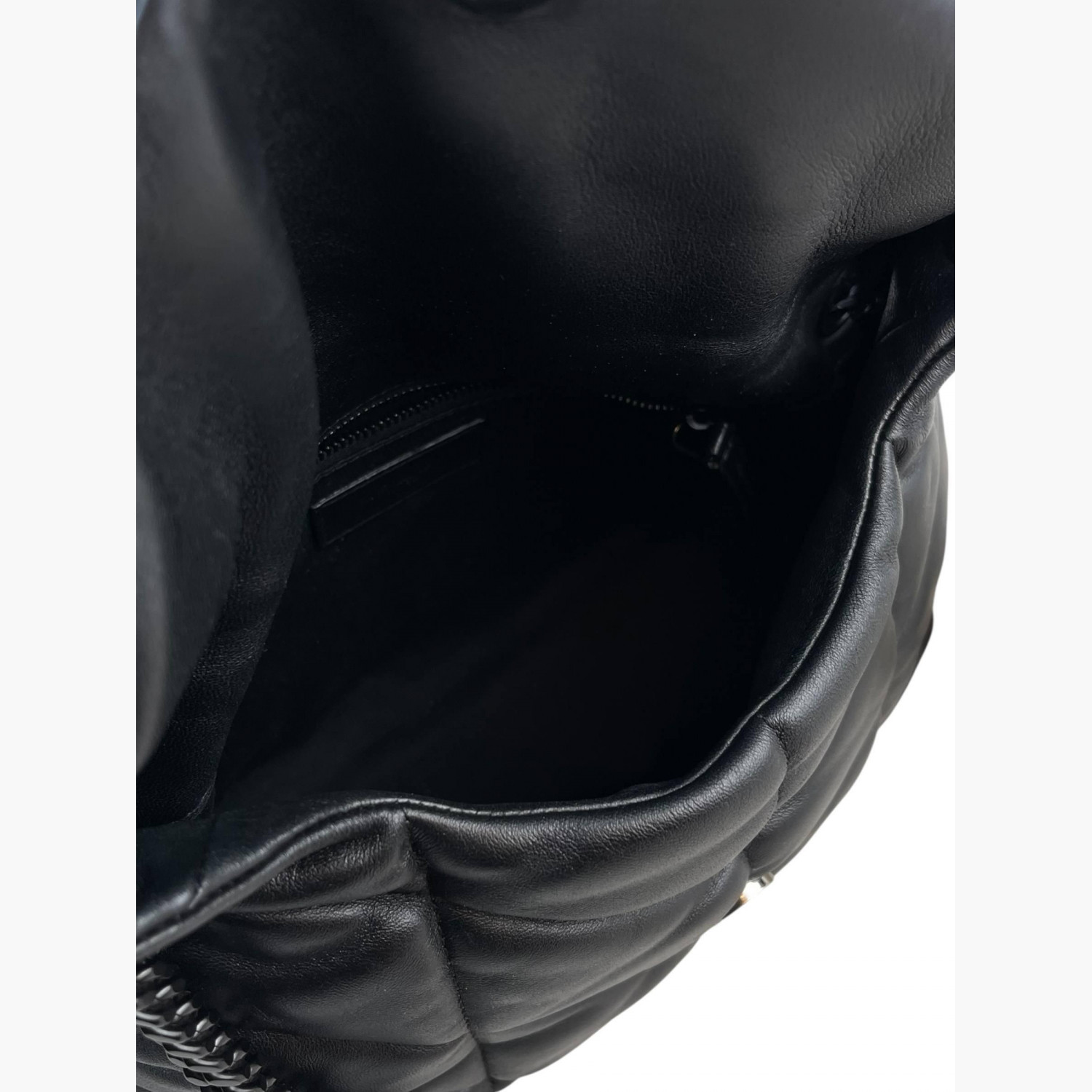 Чёрная кожаная стёганая сумка с чёрной металлической цепочкой. Внутри одно основное отделение с карманом на молнии. В отличном состоянии, есть незначительные следы носки.