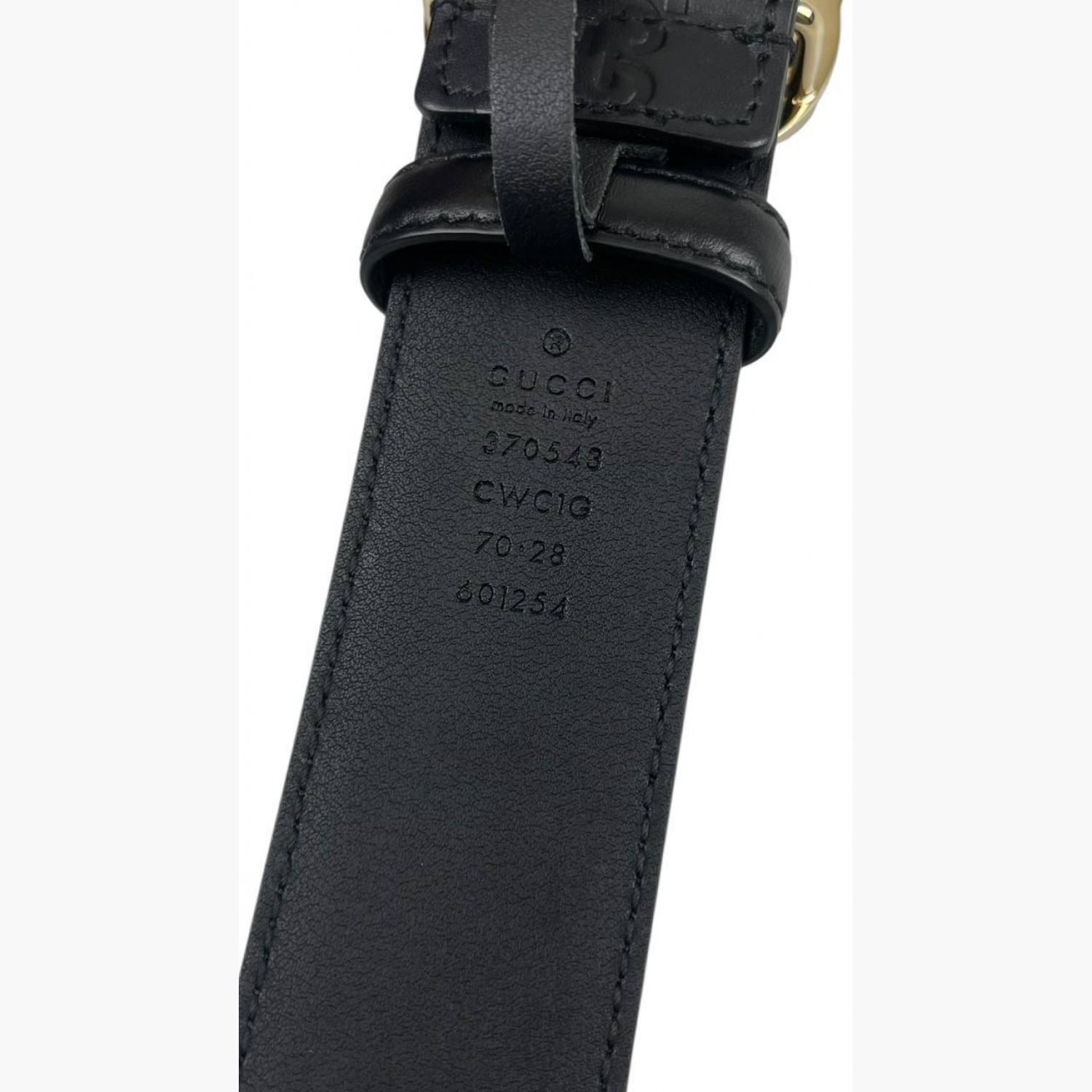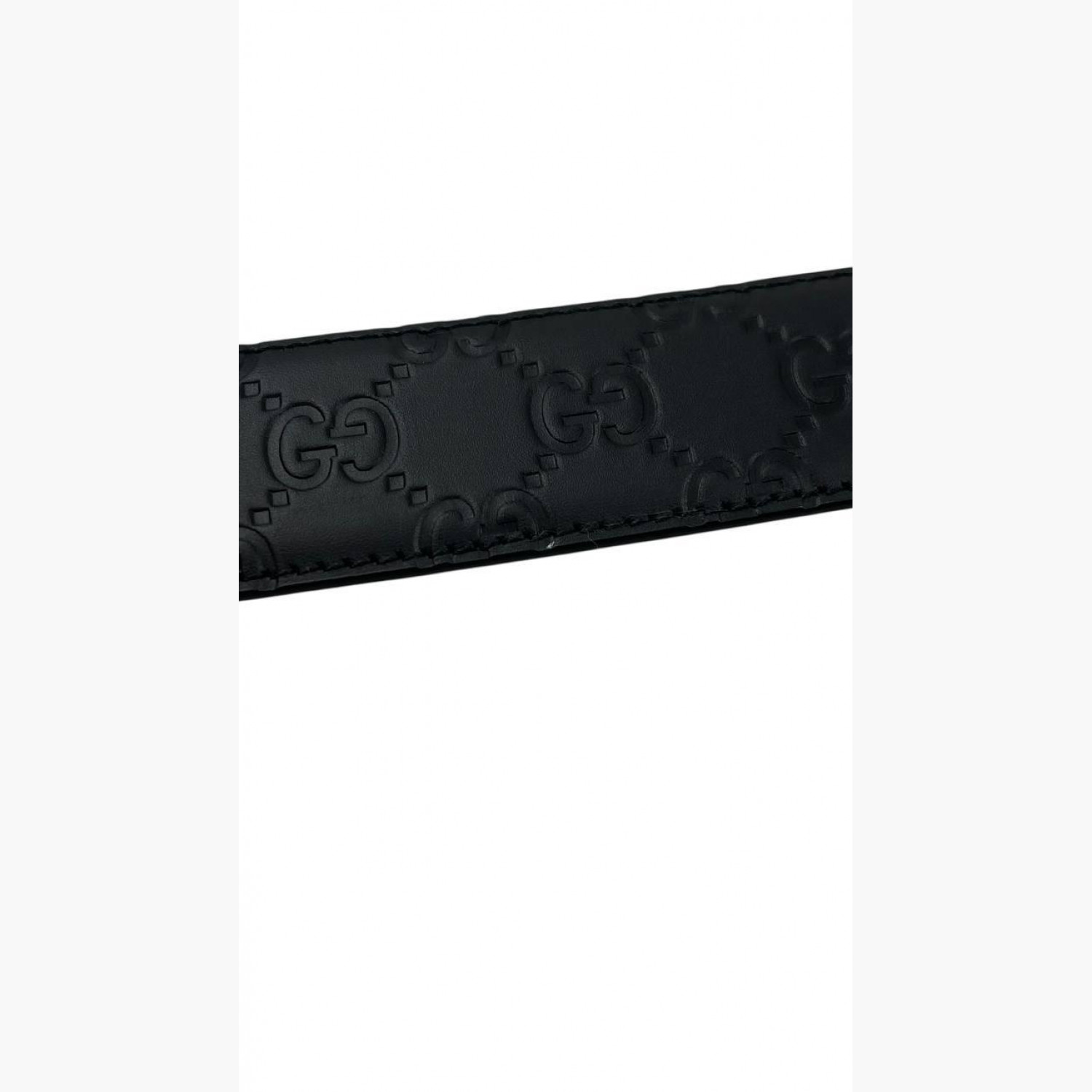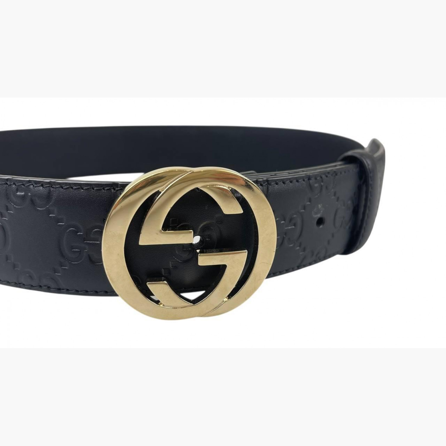 Чёрный кожаный ремень с тиснением лого, с пряжкой золотого цвета в виде лого. В очень хорошем состоянии, есть незначительные следы носки.