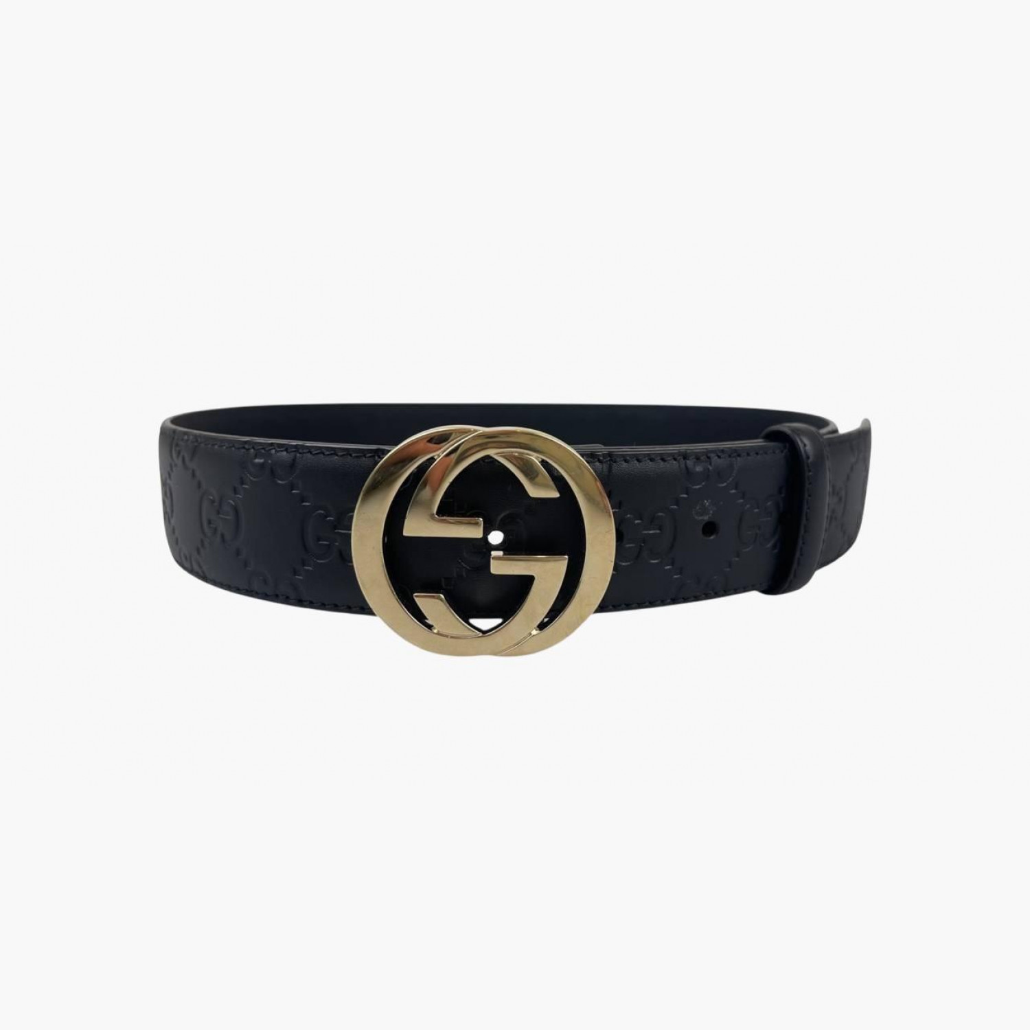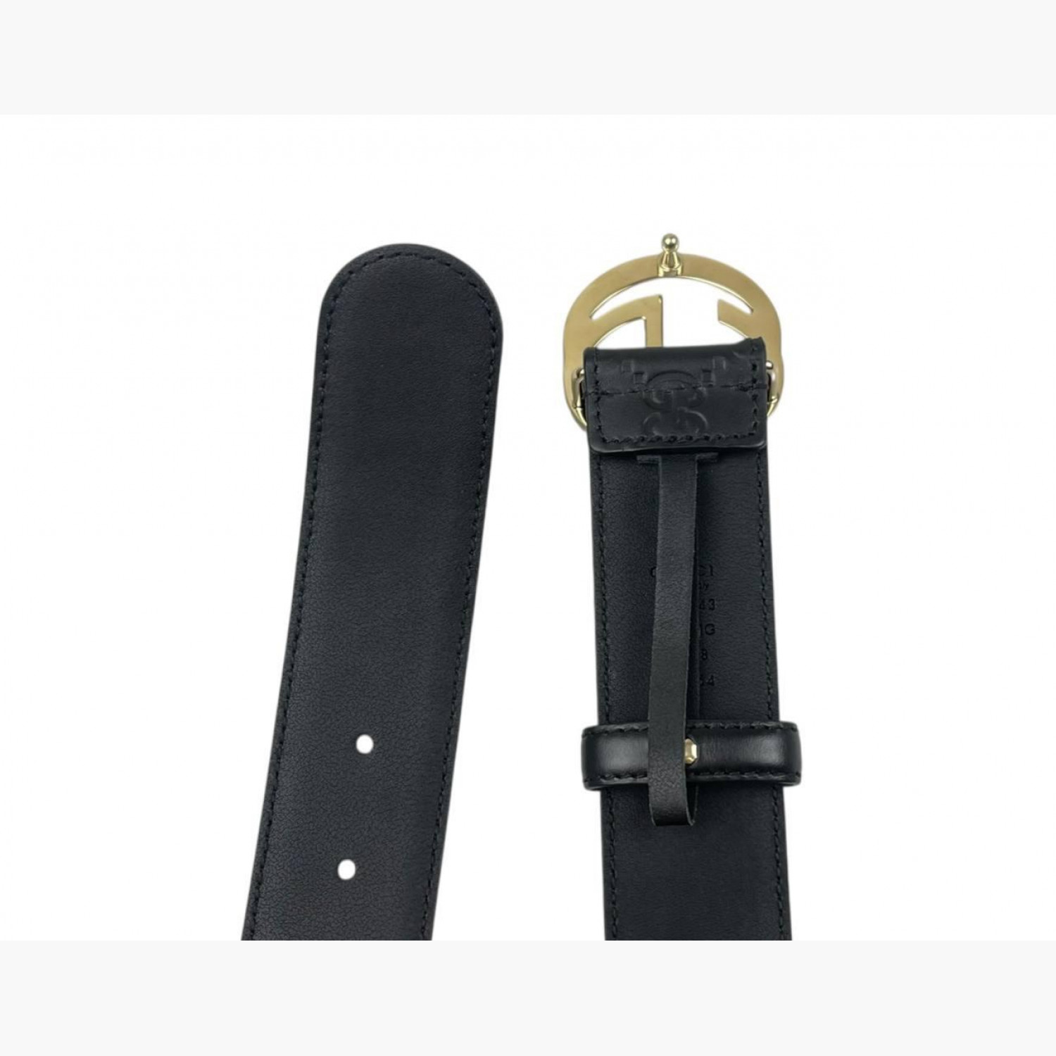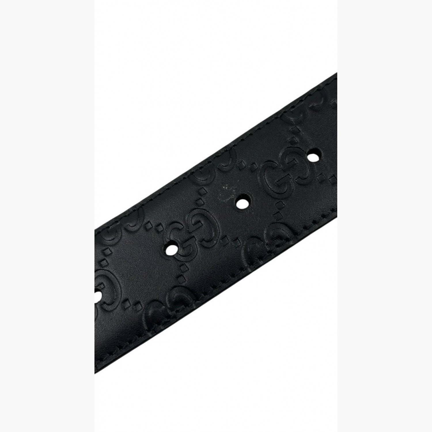 Чёрный кожаный ремень с тиснением лого, с пряжкой золотого цвета в виде лого. В очень хорошем состоянии, есть незначительные следы носки.