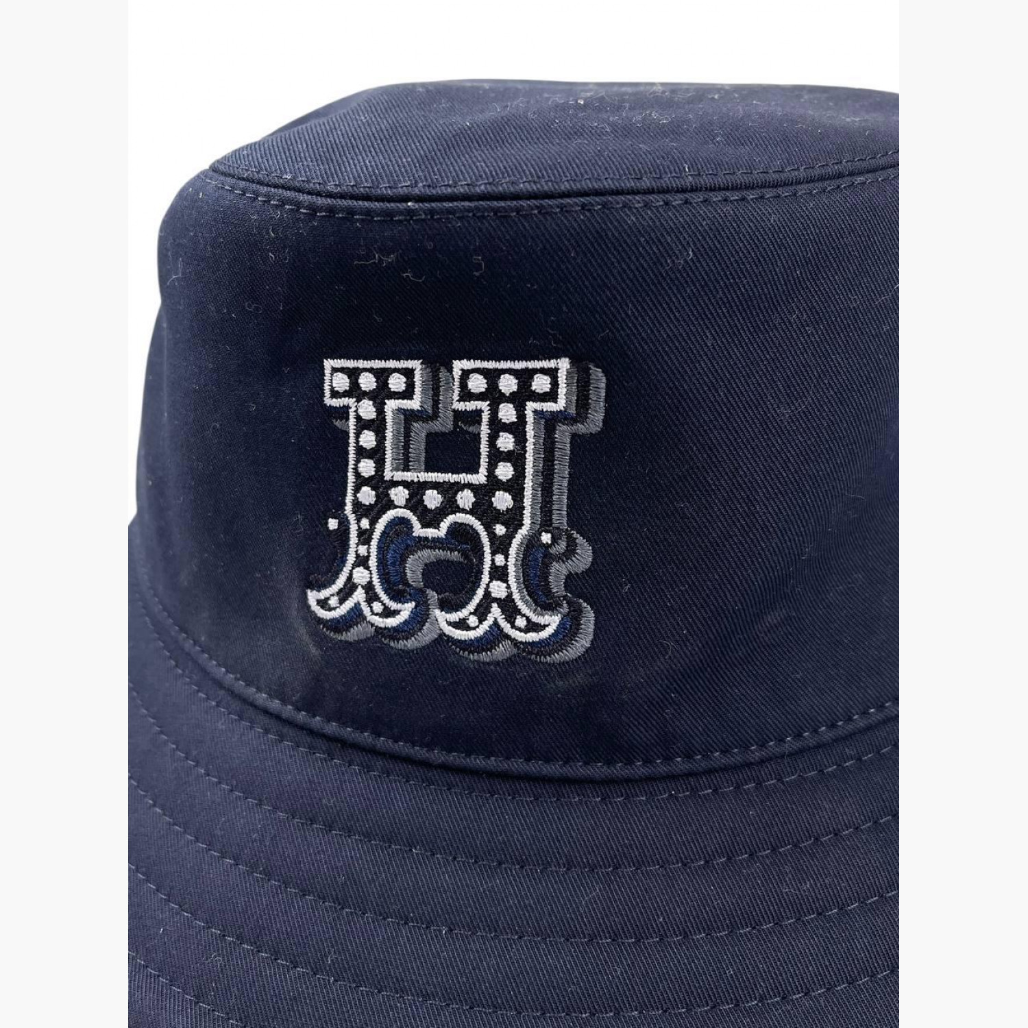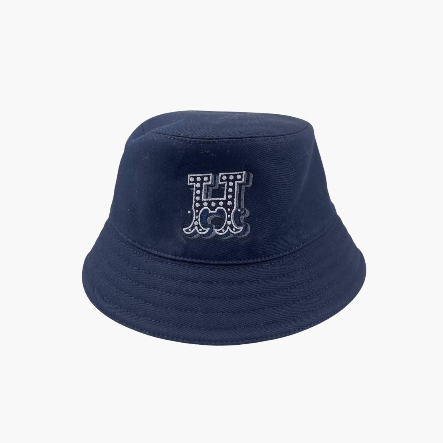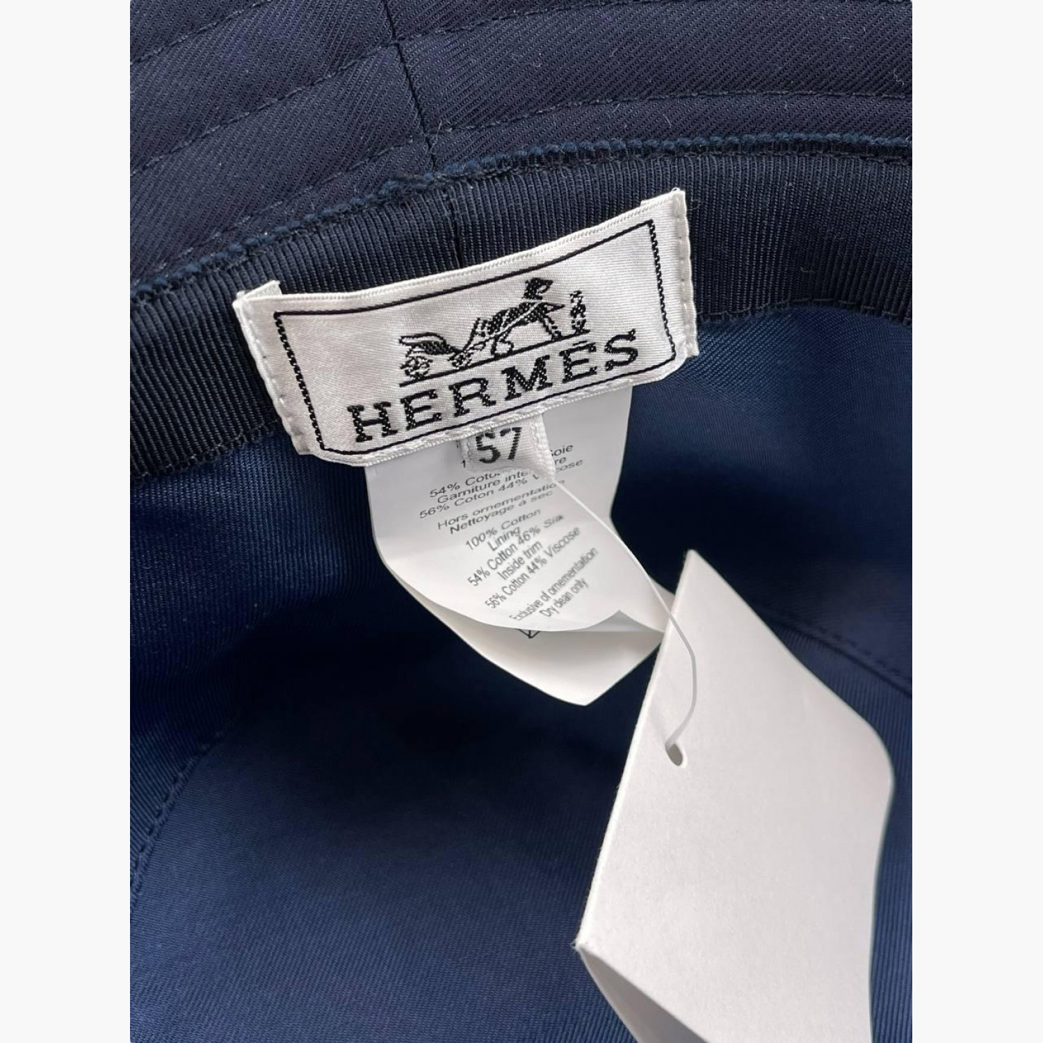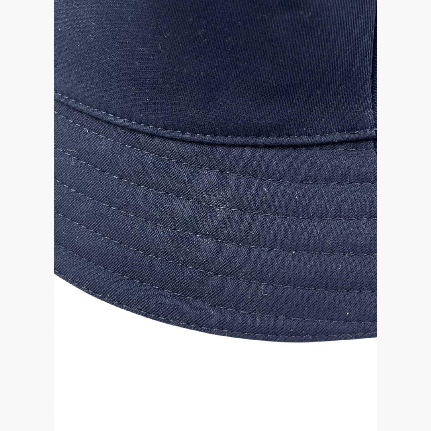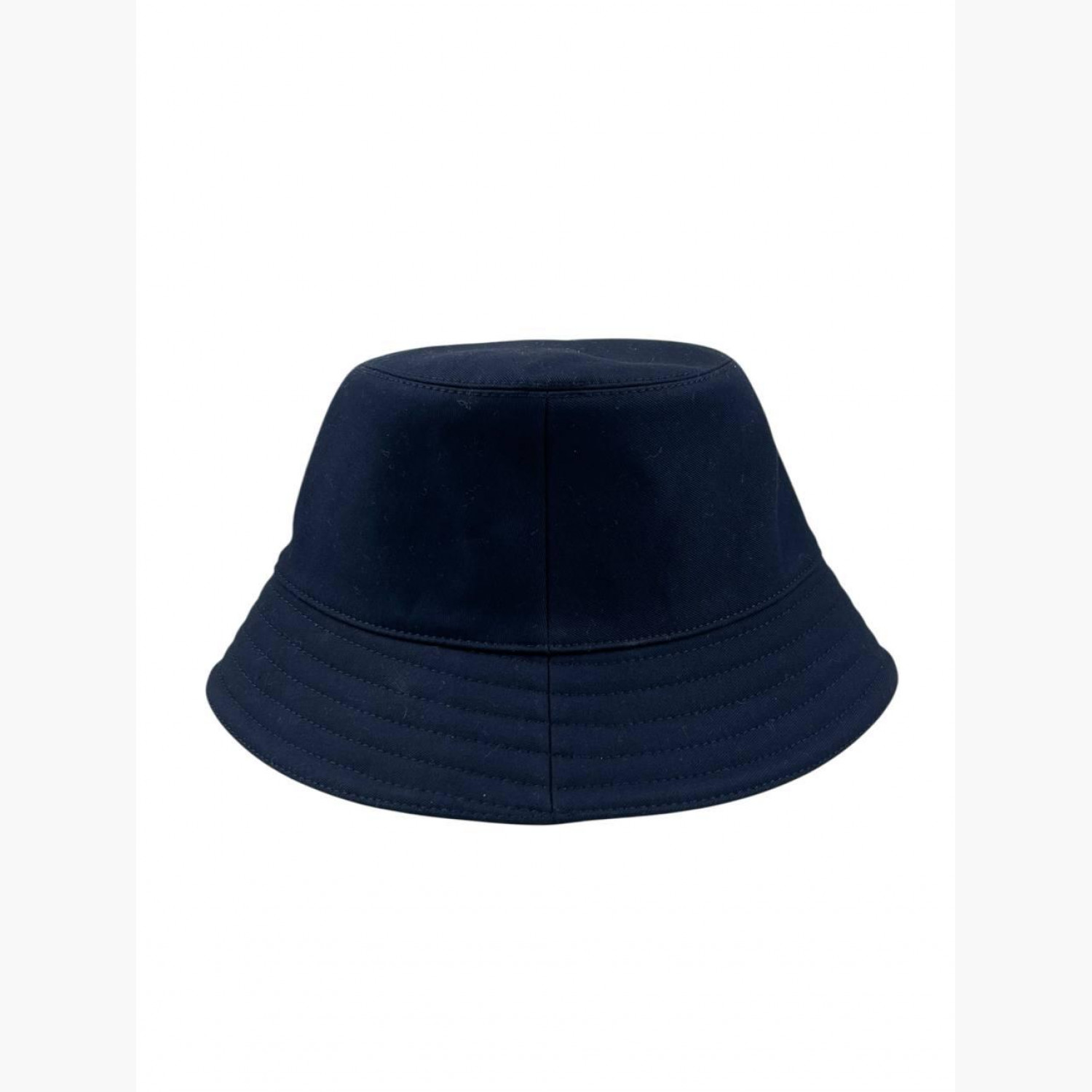 Синяя панама с лого на передней стороне, с биркой. Состав: основной материал — 100% хлопок; подкладка — 54% хлопок, 46% шелк; внутренняя отделка — 56% хлопок, 44% вискоза. В хорошем состоянии, есть следы носки.