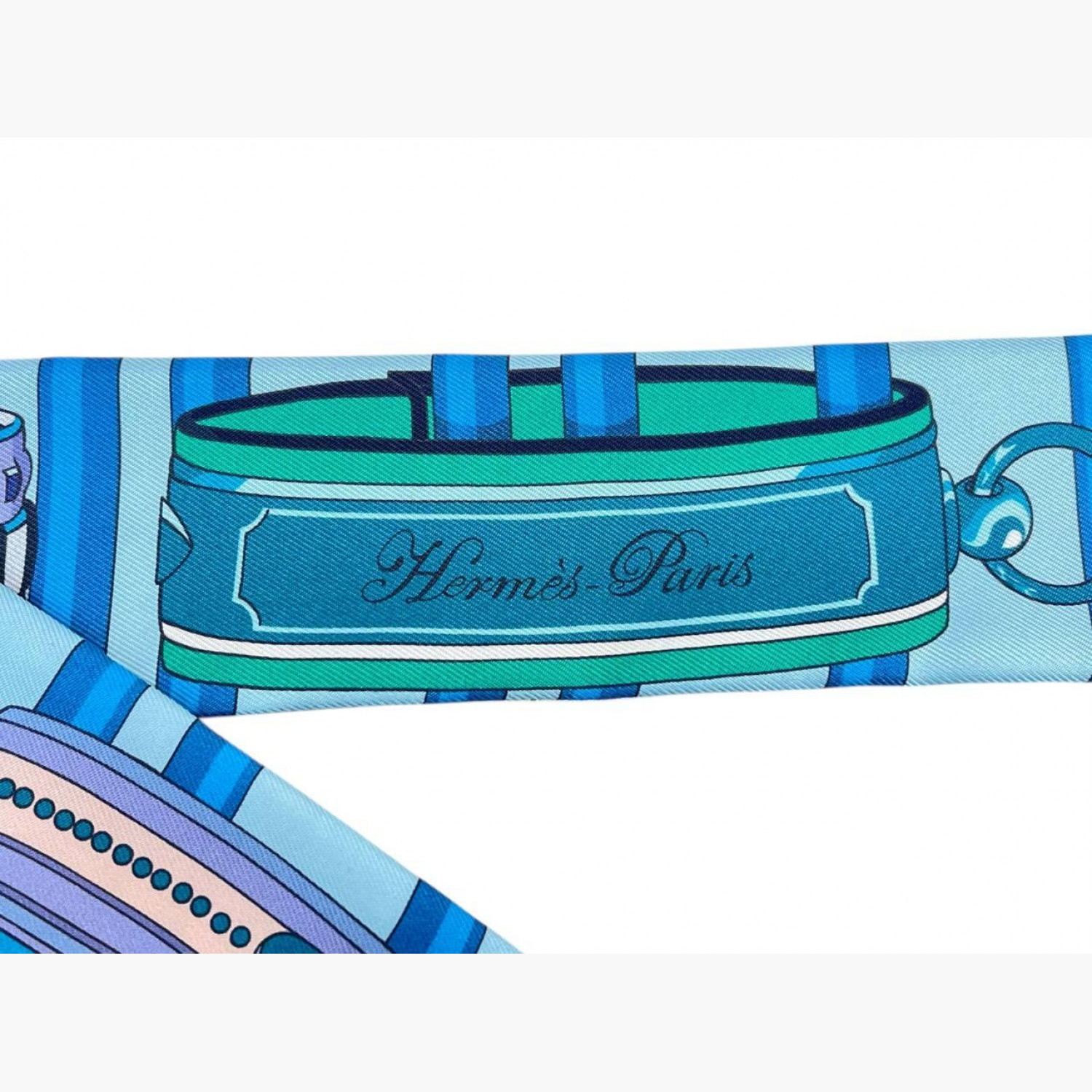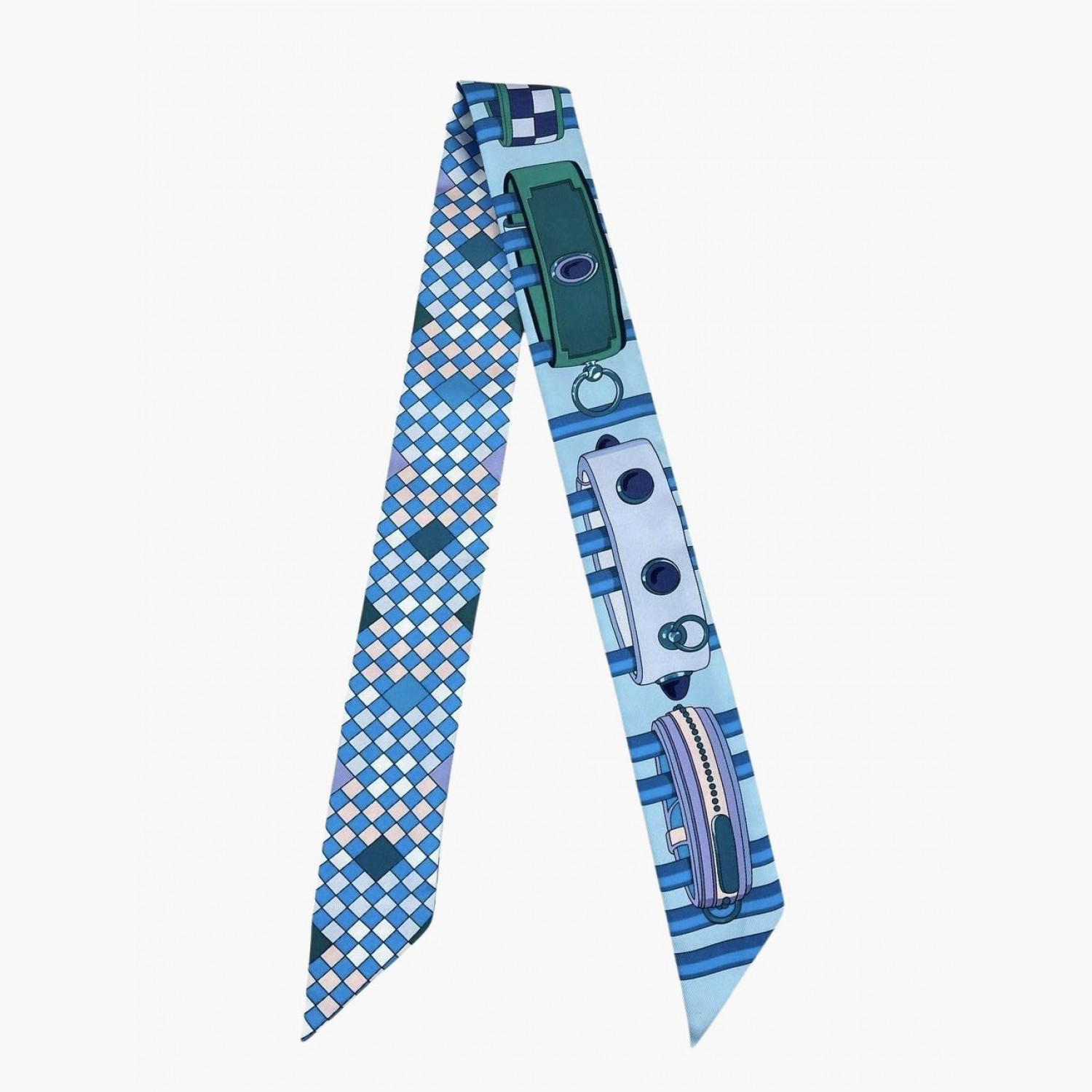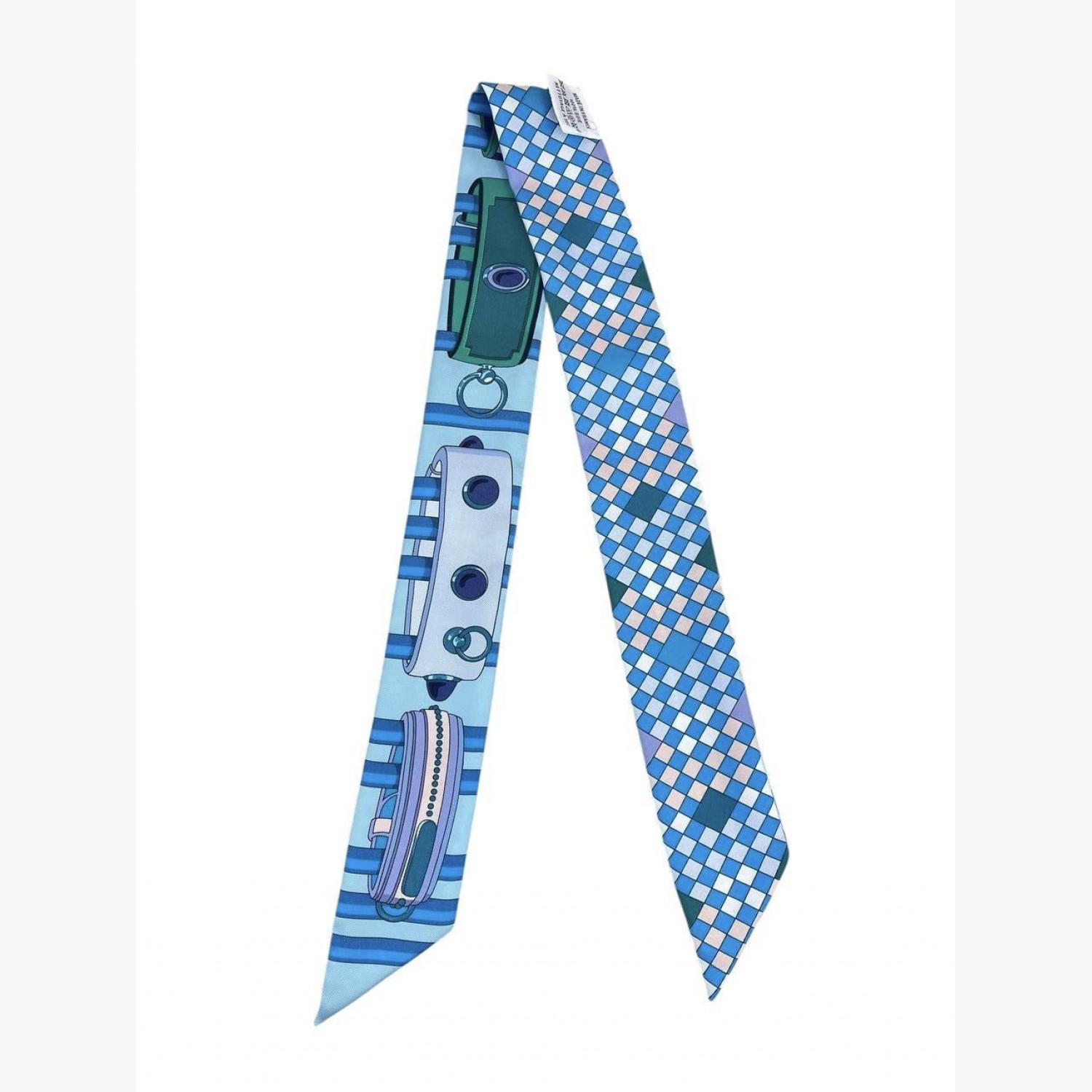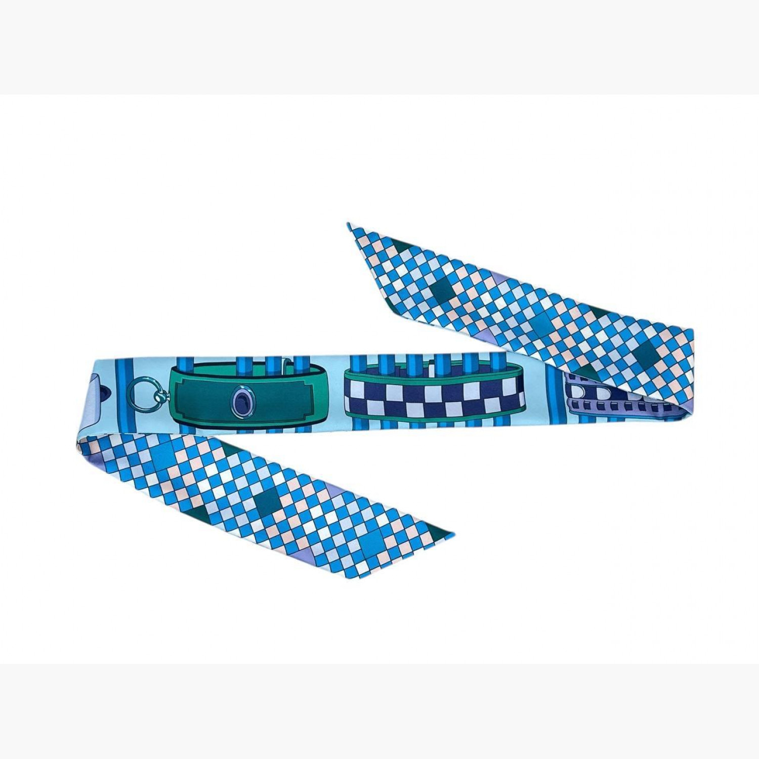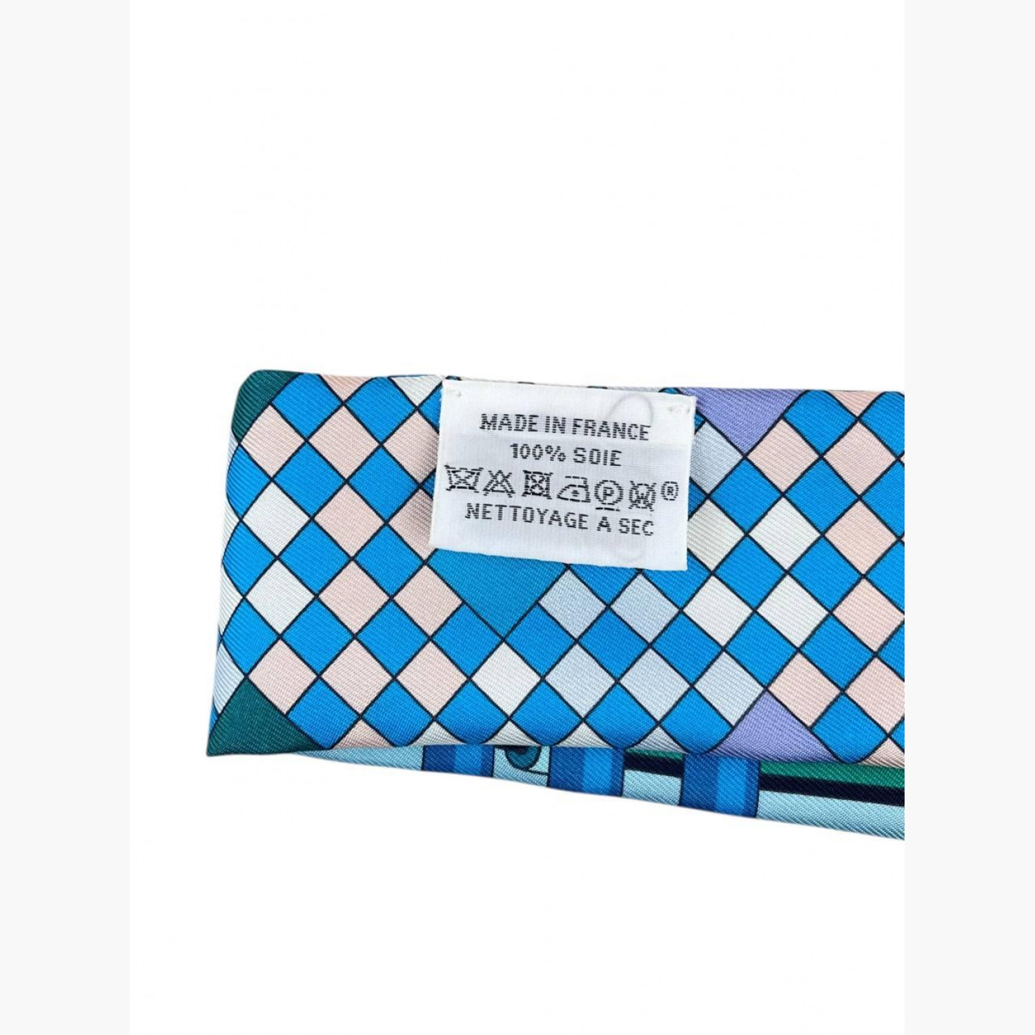 Шёлковый платок в зелёных, голубых и синих цветах, принт — Collier de Chien. Платок в отличном состоянии, но повреждена коробка: отсутствует донышко.