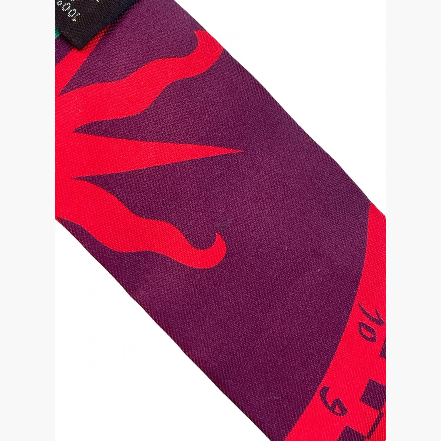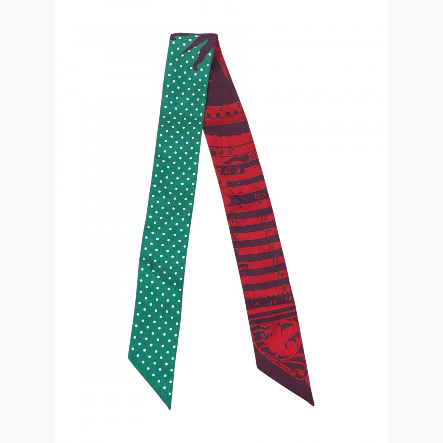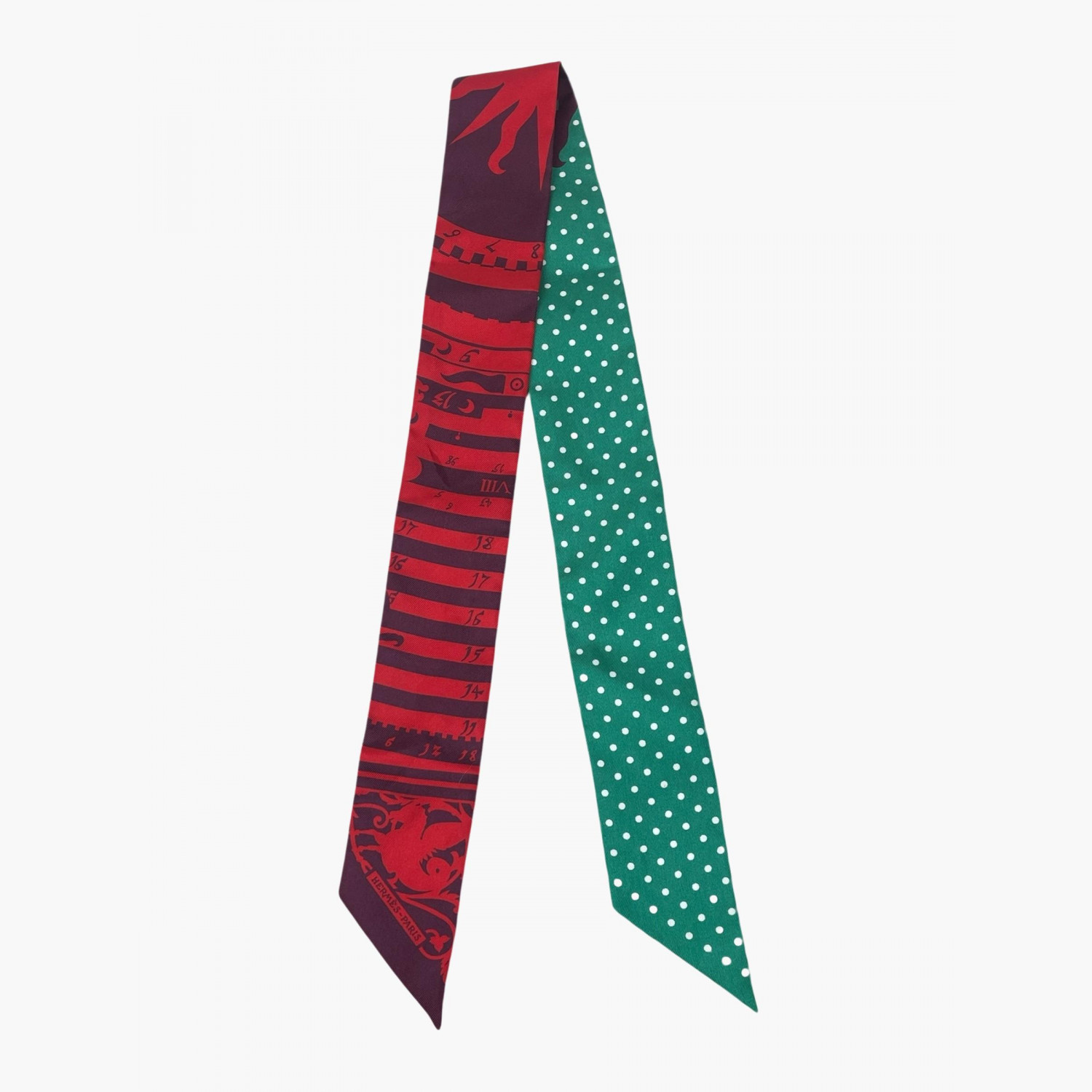 Шёлковый твилли выполнен в яркой красно-зелёной цветовой гамме. В отличном состоянии, есть едва заметные следы носки.