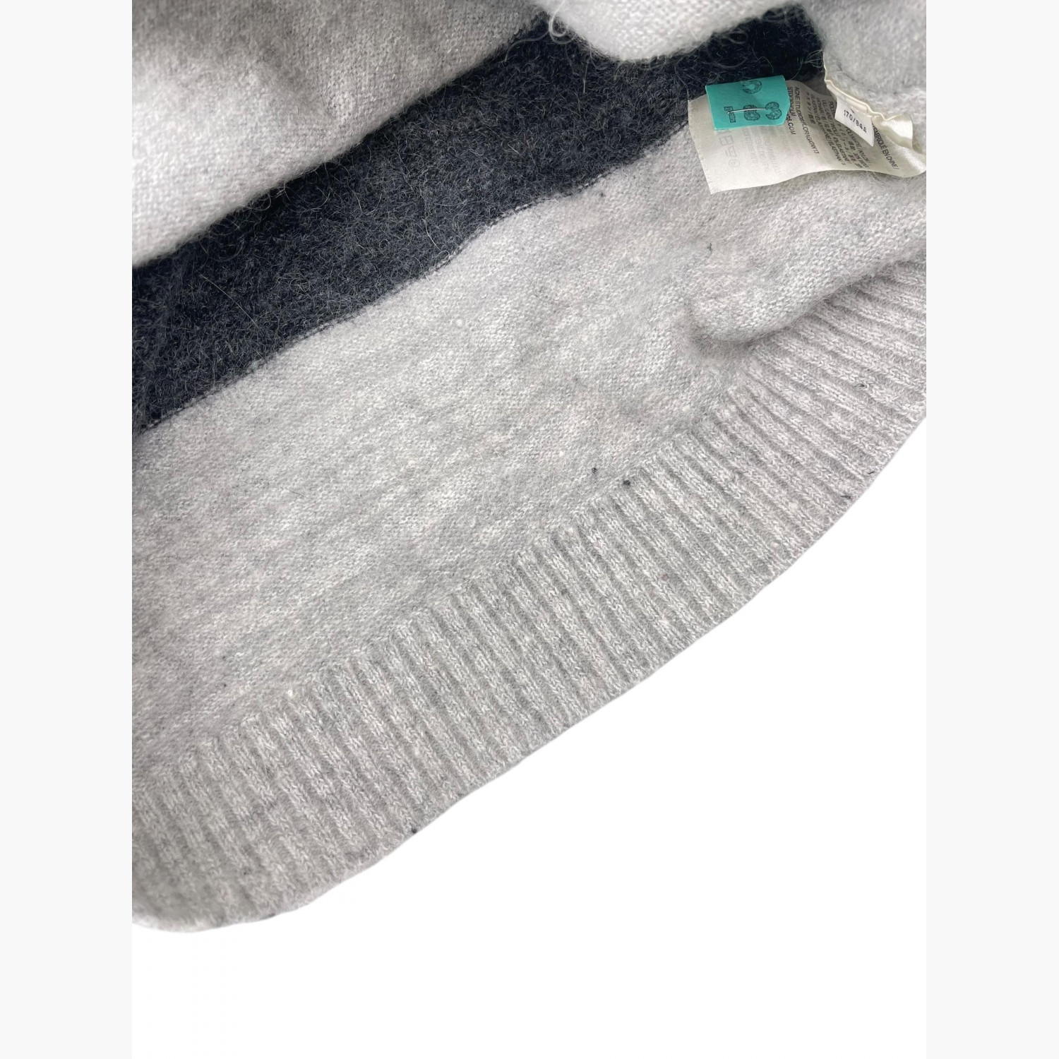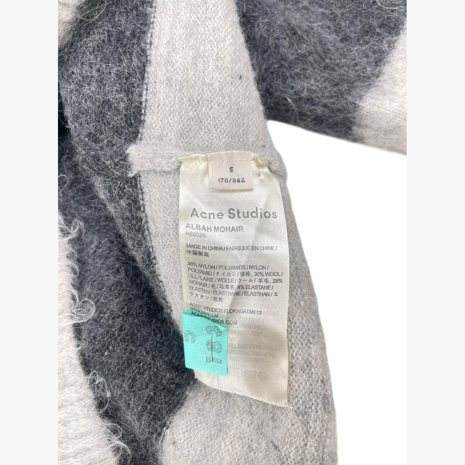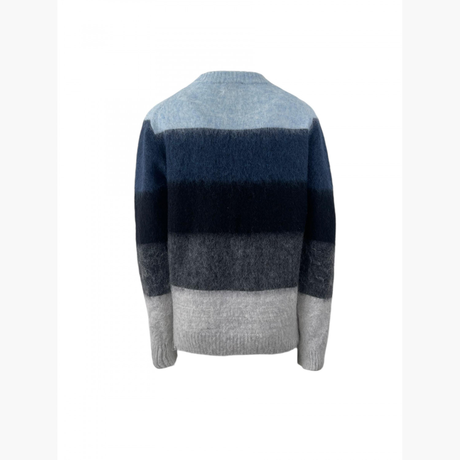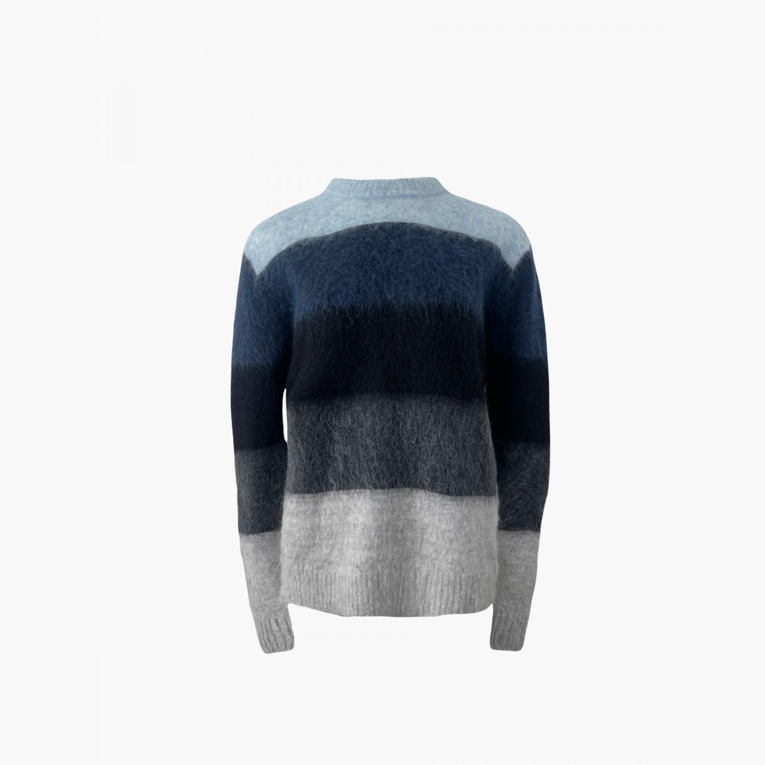 Мохеровый свитер в широкую полоску, выполнен в четырёх цветах: серый, чёрный, синий и голубой. Состав — 38% нейлон, 30% шерсть, 28% мохер, 4% эластан. В хорошем состоянии.