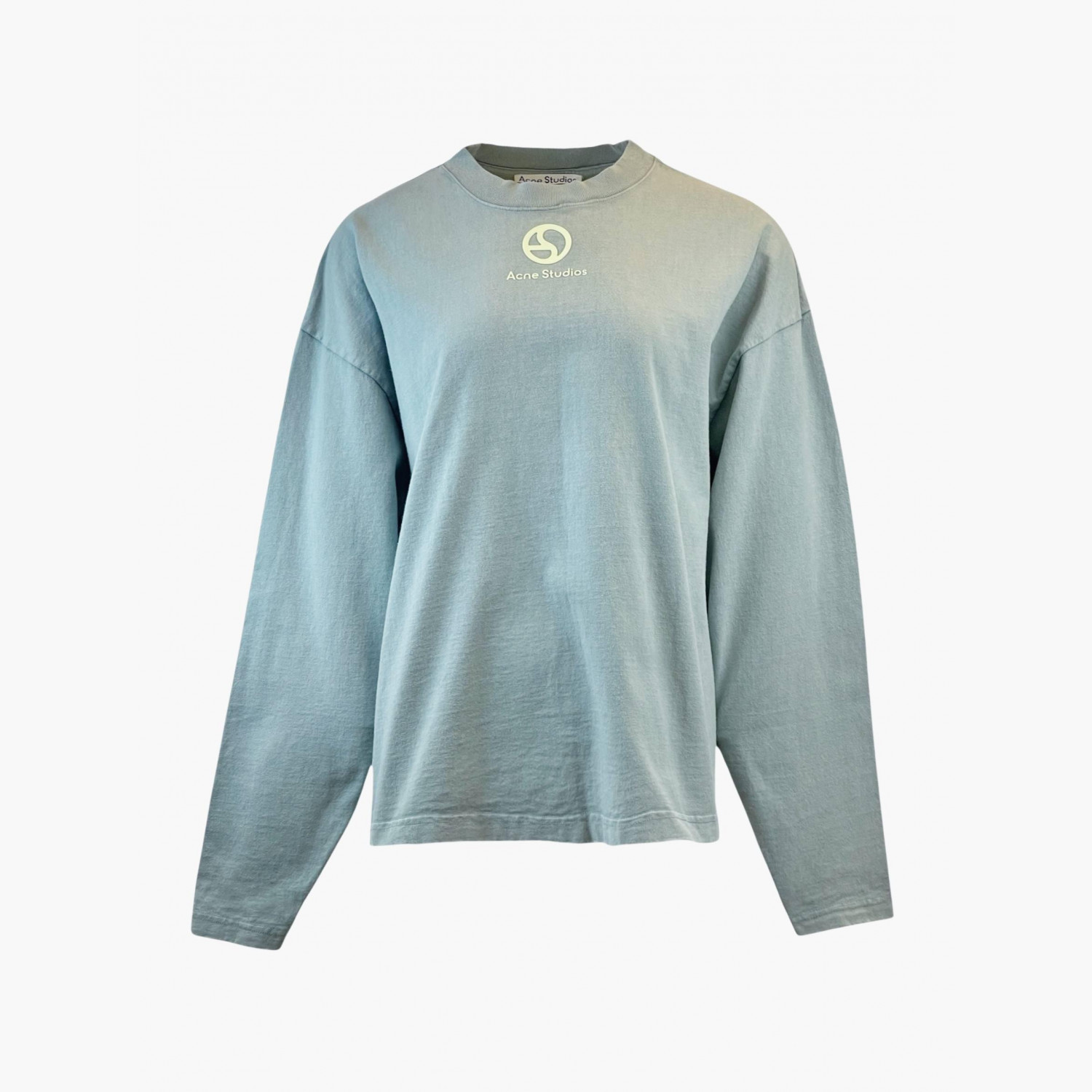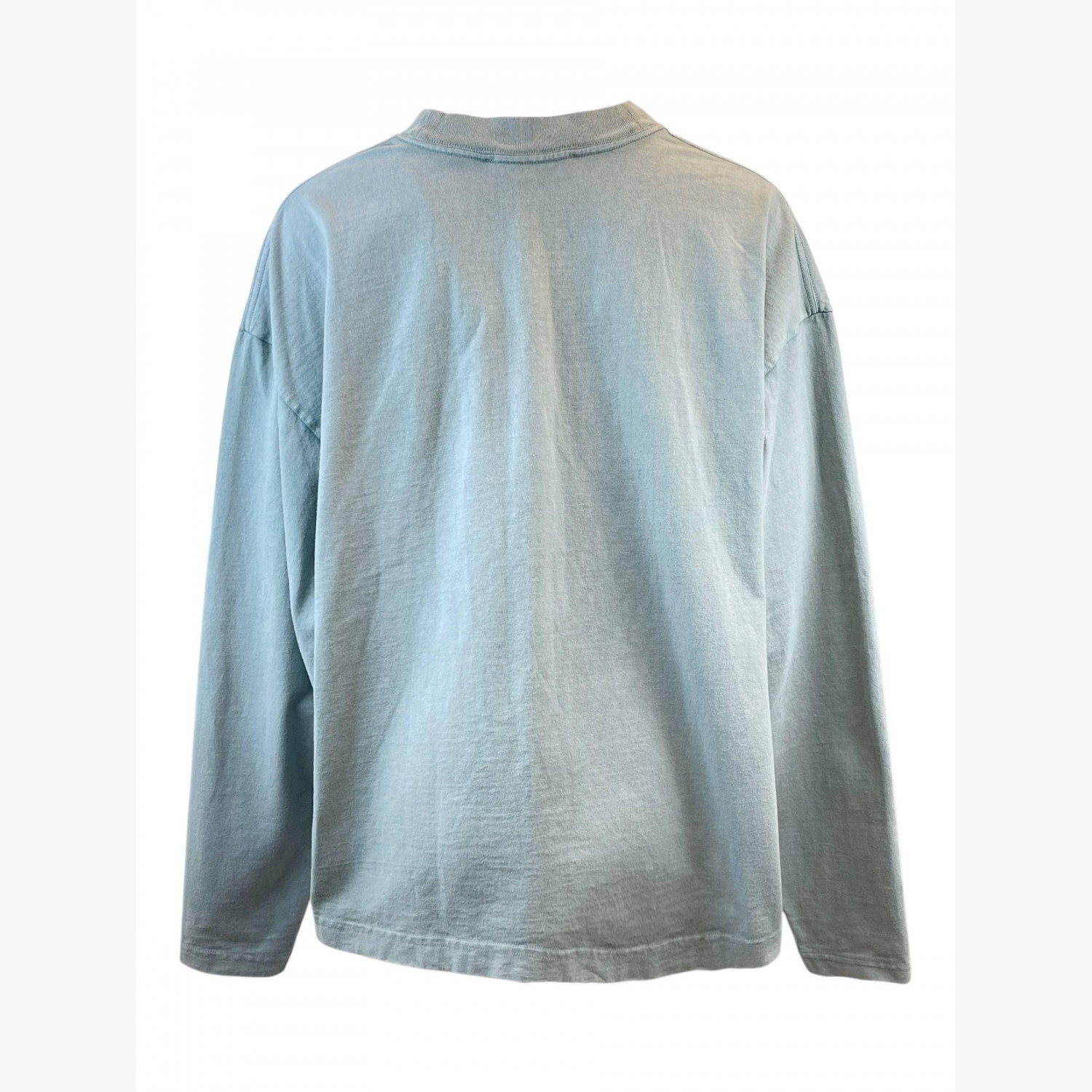 Мятный хлопковый лонгслив с жёлтым логотипом под горловиной.В хорошем состоянии, есть незначительное пятно с внутренней стороны рукава.