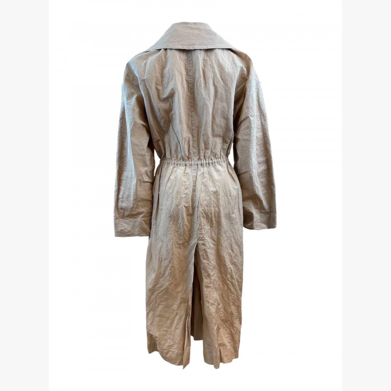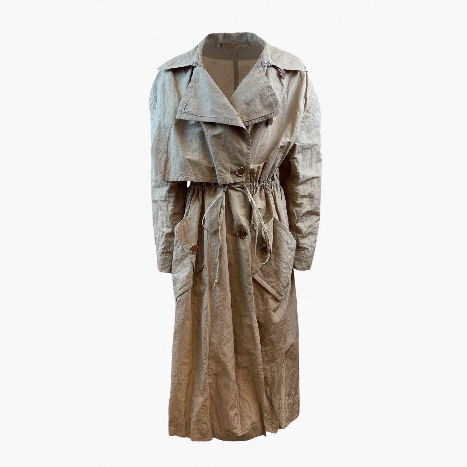 Бежевый плащ из плотной ткани на завязках. Размер: S/M.Состав: 73% хлопок, 27% полиэстер.В отличном состоянии, есть пятна.
