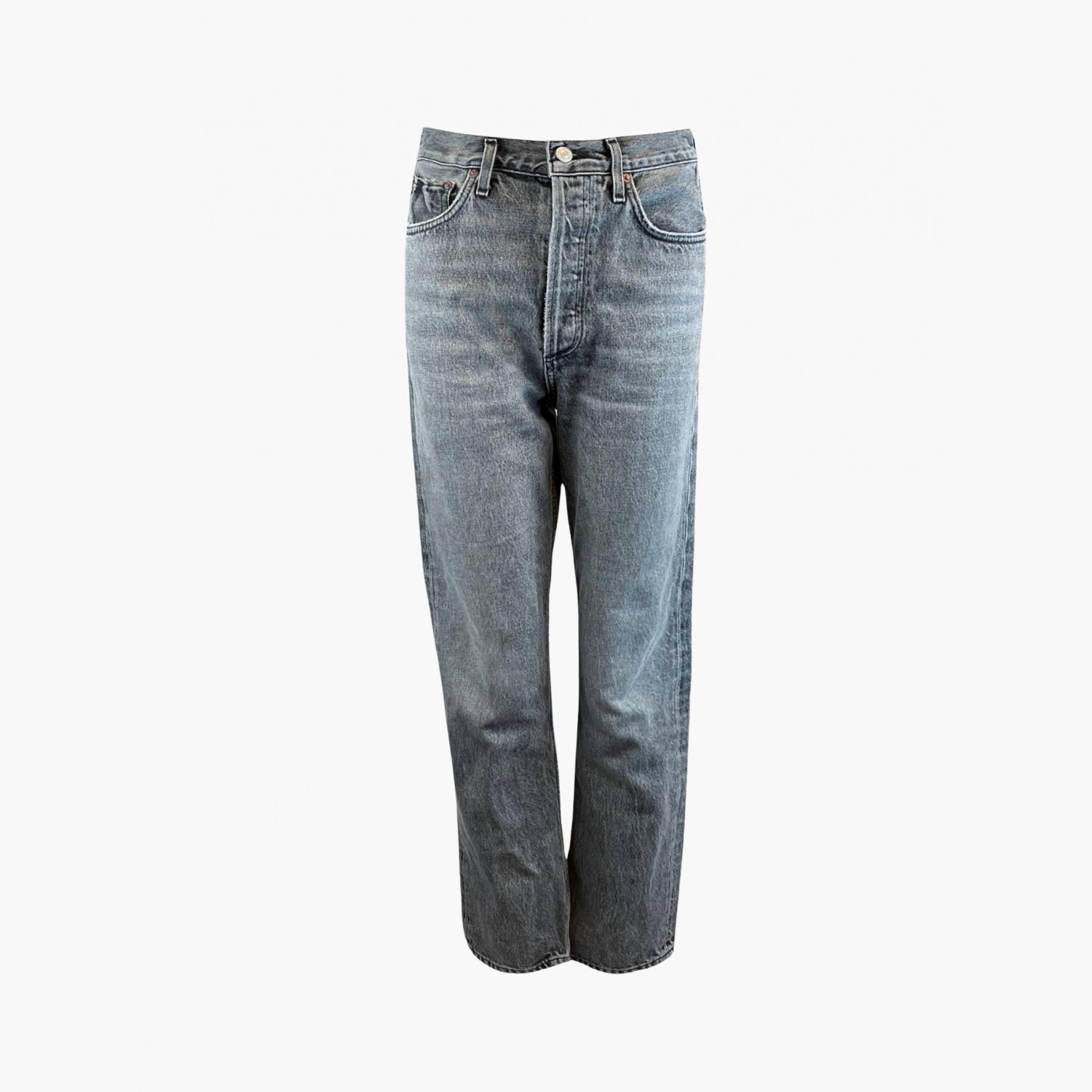 Серые прямые джинсы на высокой посадке, на пуговицах.В отличном состоянии, без значительных следов носки.