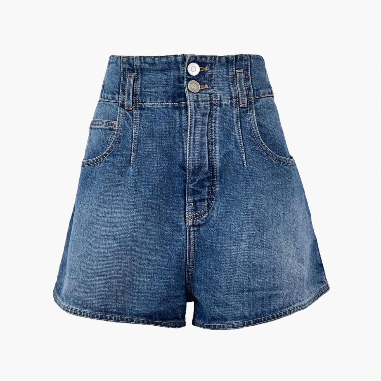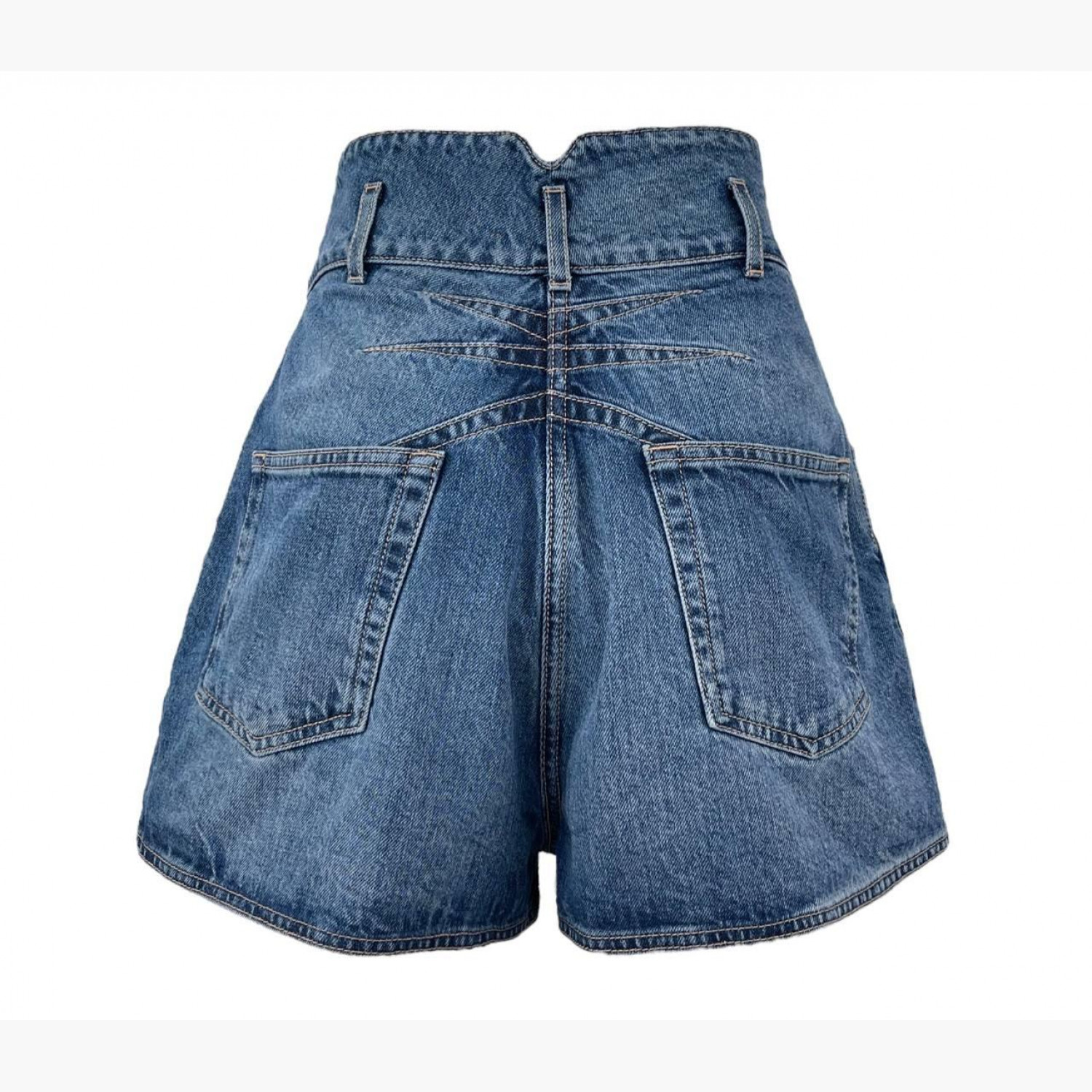 Синие джинсовые шорты на высокой талии. Состав: основной материал — 100% хлопок; подкладка — 35% хлопок, 65% полиэстер; кант — 35% хлопок, 65% полиэстер. В отличном состоянии, с изнаночной стороны полиняла краска.