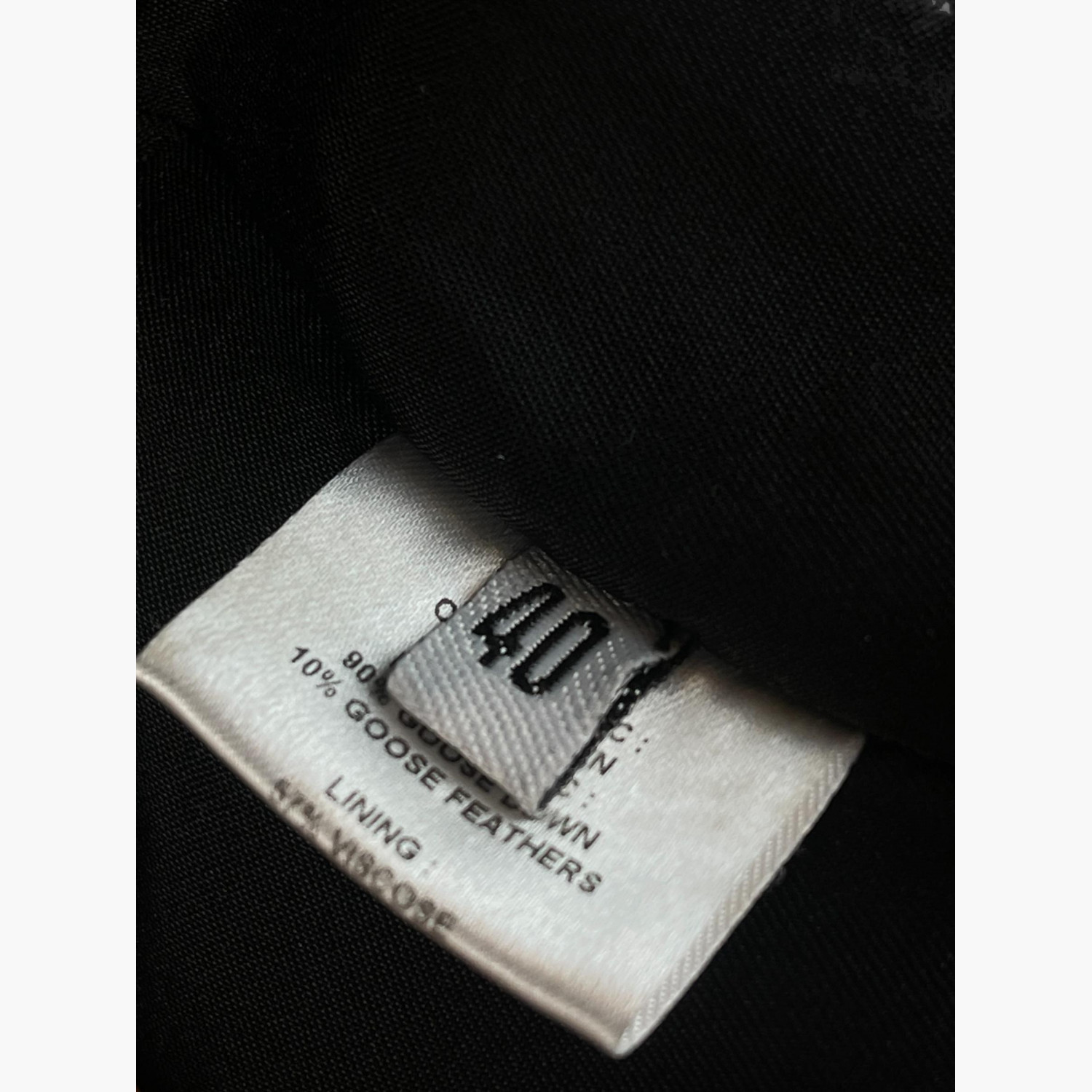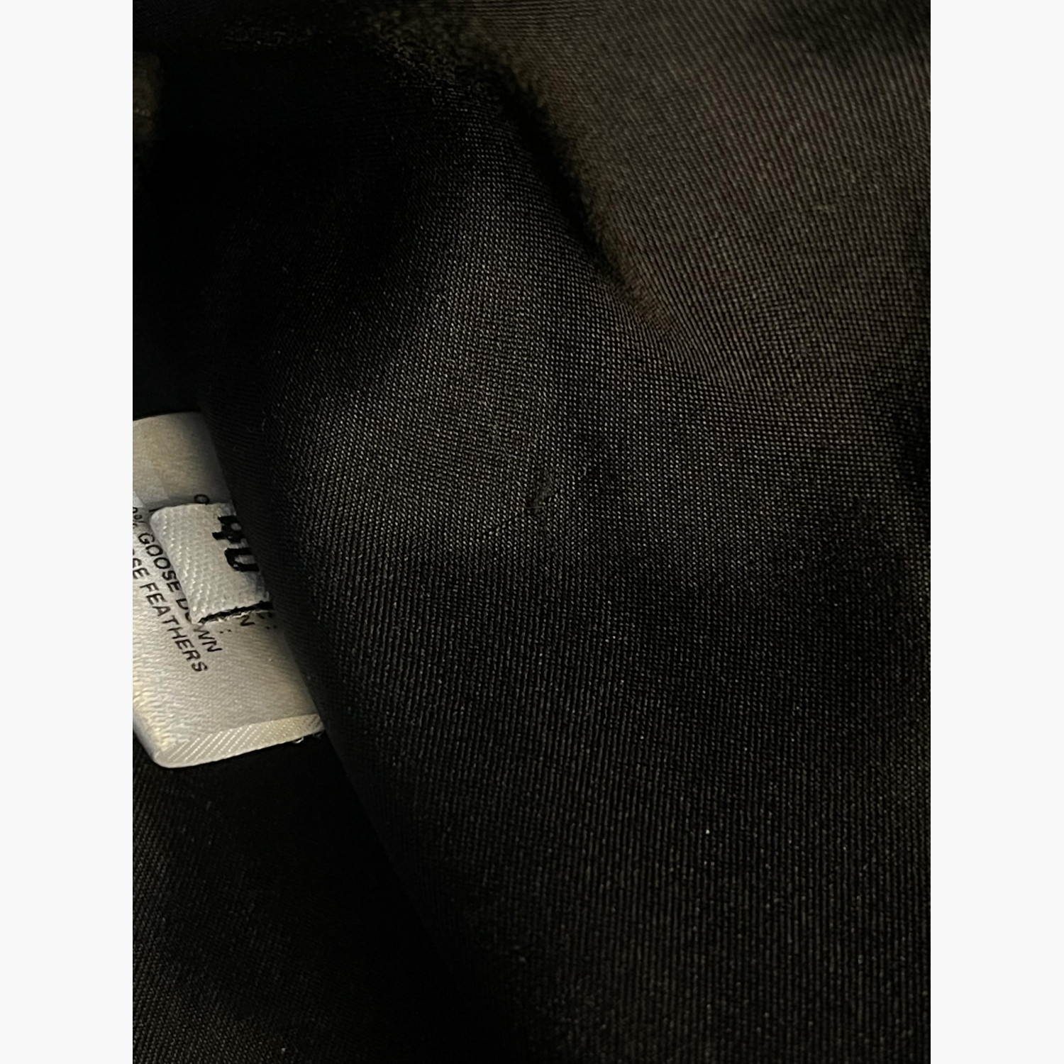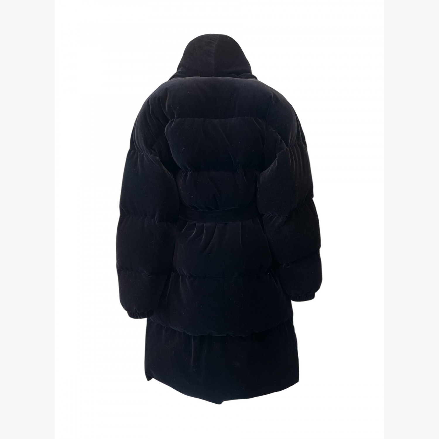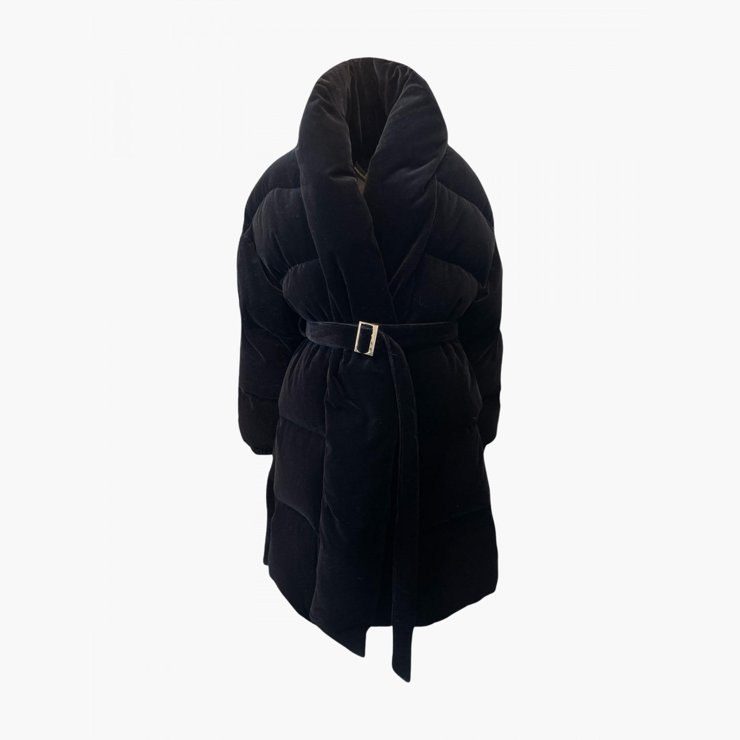 Чёрное объёмное пуховое пальто на поясе. Состав: основной материал — 100% хлопок; наполнение — 90% гусиный пух, 10% гусиное перо; подкладка — 57% вискоза, 43% эластан. В хорошем состоянии, есть зацепка на подкладке и прочие следы носки.