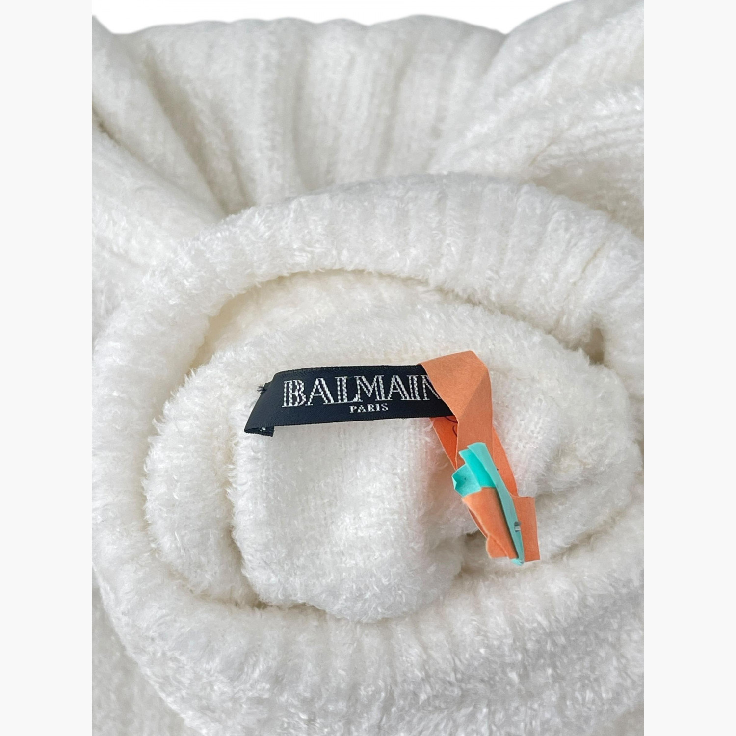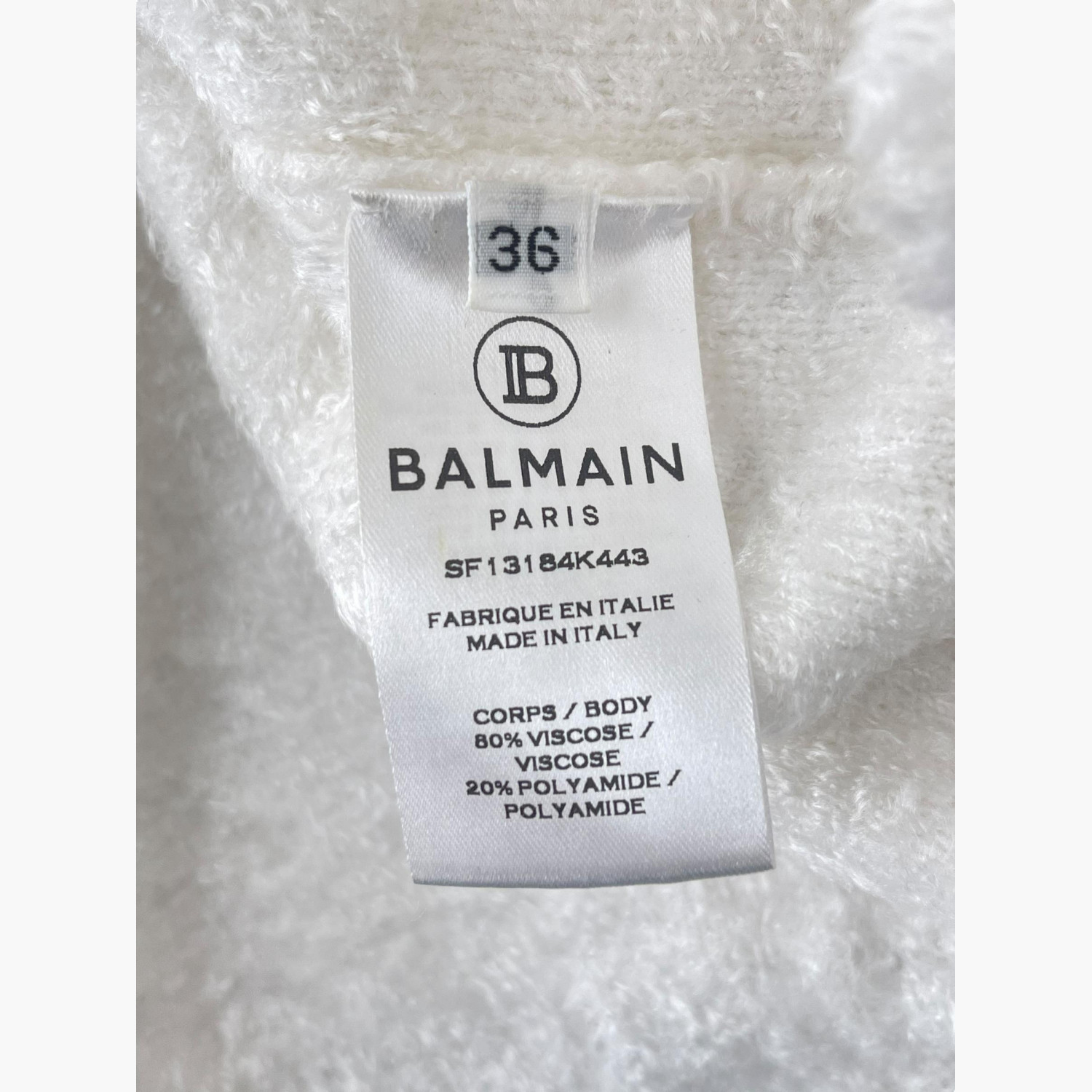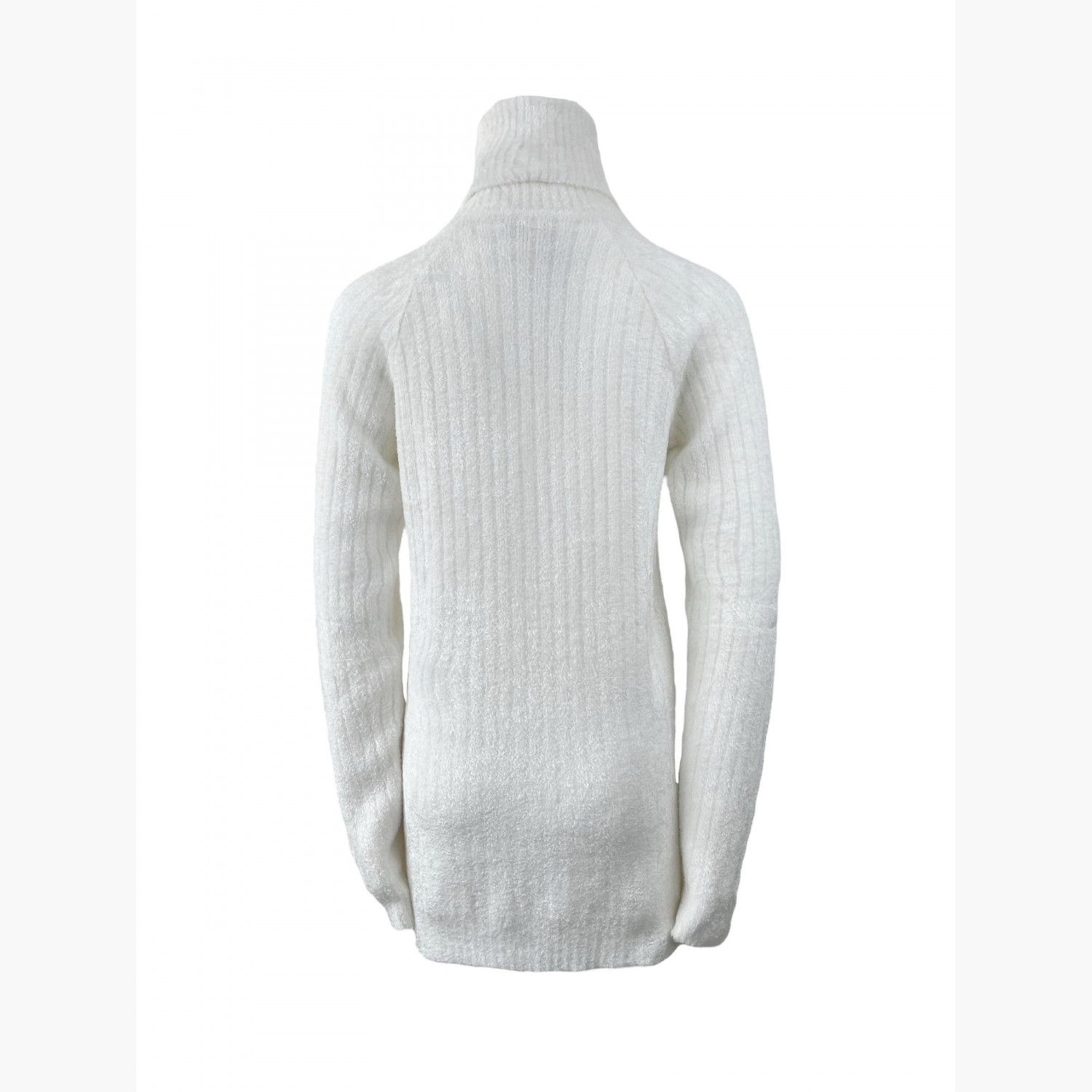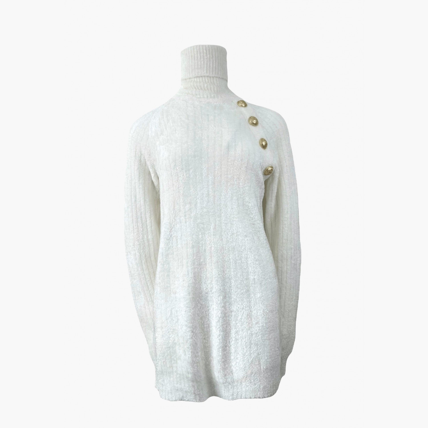 Белый свитер с высоким горлом и четырьмя пуговицами золотого цвета на левом плече. Состав — 80% вискоза, 20% полиамид. В отличном состоянии, без следов носки.
