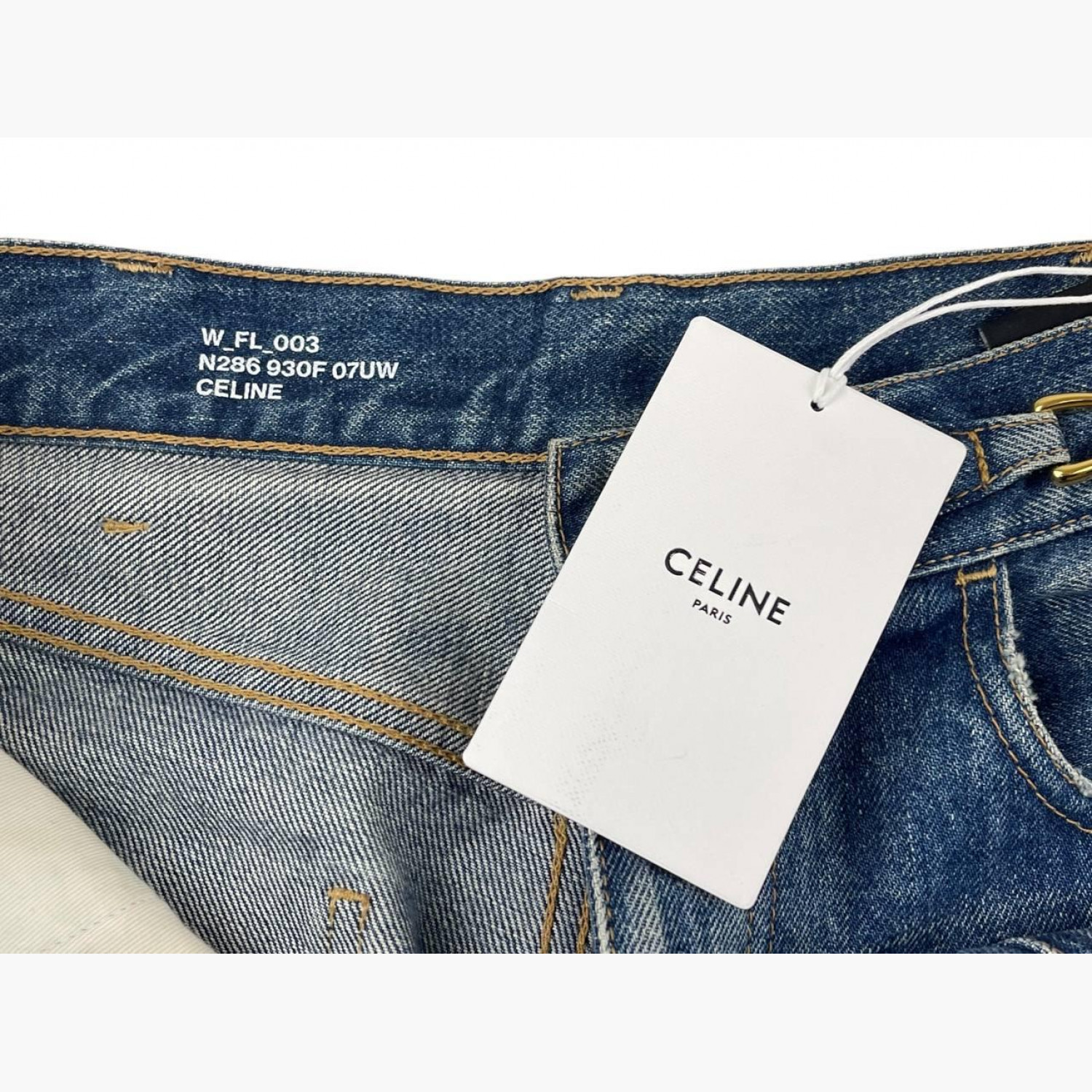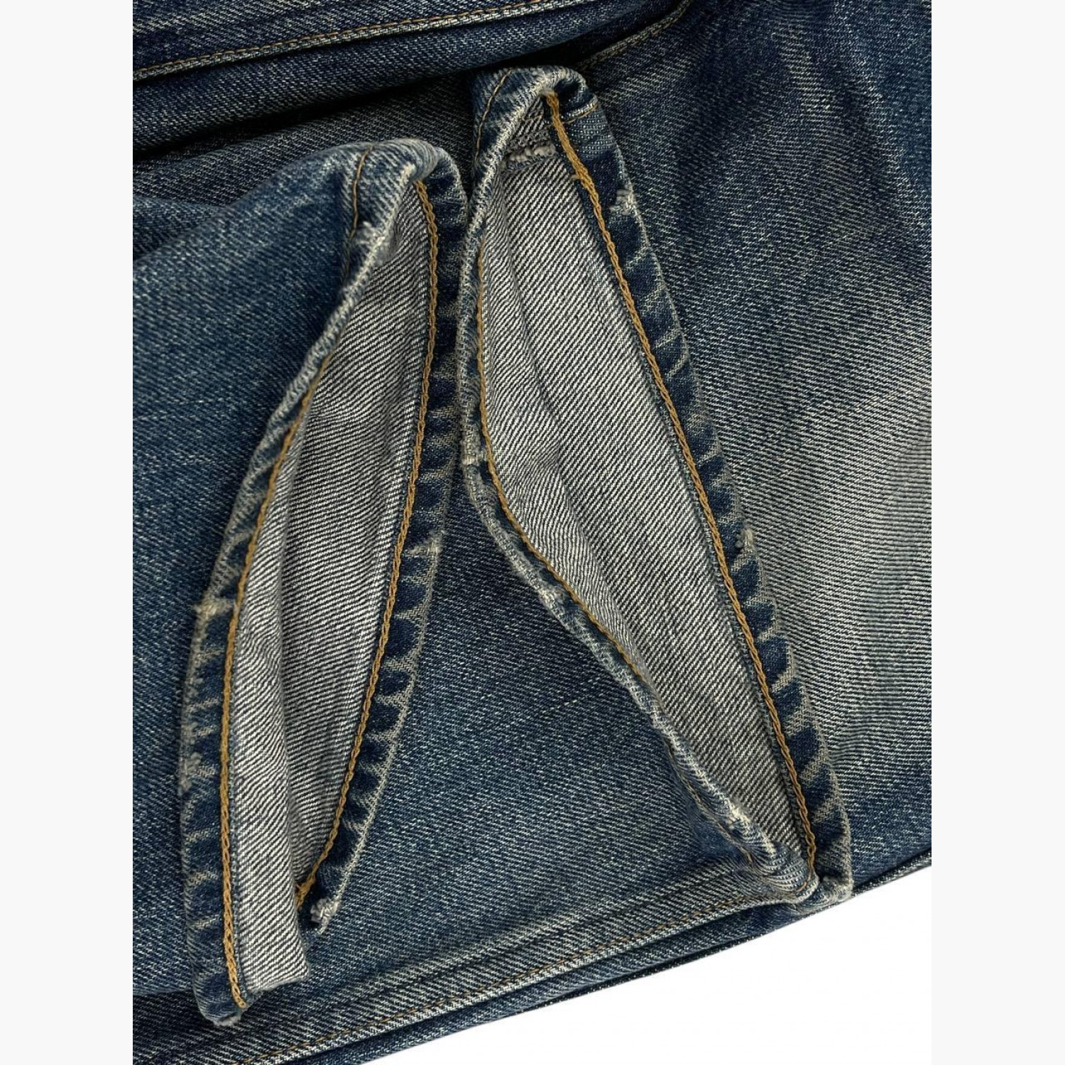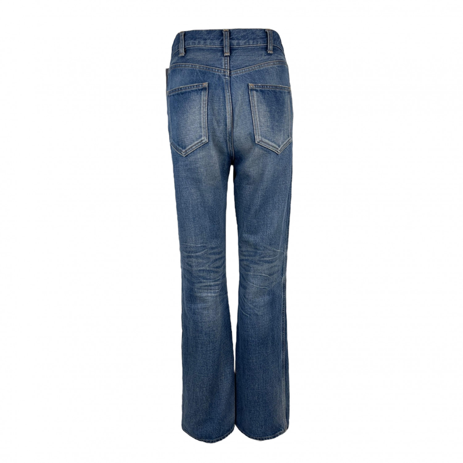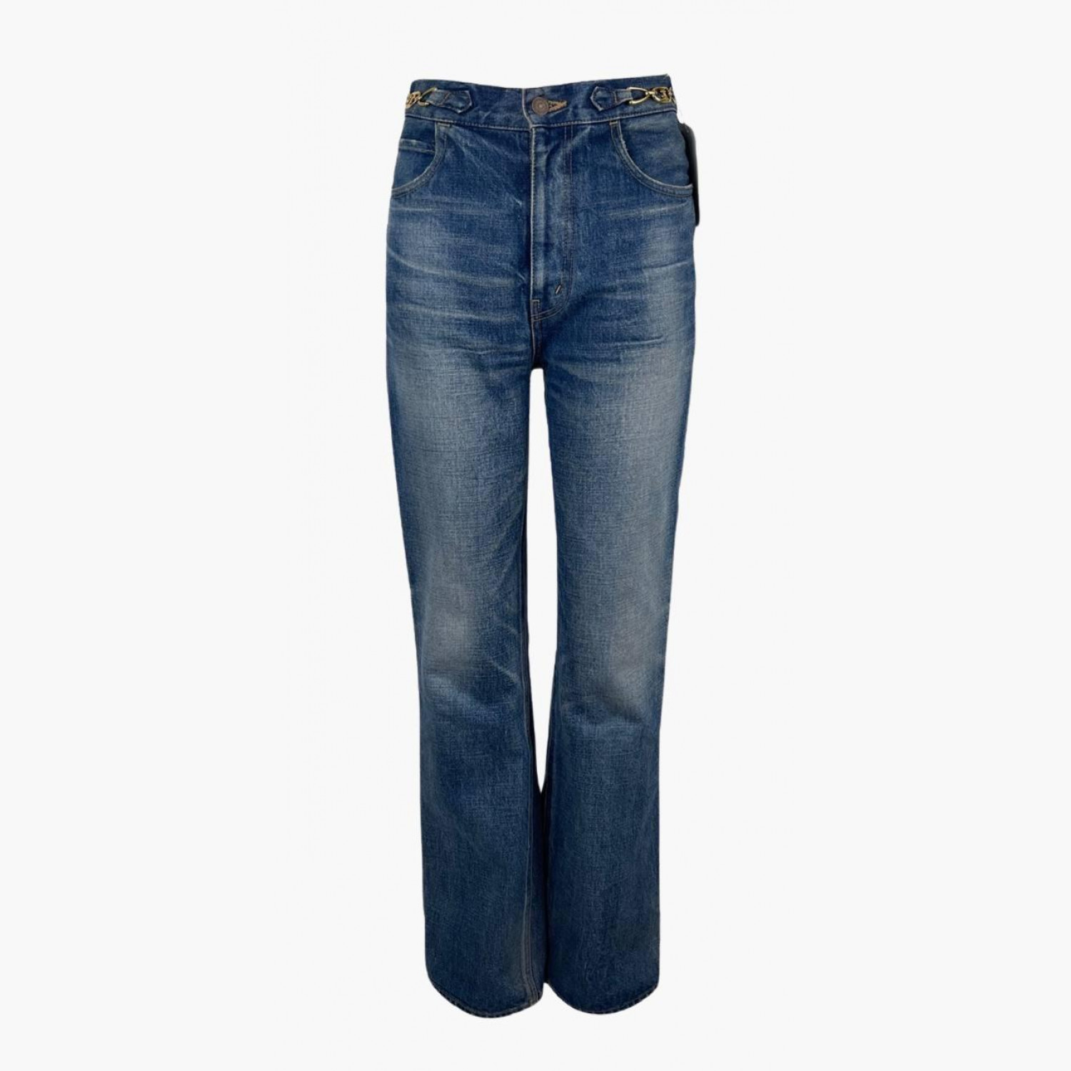 Синие джинсы с потертостями и декоративной фурнитурой золотого цвета на поясе, с биркой. В хорошем состоянии, имеются пятна.