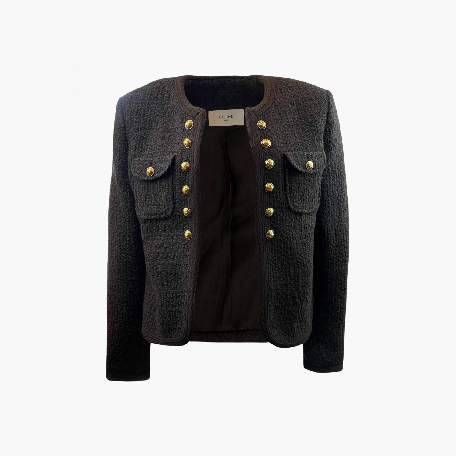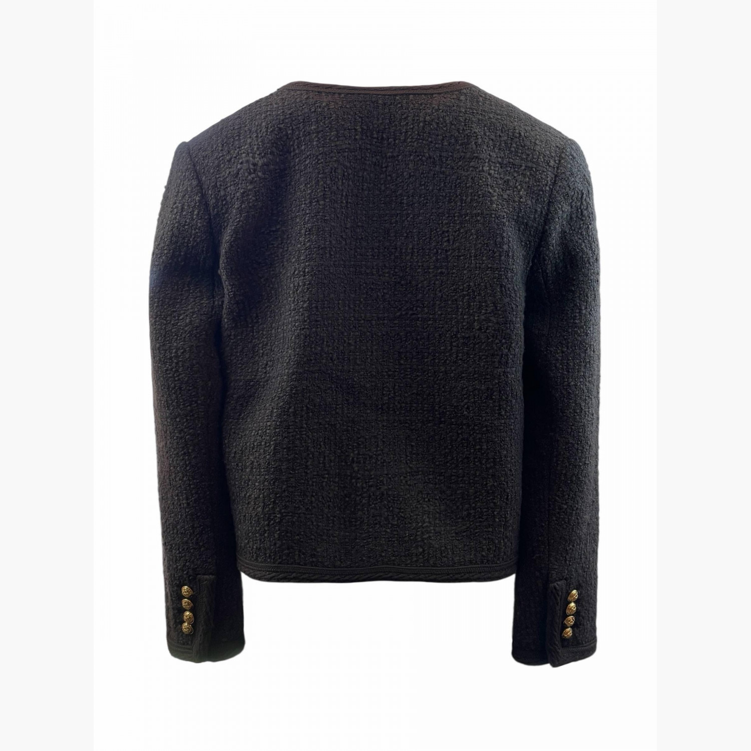 Тёмно-коричневый жакет с золотыми пуговицами.Состав: основной материал — 78% шерсть, 13% хлопок, 9% полиамид; подкладка — 50% модал, 50% вискоза.Абсолютно новый, с биркой.