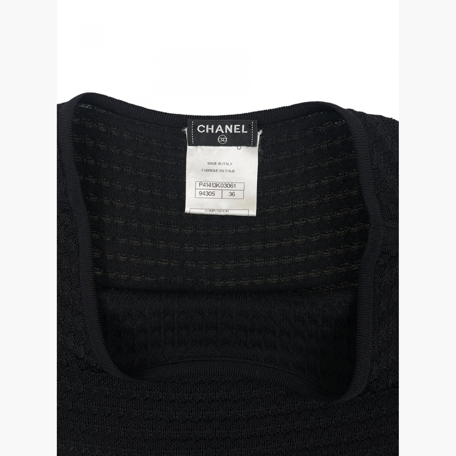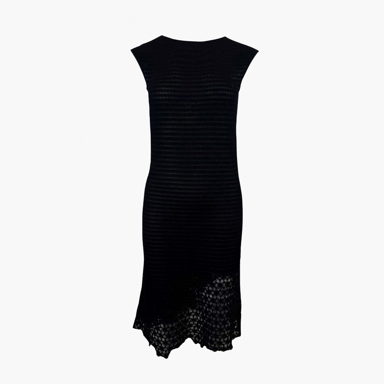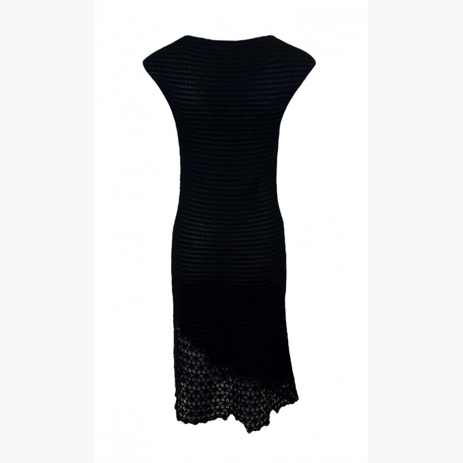 Чёрное трикотажное платье с короткими рукавами и кружевной вставкой. Состав: основной материал — 66% вискоза, 20% хлопок, 14% полиамид; вставка — 83% хлопок, 17% полиэстер. В отличном состоянии, без следов носки.