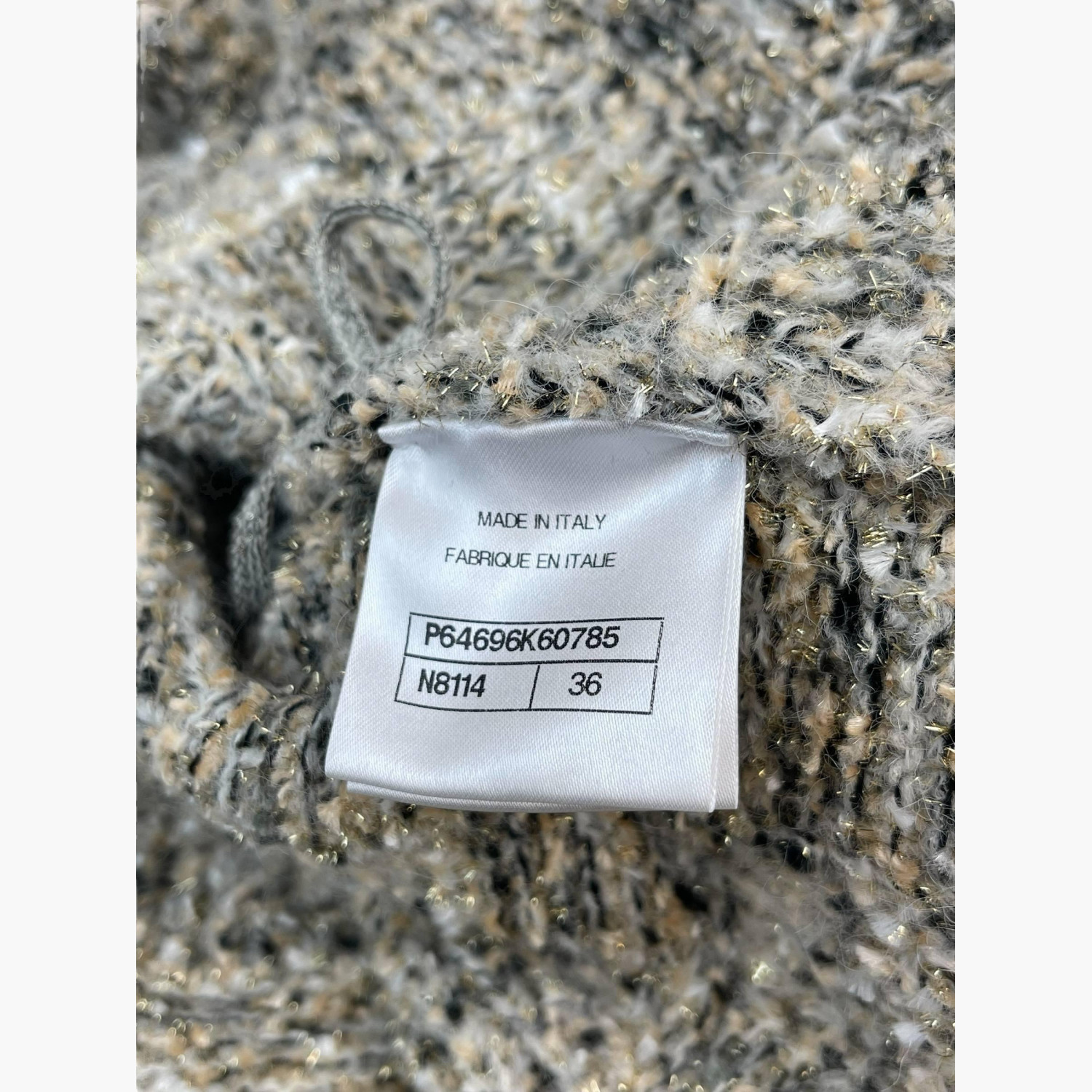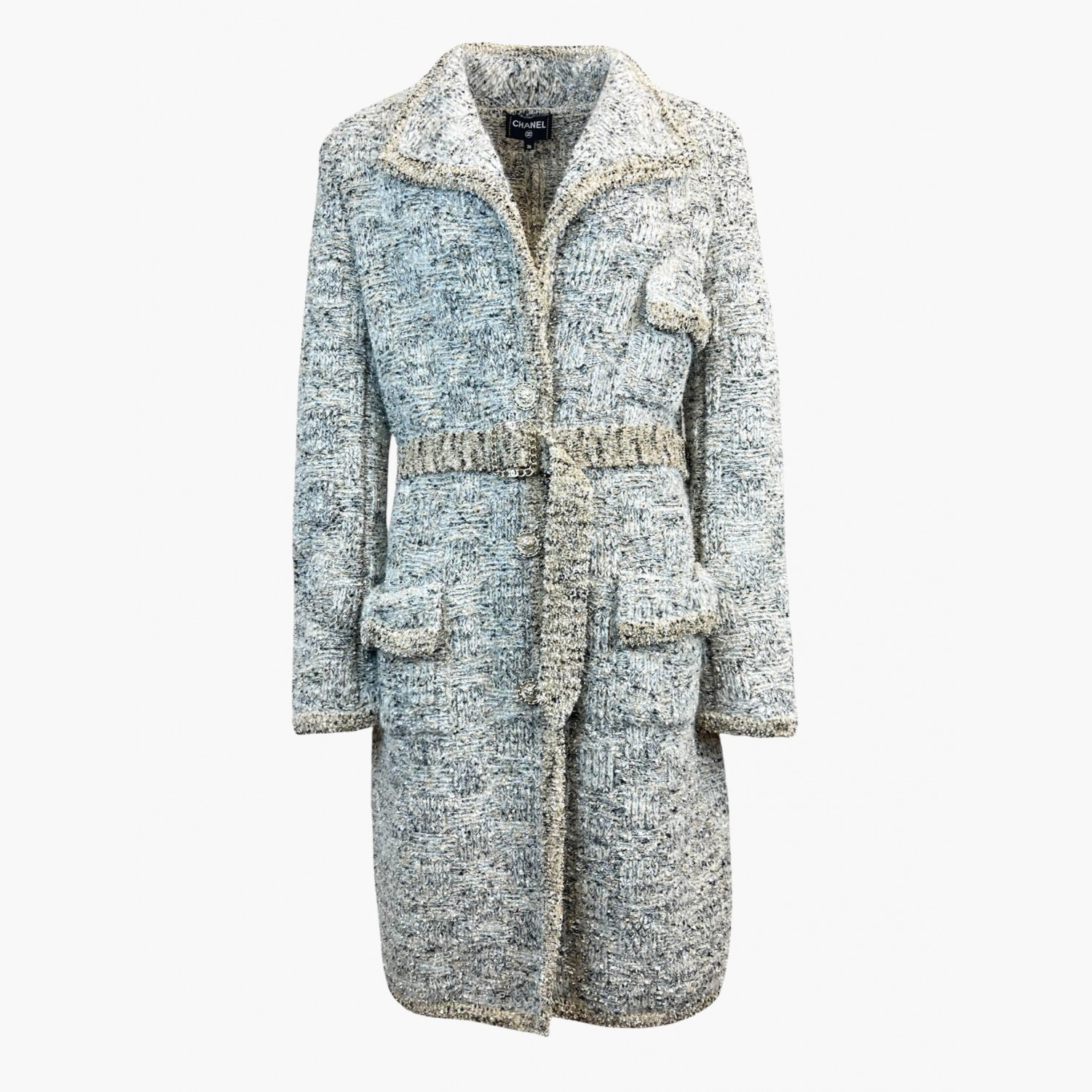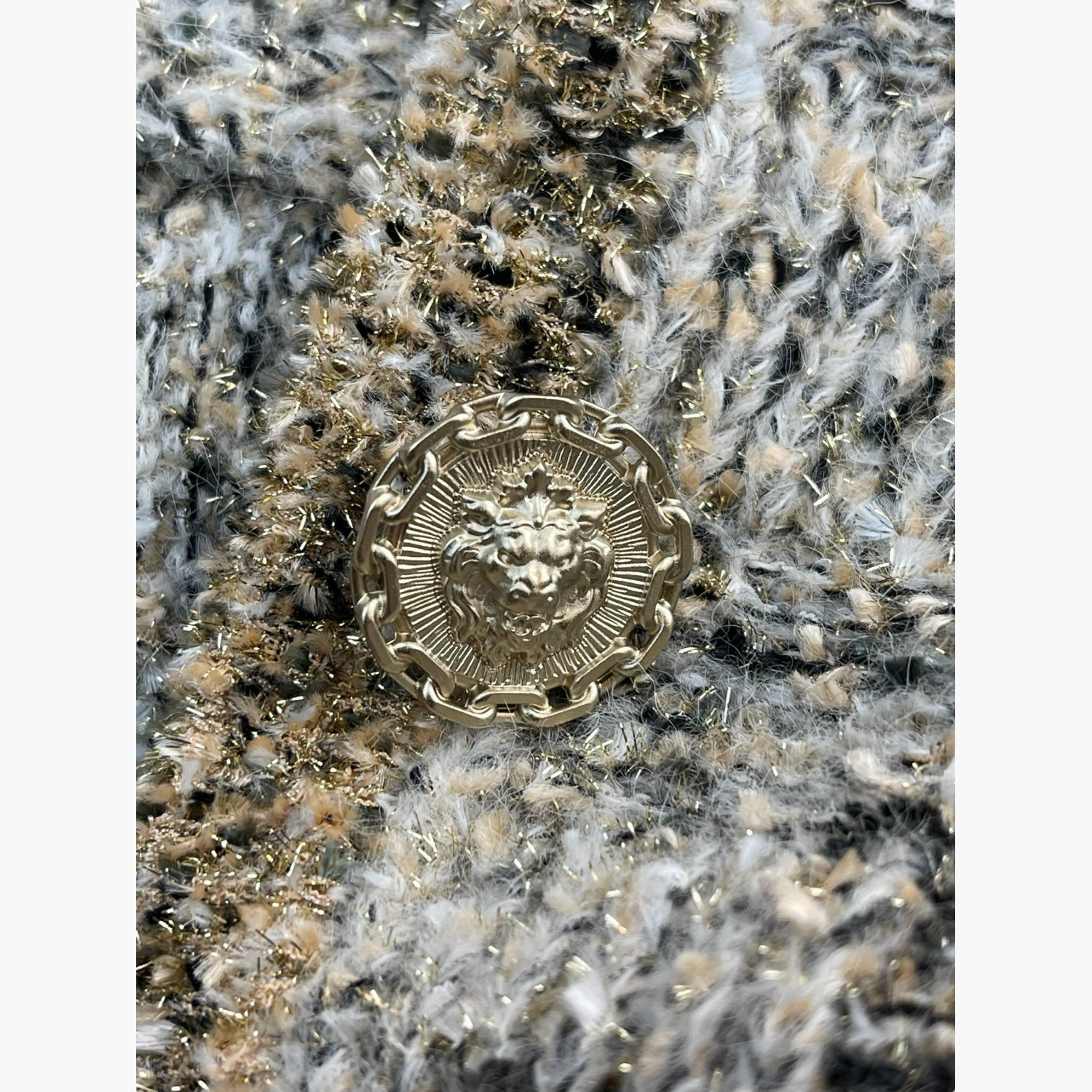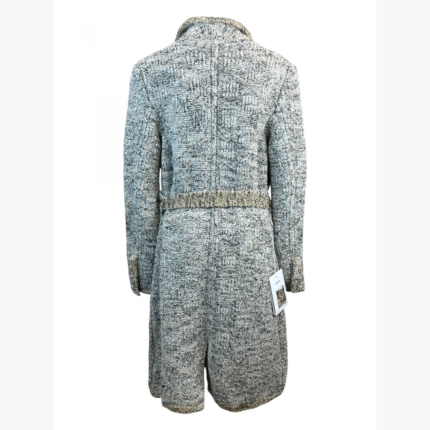 Шерстяное пальто с золотой нитью на пуговицах и поясе. К пальто прилагаются фирменный кофр и вешалка. Состав: основной материал — 32% полиэстер, 26% альпака, 22% полиамид, 17% шерсть, 3% металлизированный полиэстер; отделка — 67% полиэстер, 25% полиамид, 6% металлизированный полиэстер, 2% альпака. Абсолютно новое, с биркой.