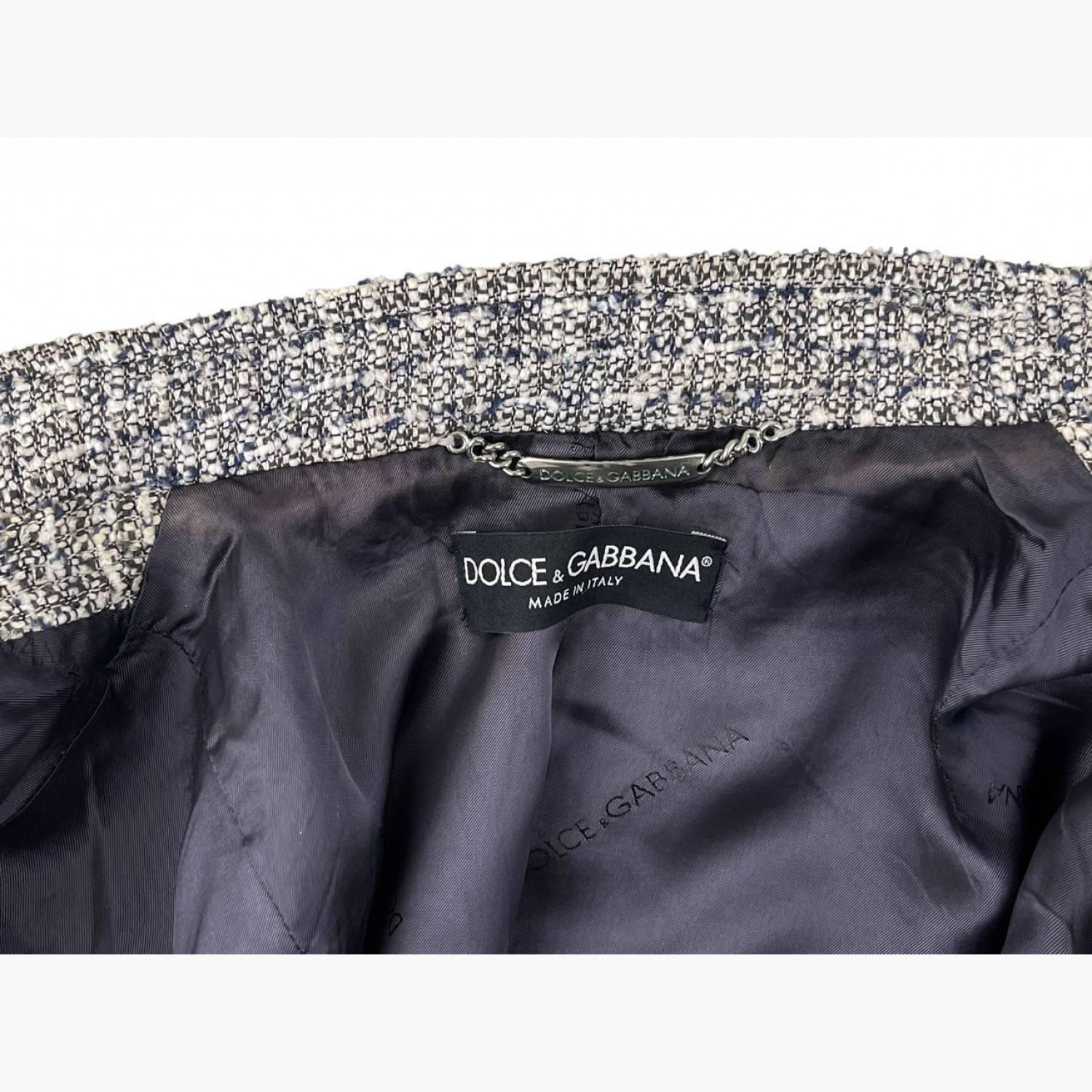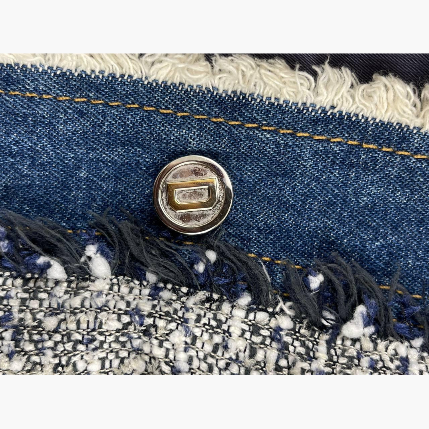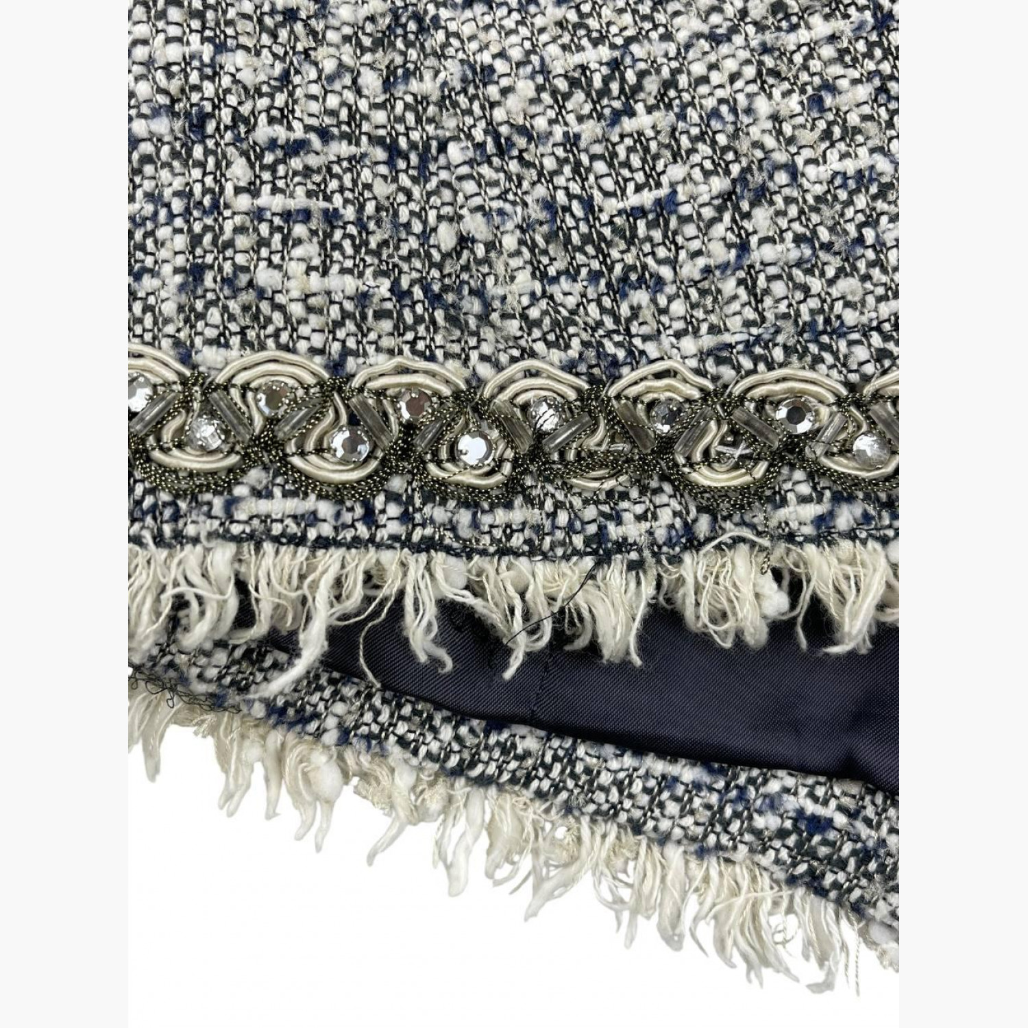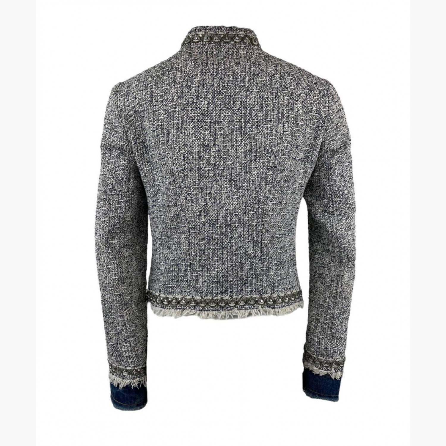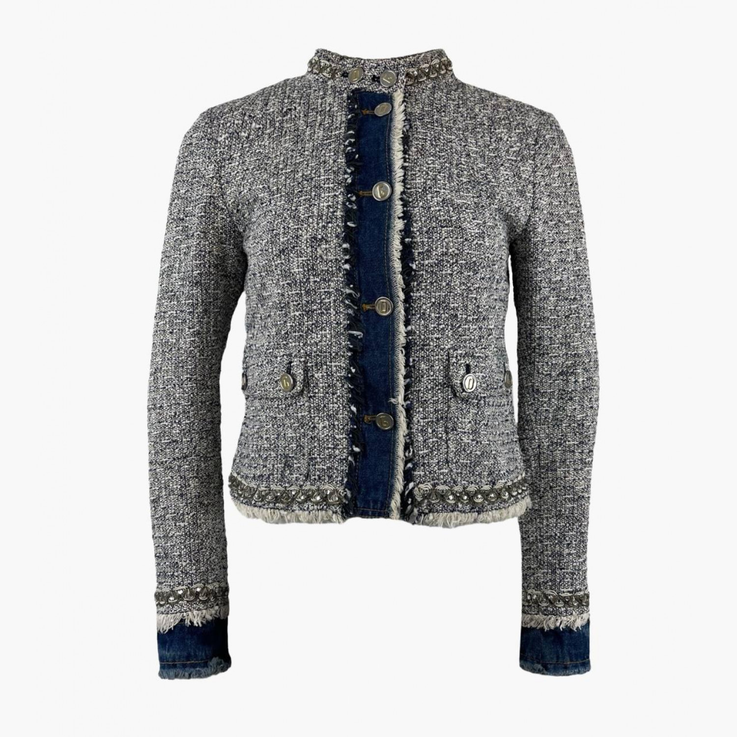 Чёрный твидовый жакет с джинсовой планкой и манжетами. Состав: основная ткань — 60% хлопок, 21% полиамид, 19% полиэстер; подкладка — 65% вискоза, 35% купро. В хорошем состоянии, есть следы носки.