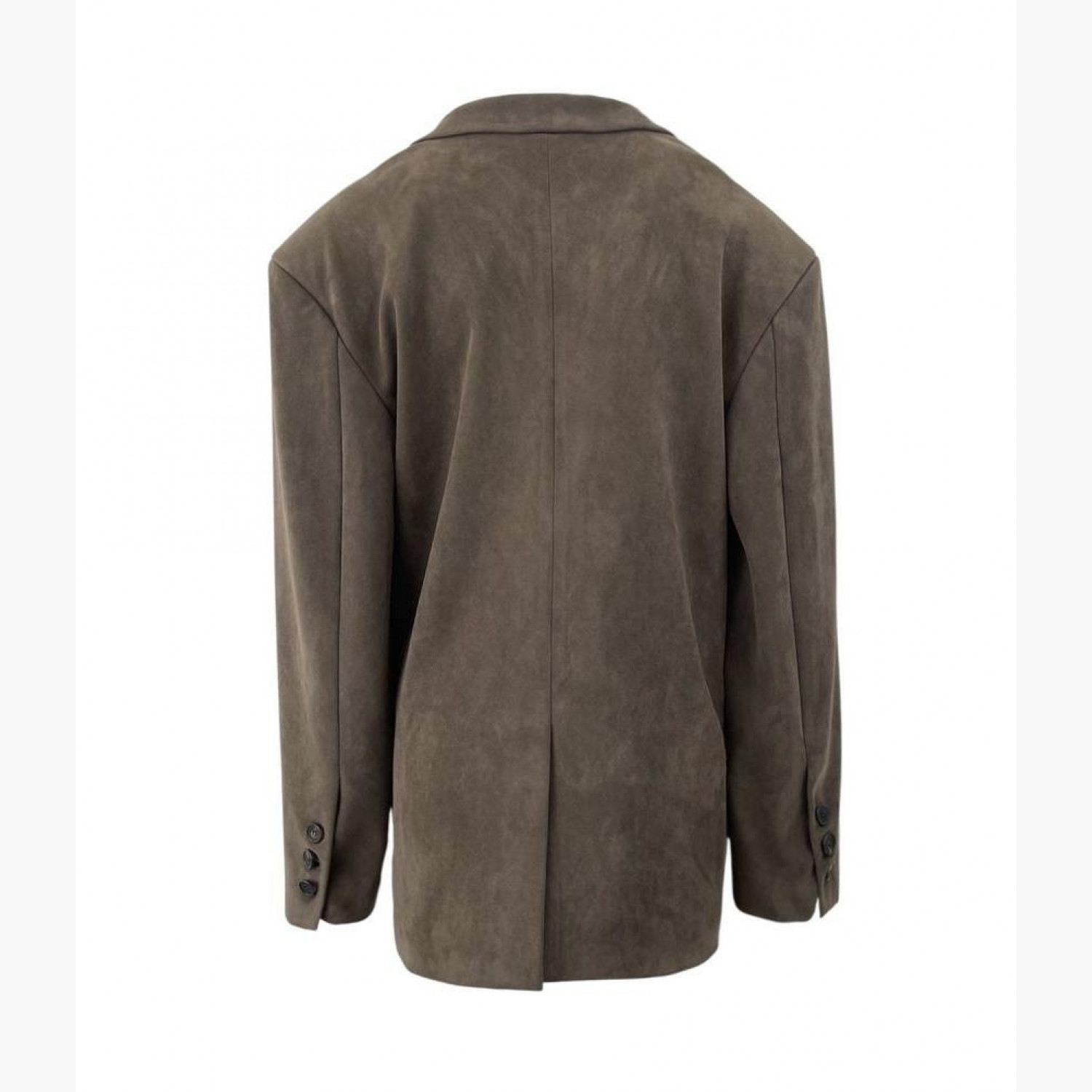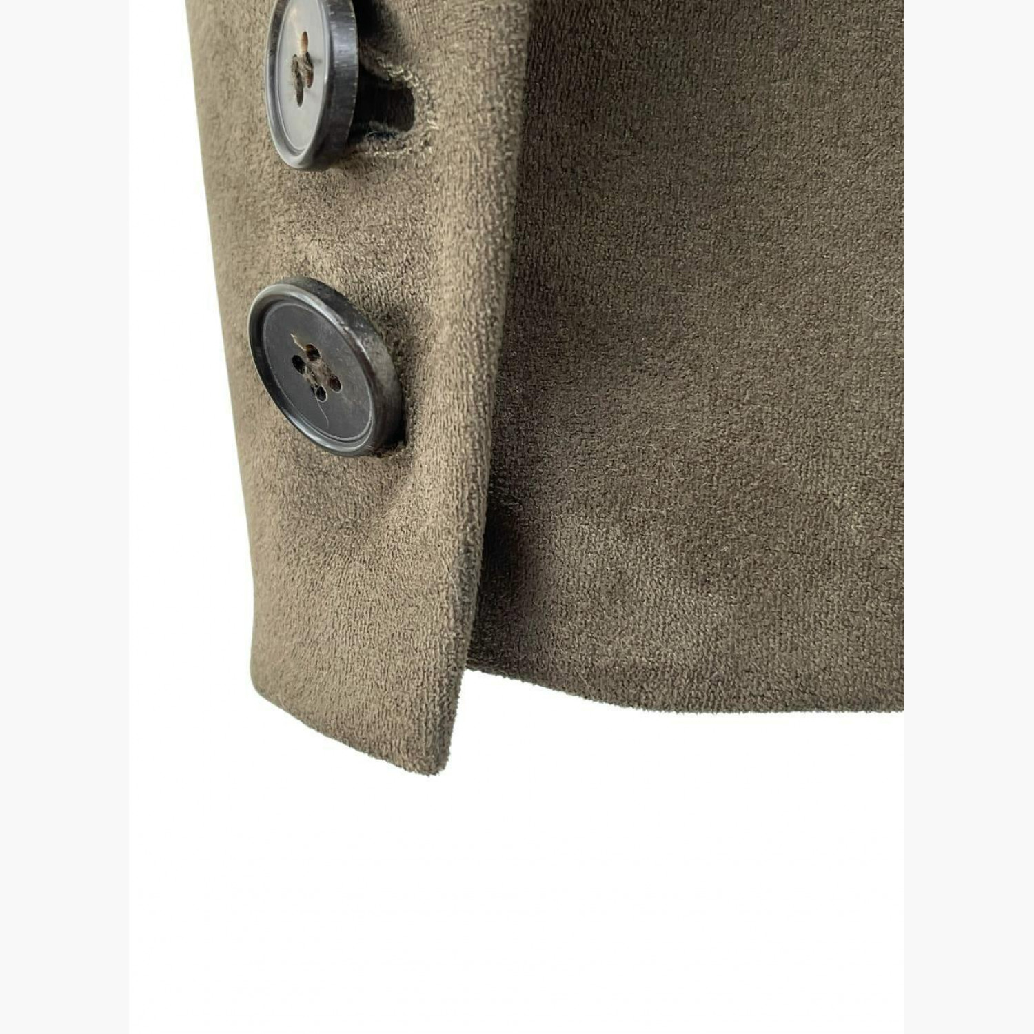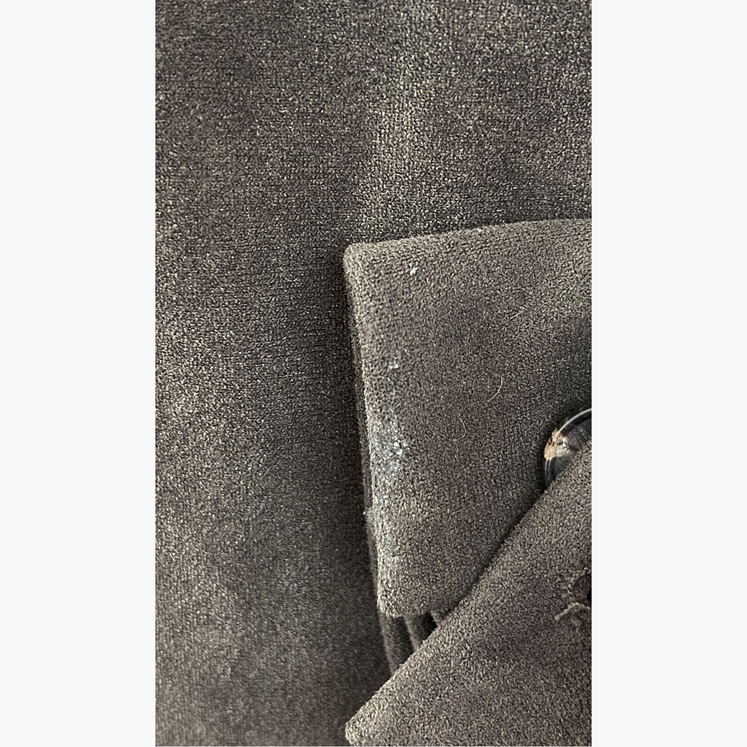 Графитовый жакет из замши на двух пуговицах. Состав: 80% полиэстер, 20% эластан. В хорошем состоянии, есть следы носки.
