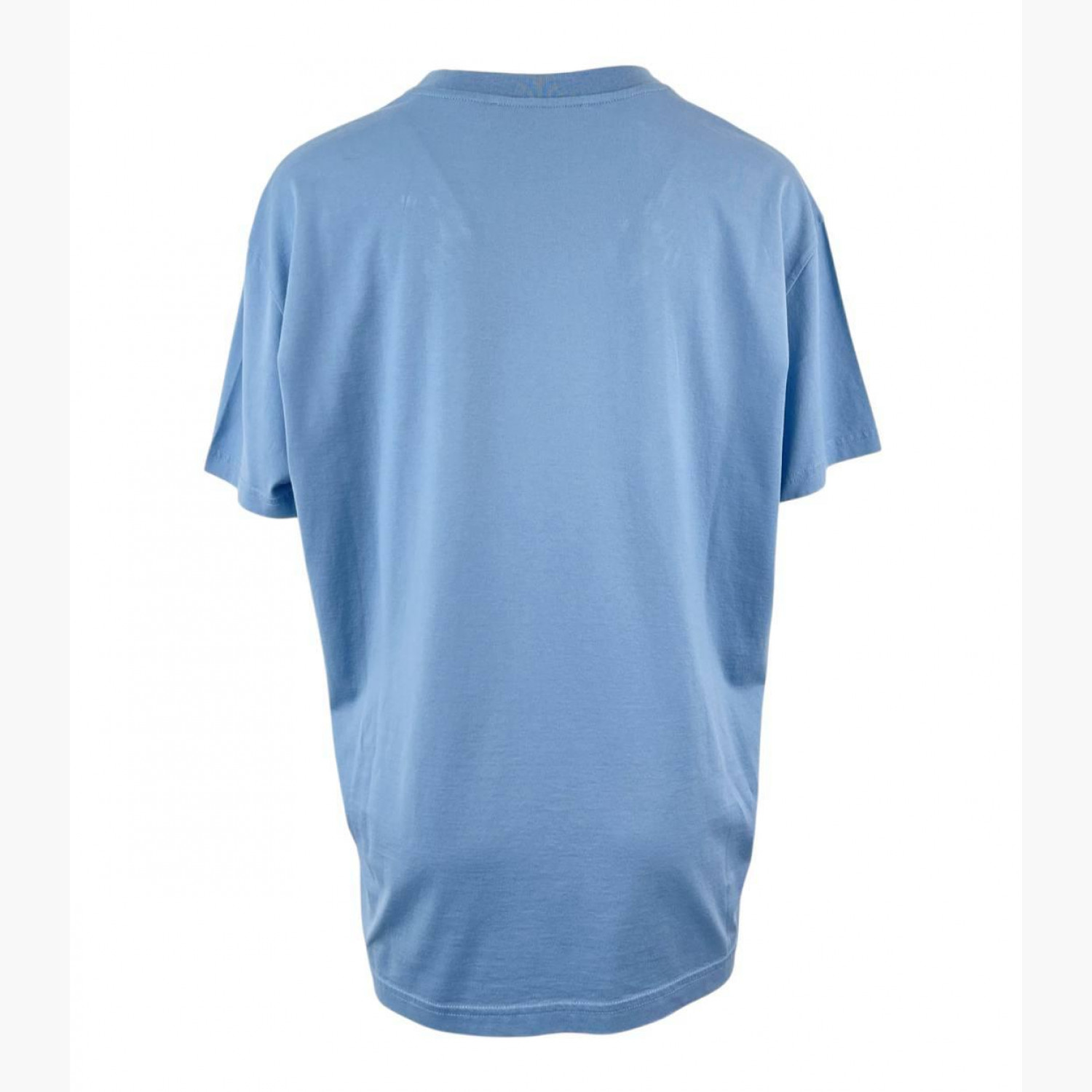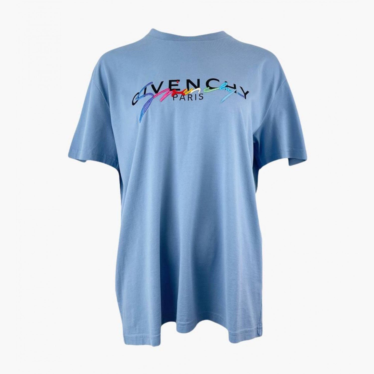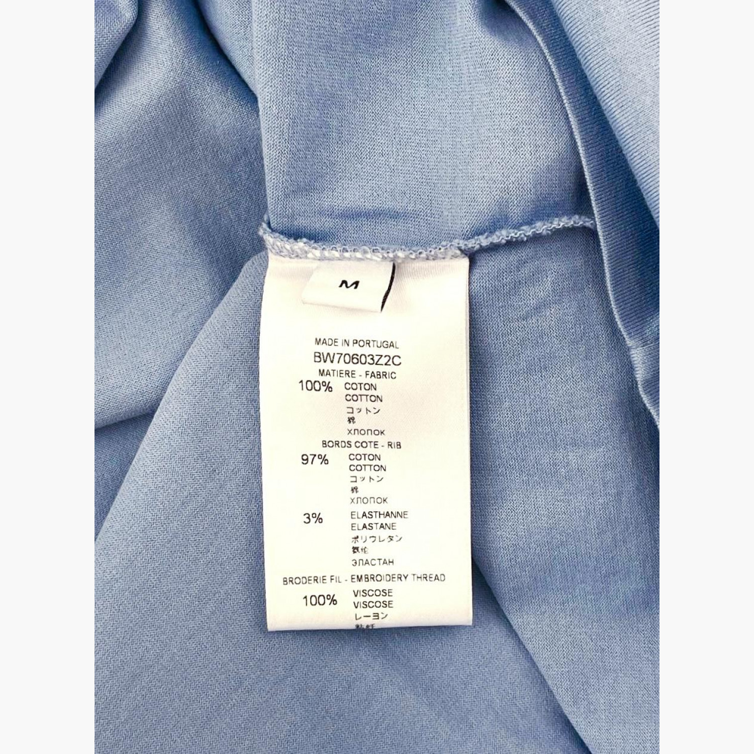 Голубая футболка с вышивкой логотипа. Состав: основной материал — 100% хлопок; кайма — 97% хлопок, 3% эластан; вышитый логотип — 100% вискоза. В хорошем состоянии, есть незначительные следы носки.