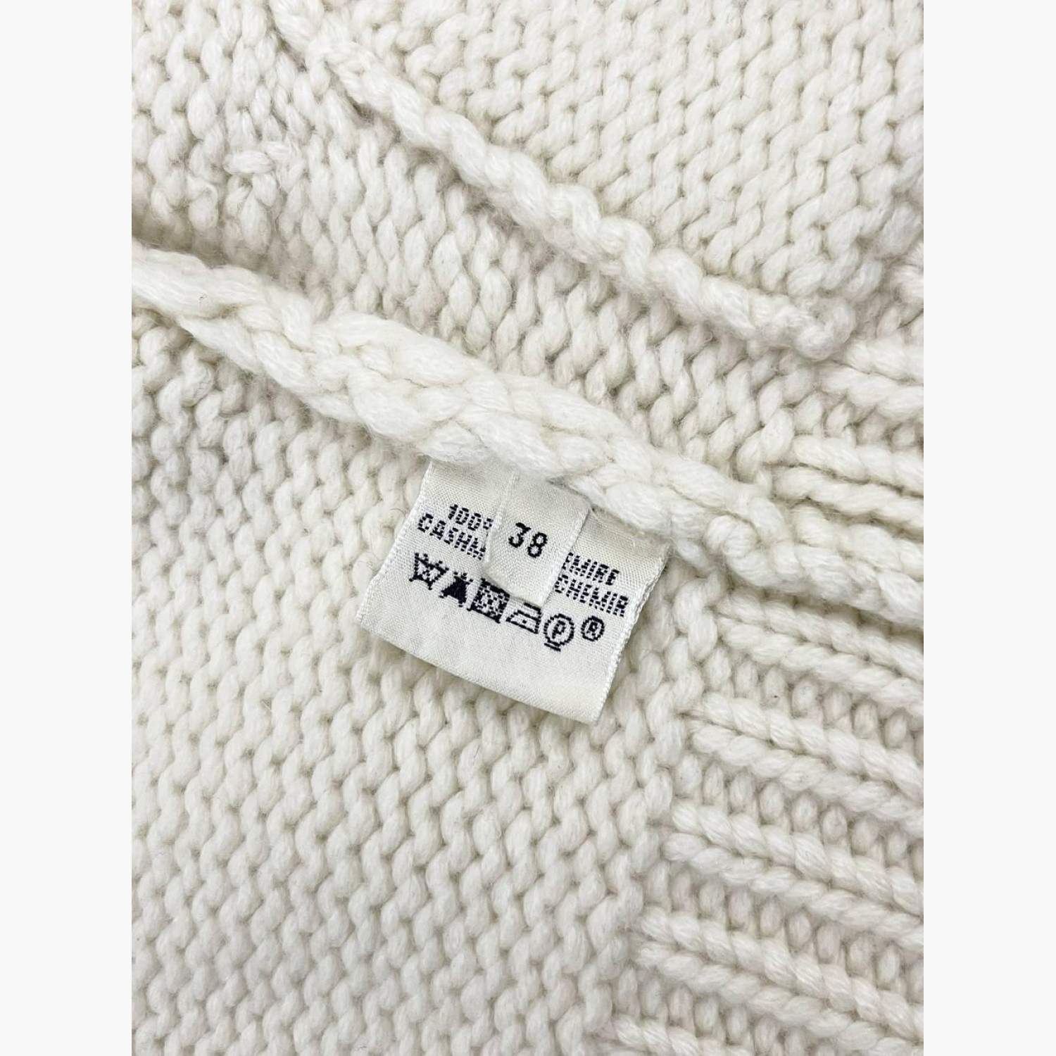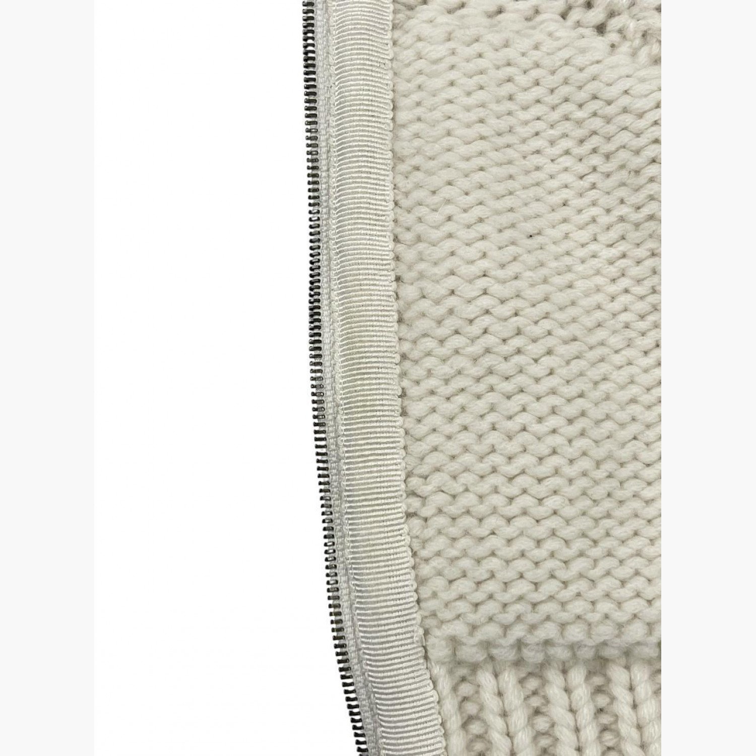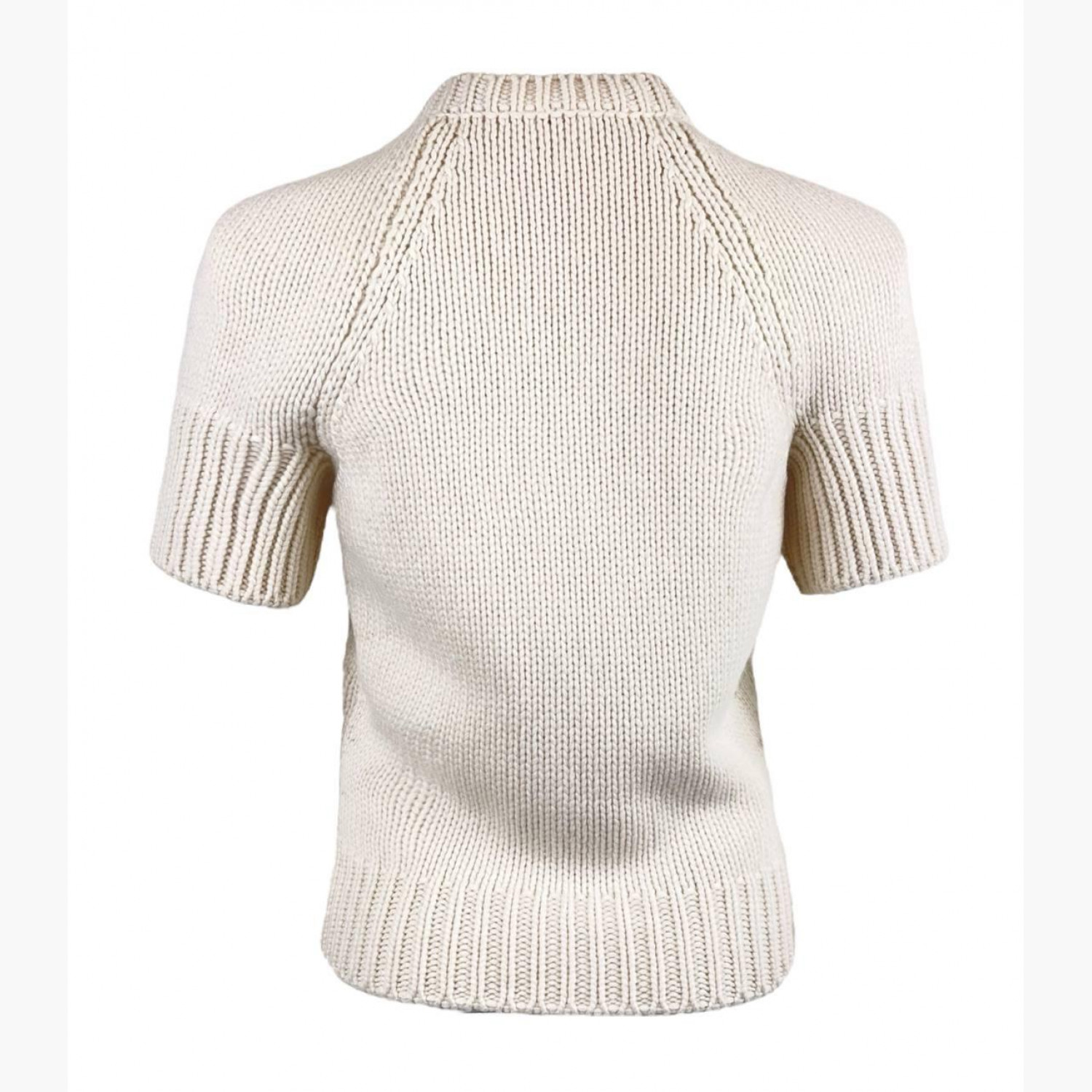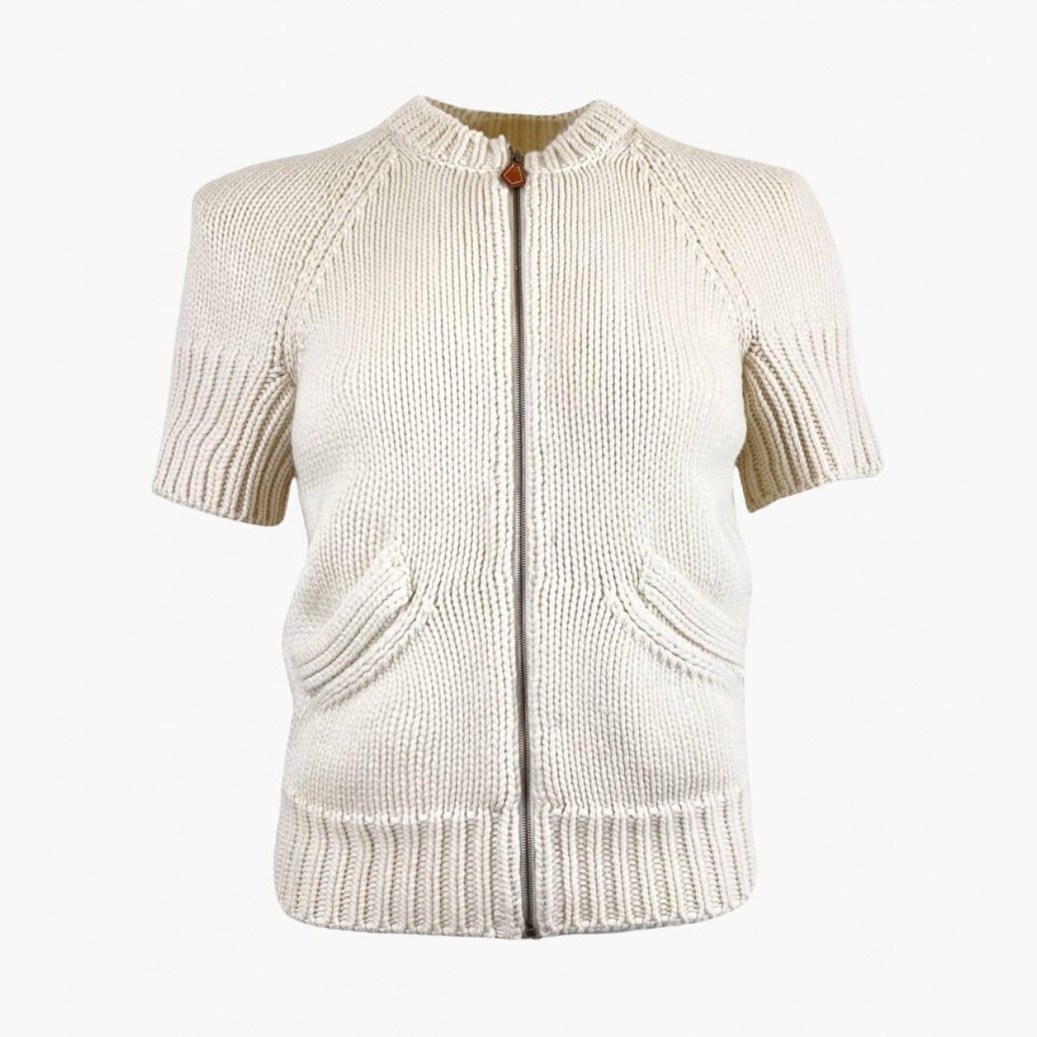 Вязаный свитер молочного цвета с короткими рукавами, молнией и подплечниками. В отличном состоянии, есть едва заметные пятна.