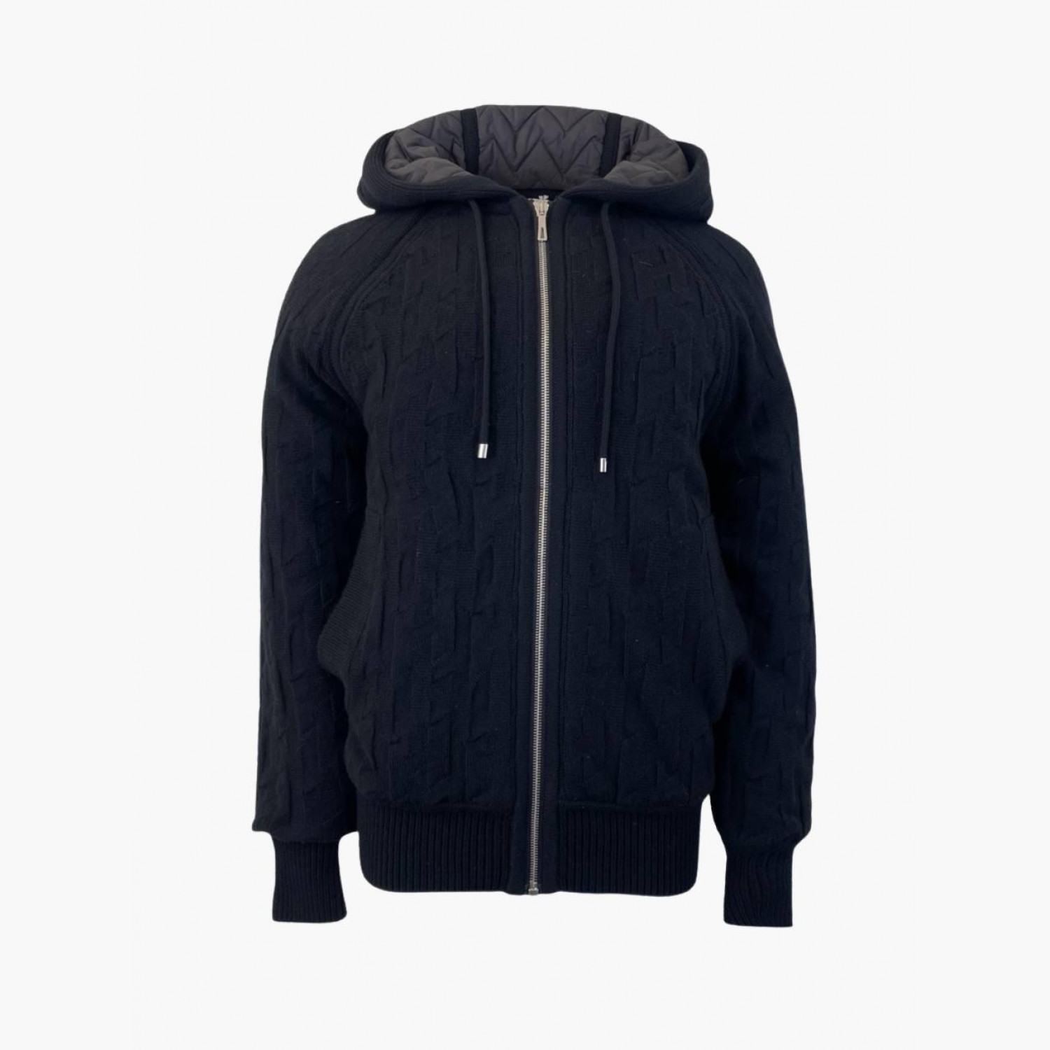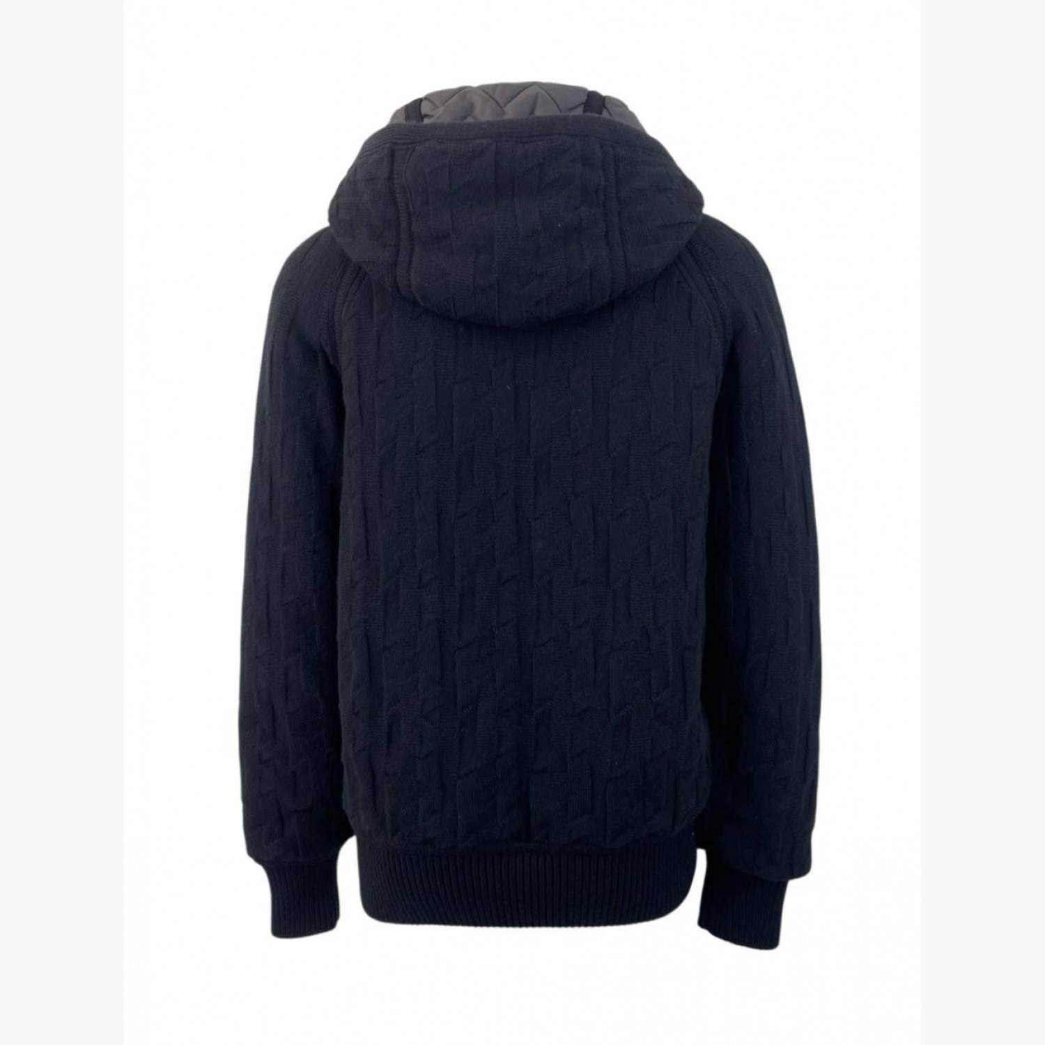 Темно-синяя шерстяная куртка на молнии с капюшоном. Состав: основной материал — 100% шерсть; подкладка — 100% полиэстер; наполнение — 90% белый утиный пух, 10% утиные перья. В комплекте идет кофр. Абсолютно новая, с биркой.