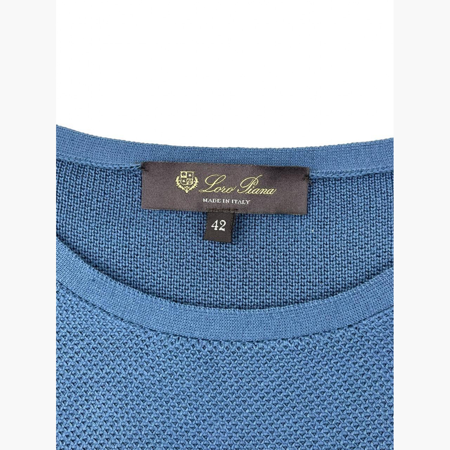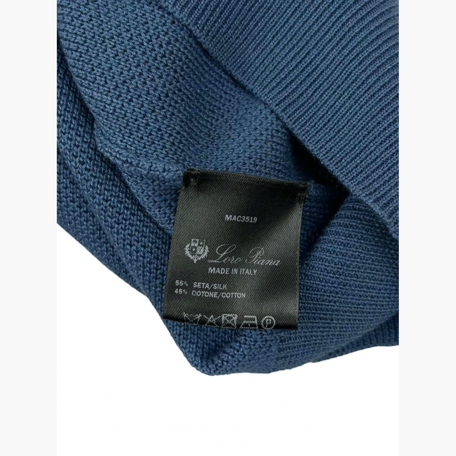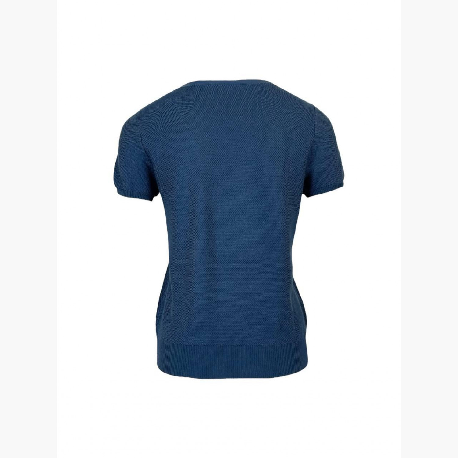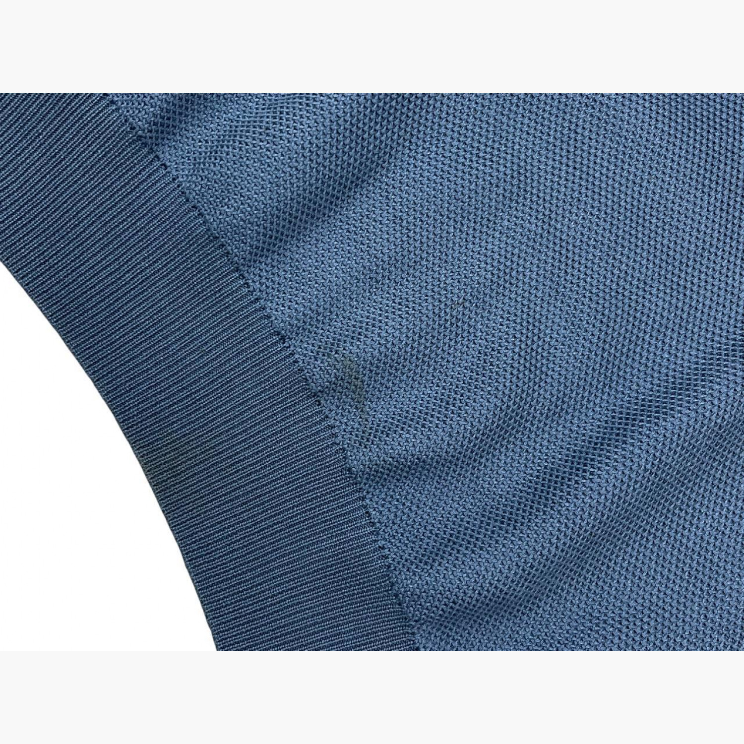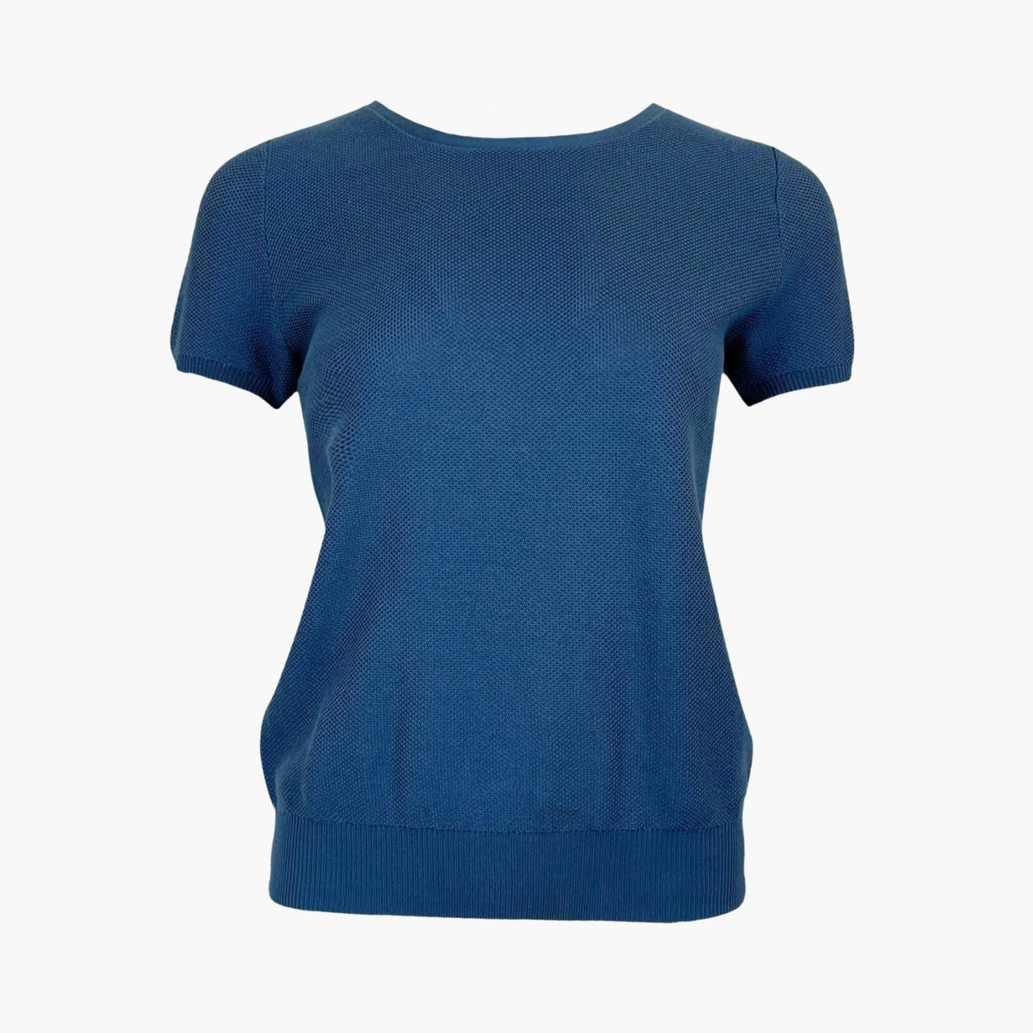 Синяя трикотажная футболка мелкого плетения. Состав: 55% шелк, 45% хлопок. В хорошем состоянии, имеются пятна.