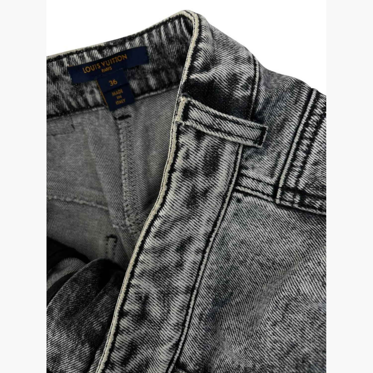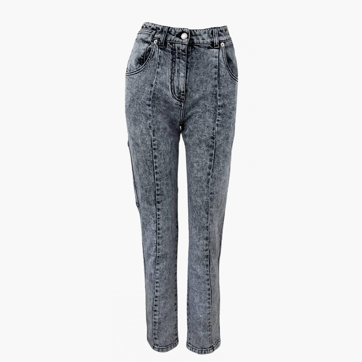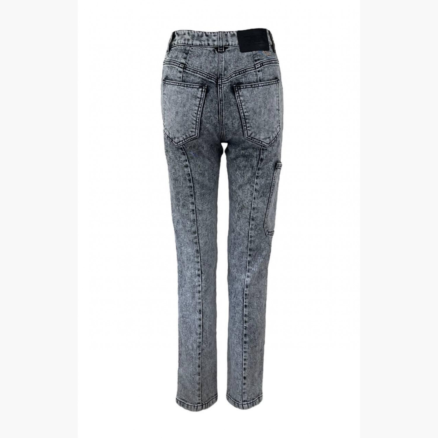 Серые зауженные джинсы, посередине строчка и маленький карман сбоку штанины. Состав: основная ткань — 98% хлопок, 2% эластан; подкладка — 100% хлопок; остальное — 50% полиэстер, 50% полиуретан. В хорошем состоянии, есть следы носки.