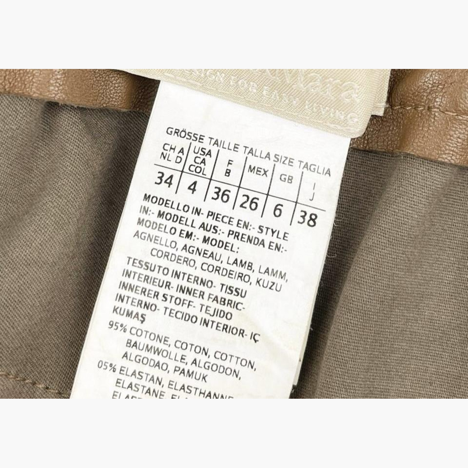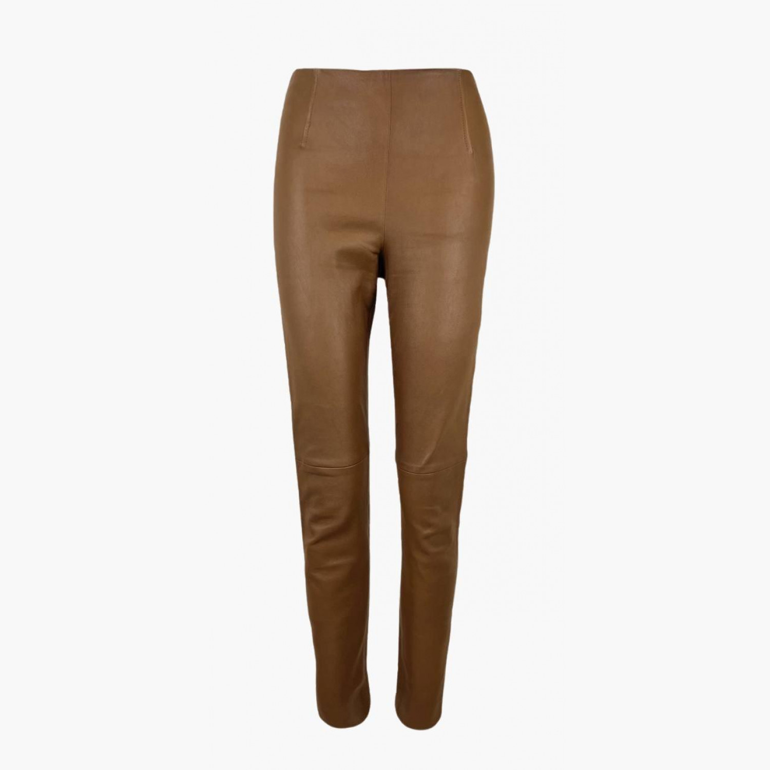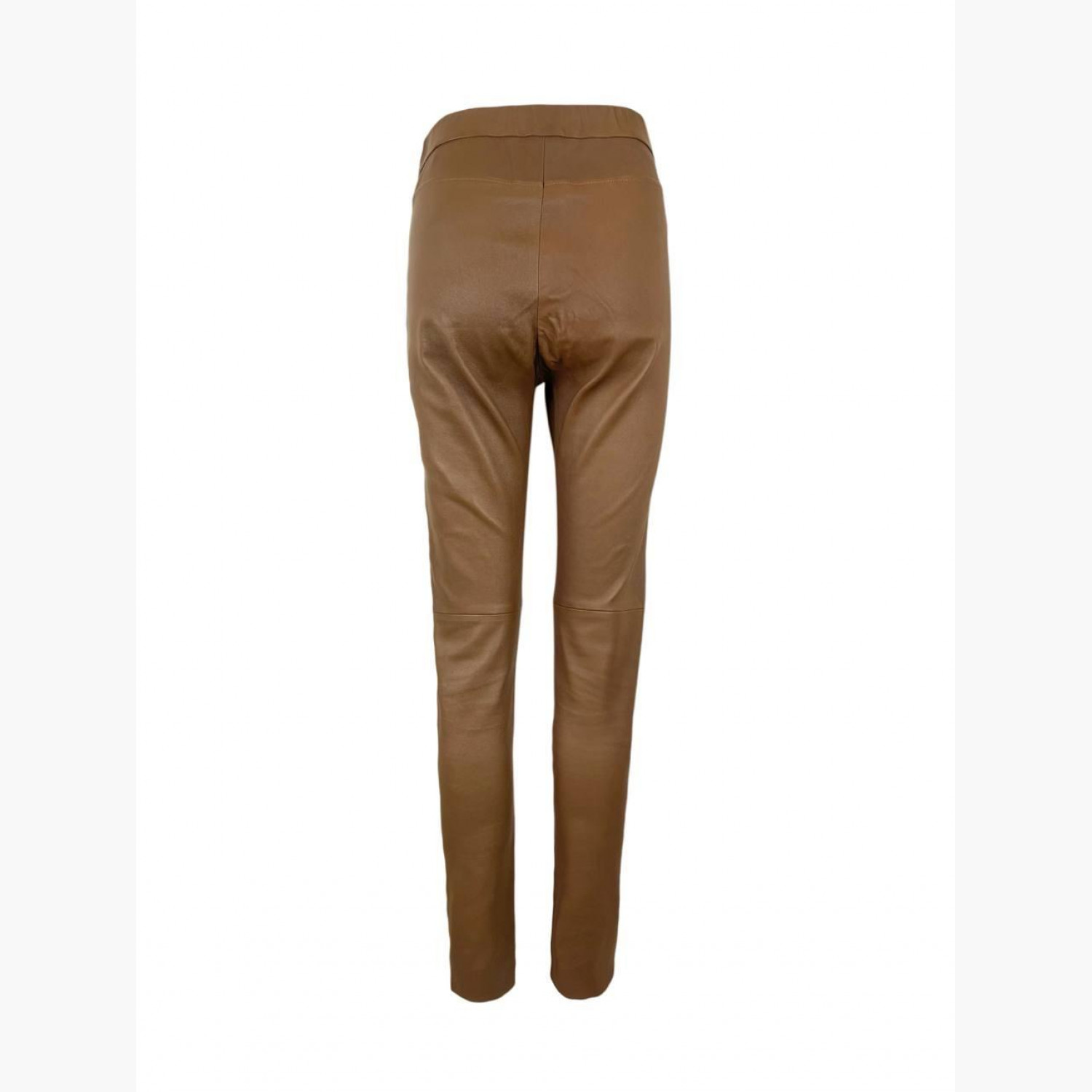 Коричневые кожаные штаны на резинке. Состав: основной материал — 100% кожа ягнёнка; подкладка — 95% хлопок, 5% эластан. В хорошем состоянии, есть следы носки, местами выползли нитки.