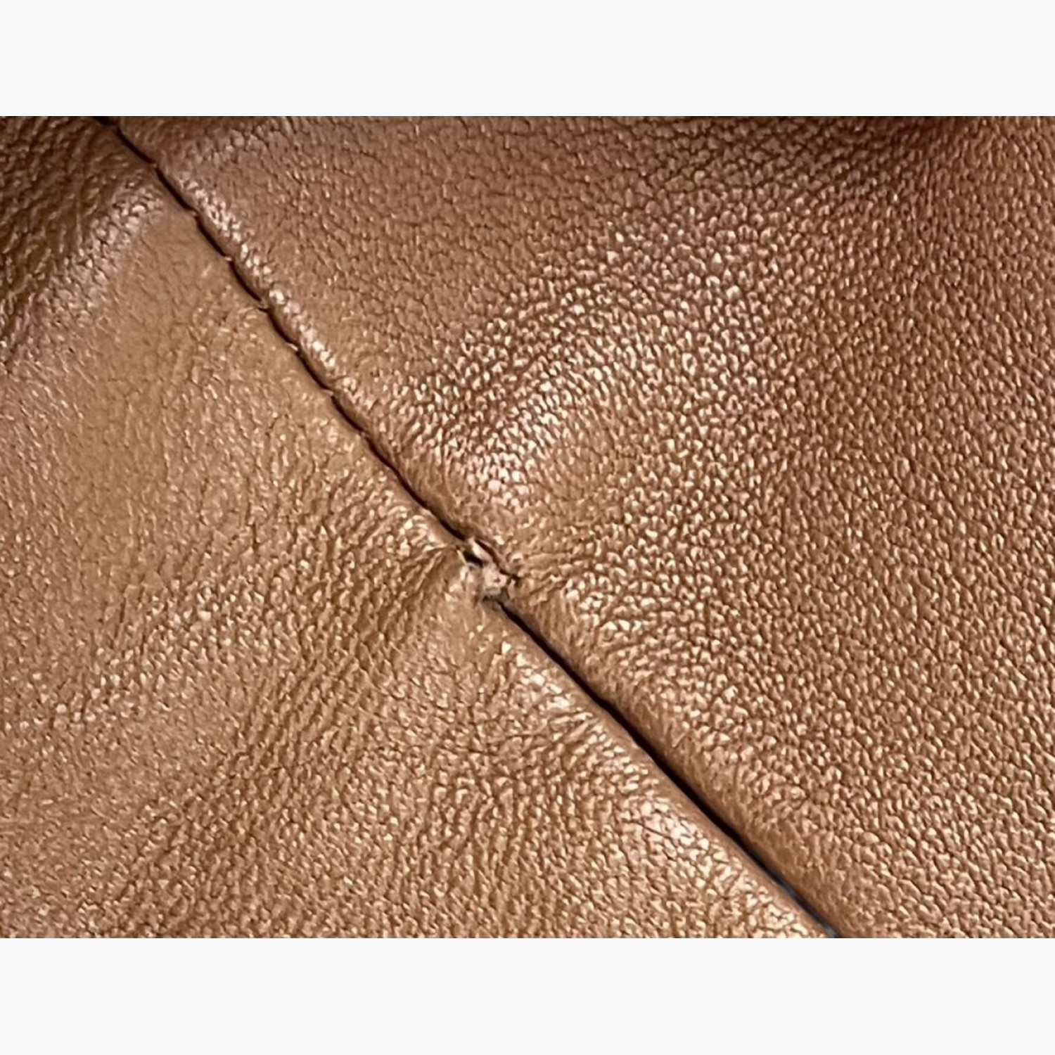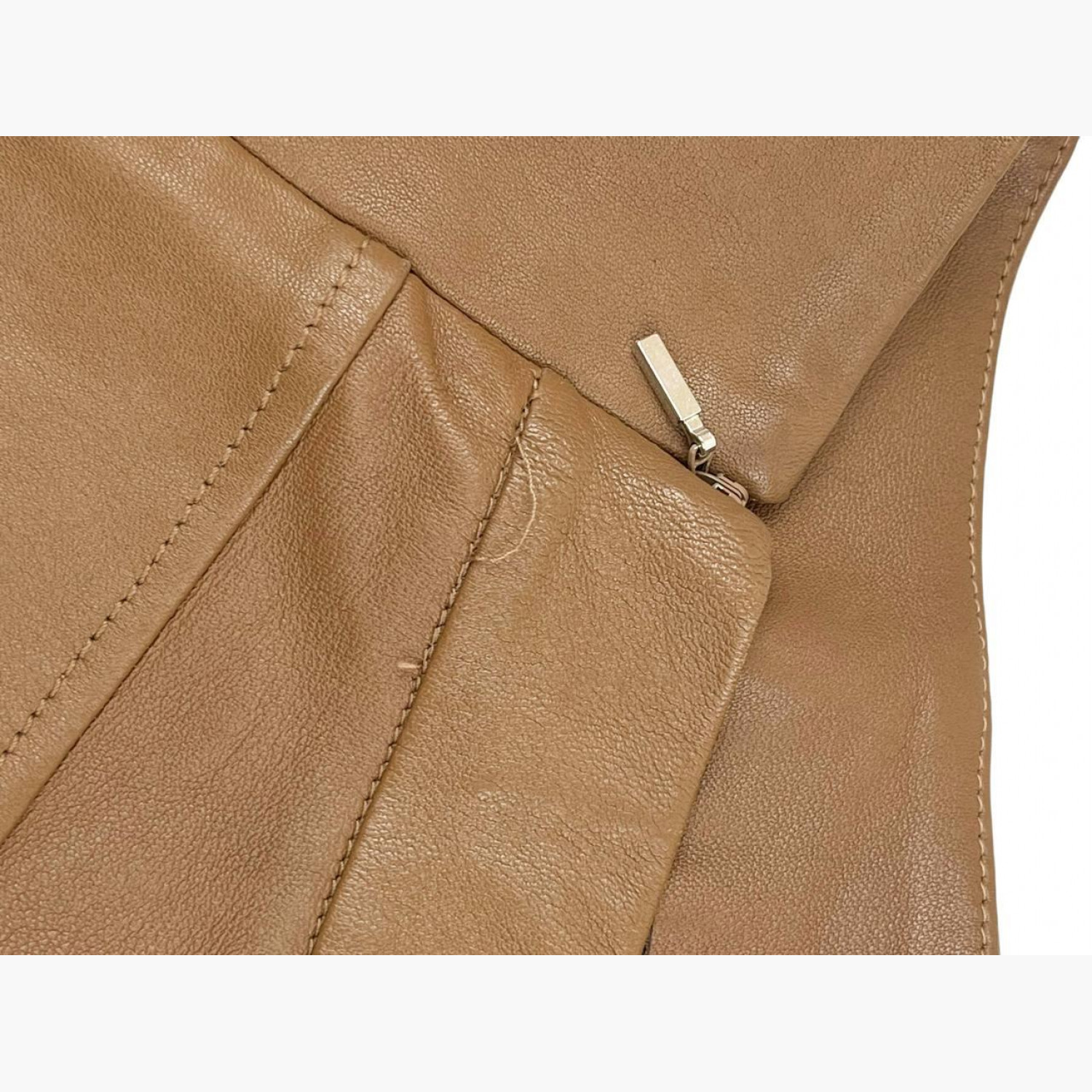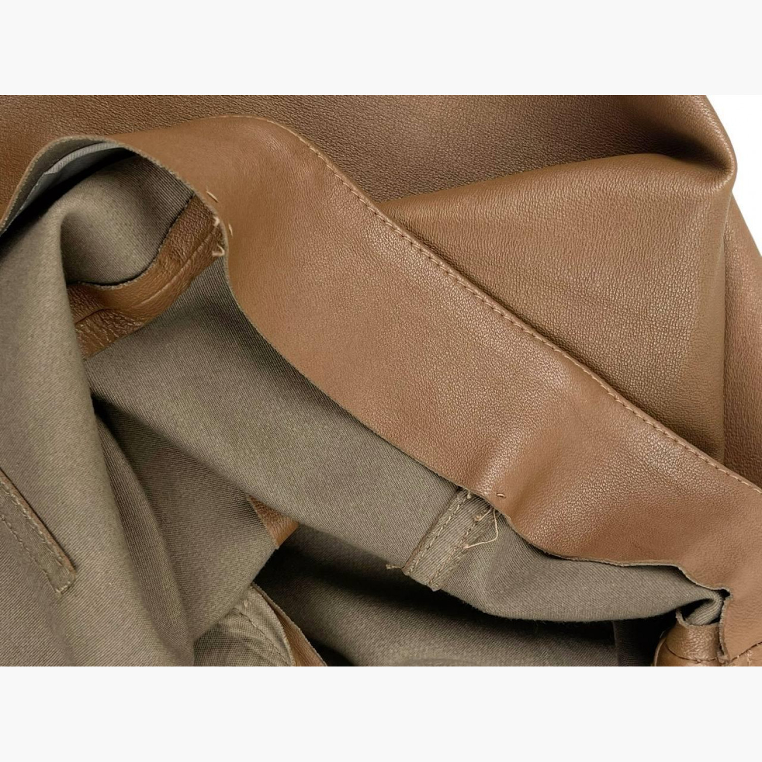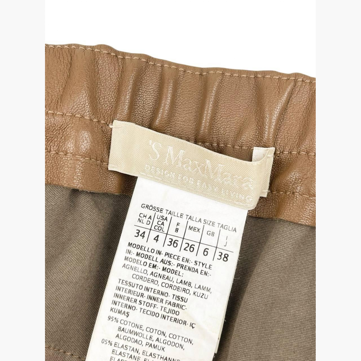 Коричневые кожаные штаны на резинке. Состав: основной материал — 100% кожа ягнёнка; подкладка — 95% хлопок, 5% эластан. В хорошем состоянии, есть следы носки, местами выползли нитки.