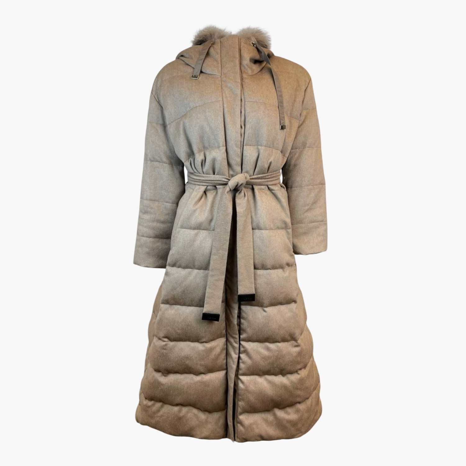 Длинное пуховое пальто коричневого цвета на поясе с меховым капюшоном, по бокам — кнопки.Состав: основной материал — 100% верблюжья шерсть; подкладка — 100% полиэстер.В отличном состоянии, без значительных следов носки.