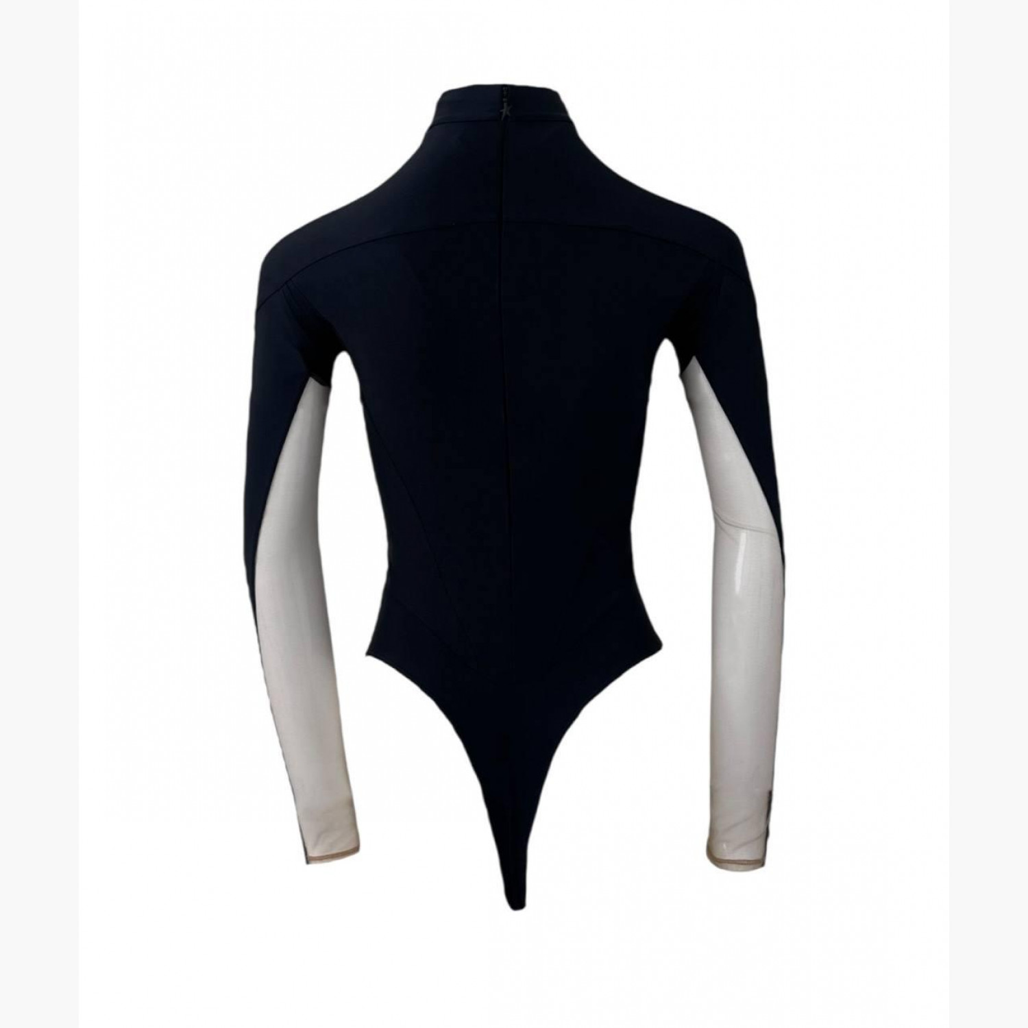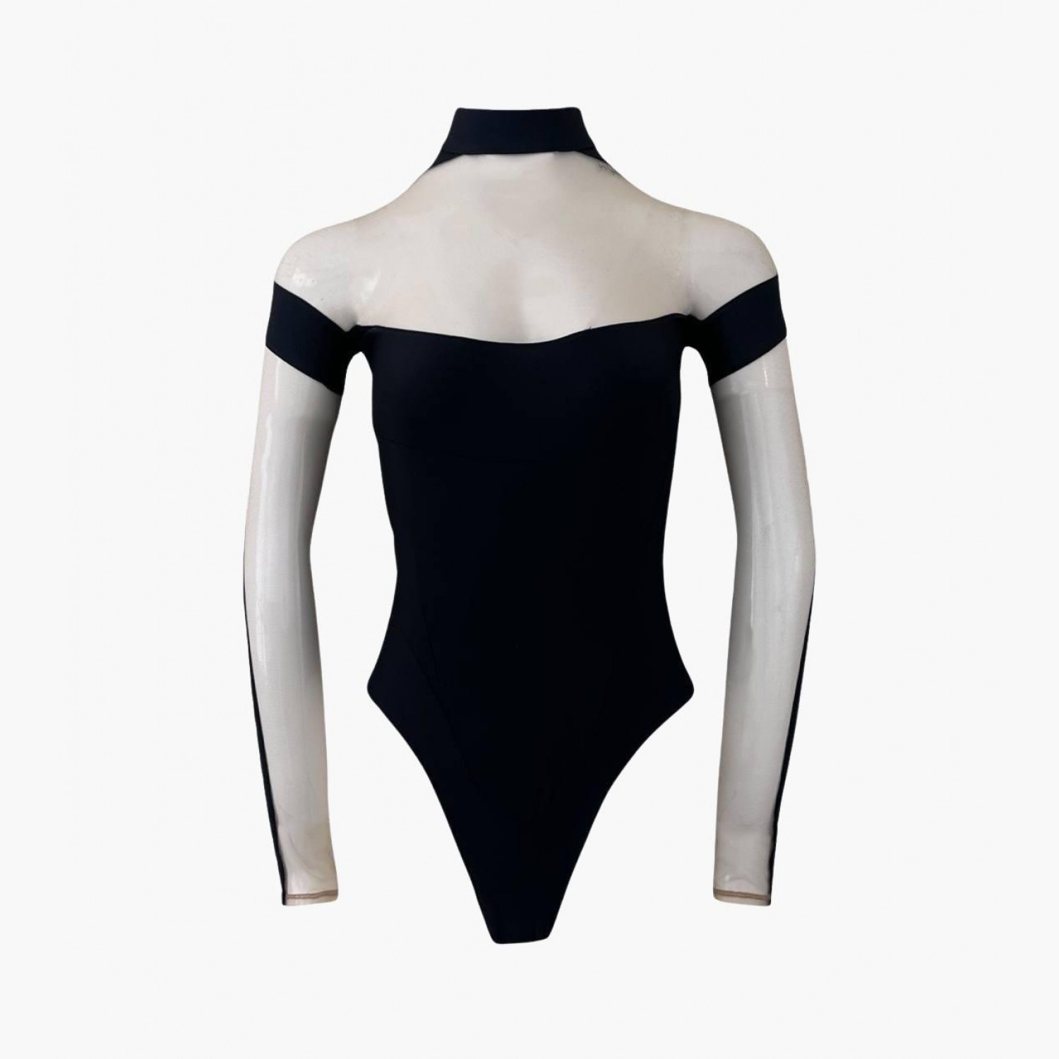 Чёрный боди с бежевыми сетчатыми вставками. Состав: основной материал — 78% полиамид, 22% эластан; вставки — 77% полиамид, 23% эластан; низ — 100% хлопок. В отличном состоянии, имеются незначительные следы носки.