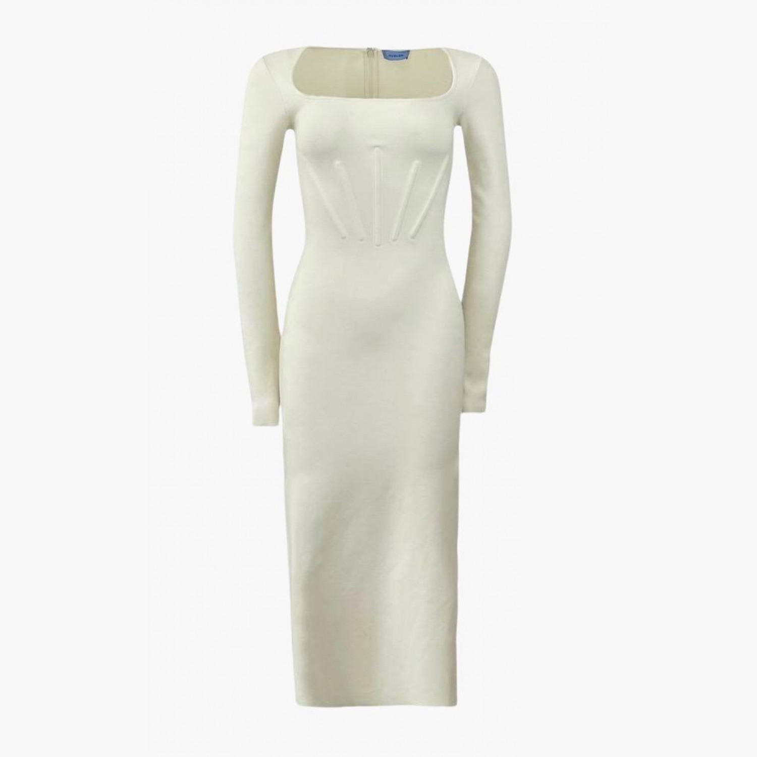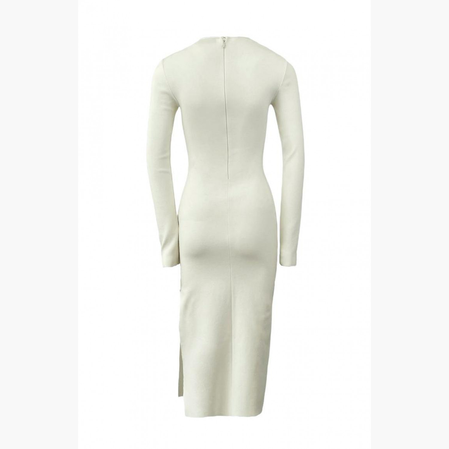 Трикотажное платье молочного цвета с длинными рукавами и молнией на спине. Состав: 70% вискоза, 30% полиэстер. В отличном состоянии, без следов носки.