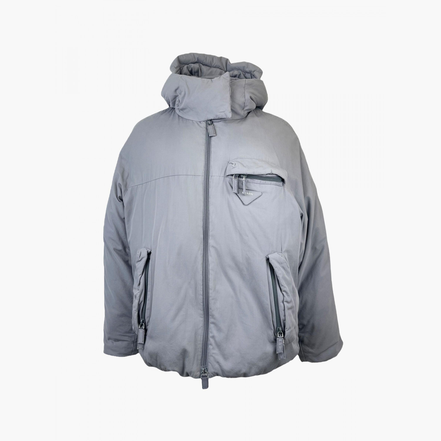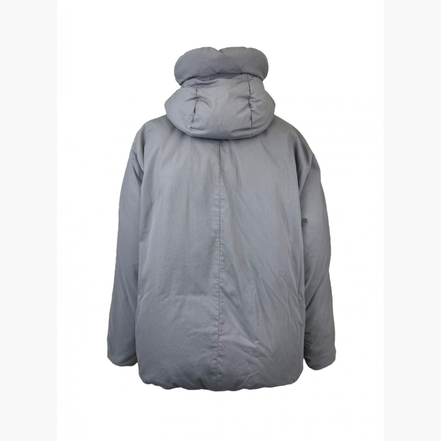 Серый укороченный пуховик с капюшоном. Состав: основной материал — 100% хлопок, наполнитель — 90% гусиный пух и перо, подкладка — 100% полиэстер. В отличном состоянии, без следов носки.