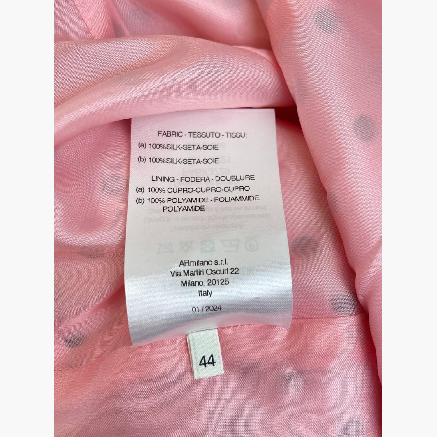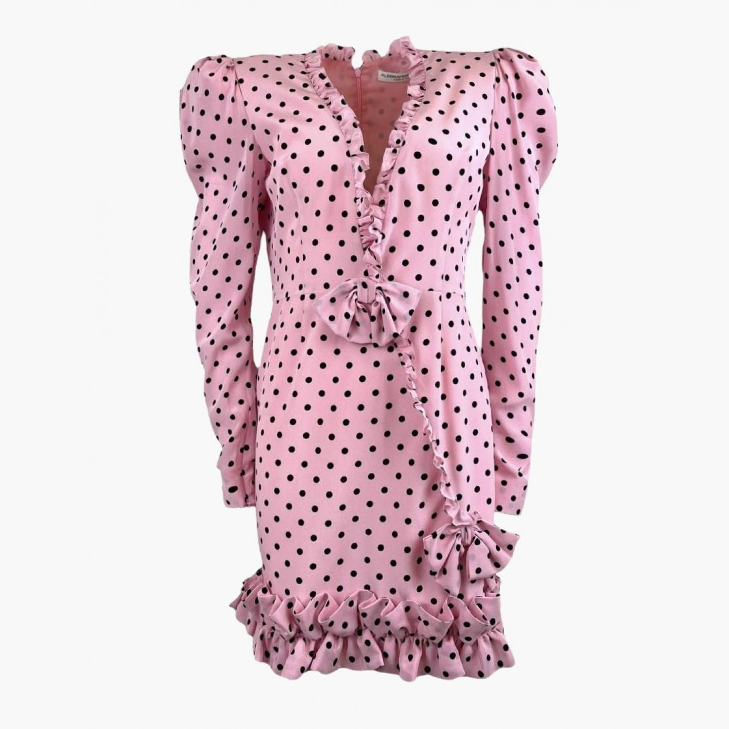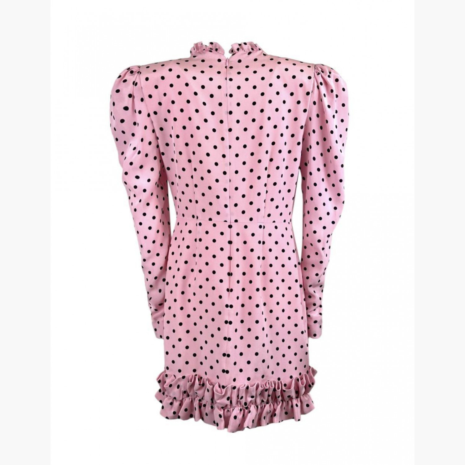 Розовое шелковое мини-платье в черный горох, украшенное бантами и воланами. Состав: основной материал — 100% шелк; подкладка — 100% купро и 100% полиамид. В отличном состоянии, без следов носки.