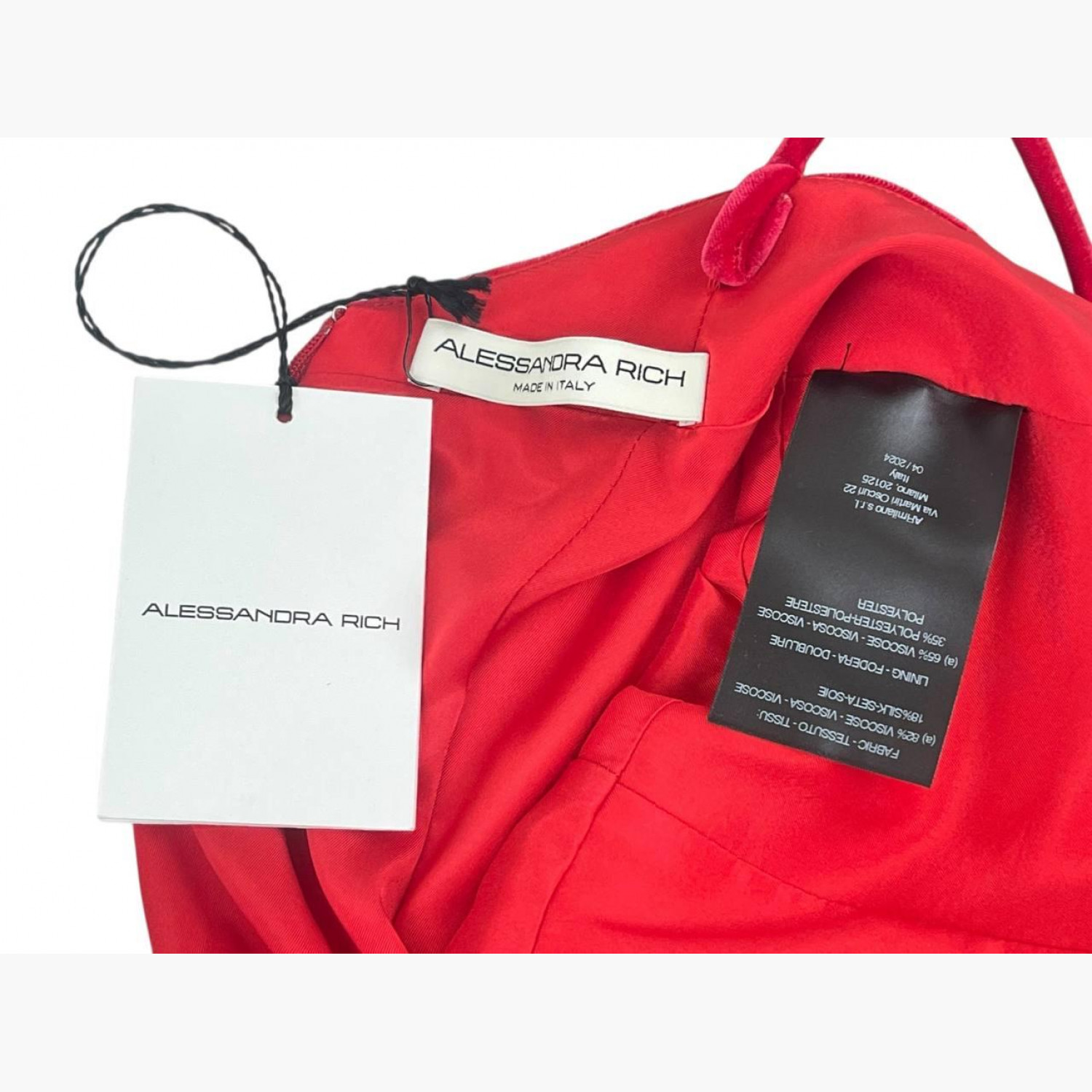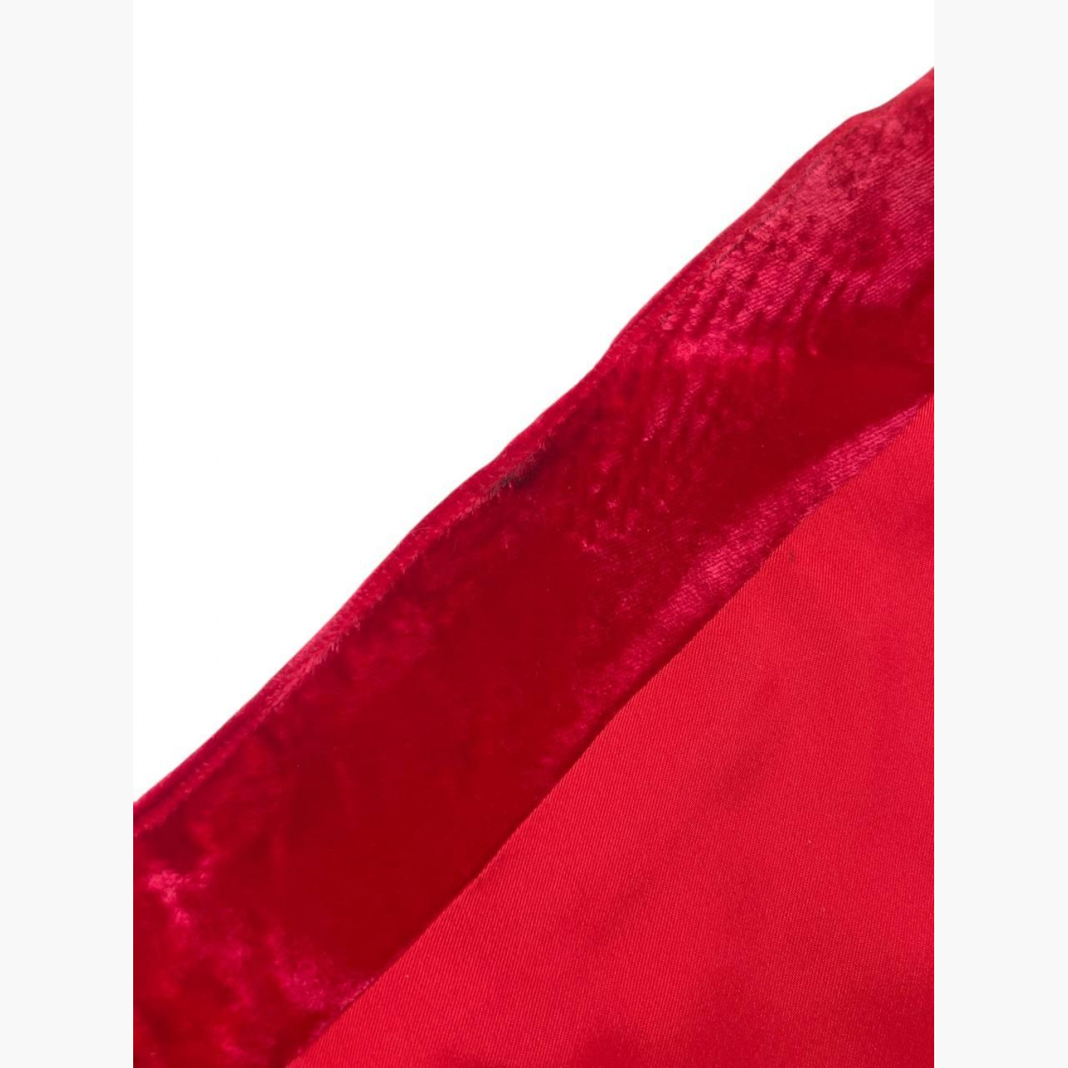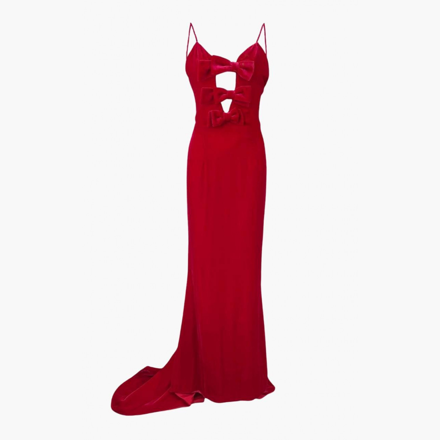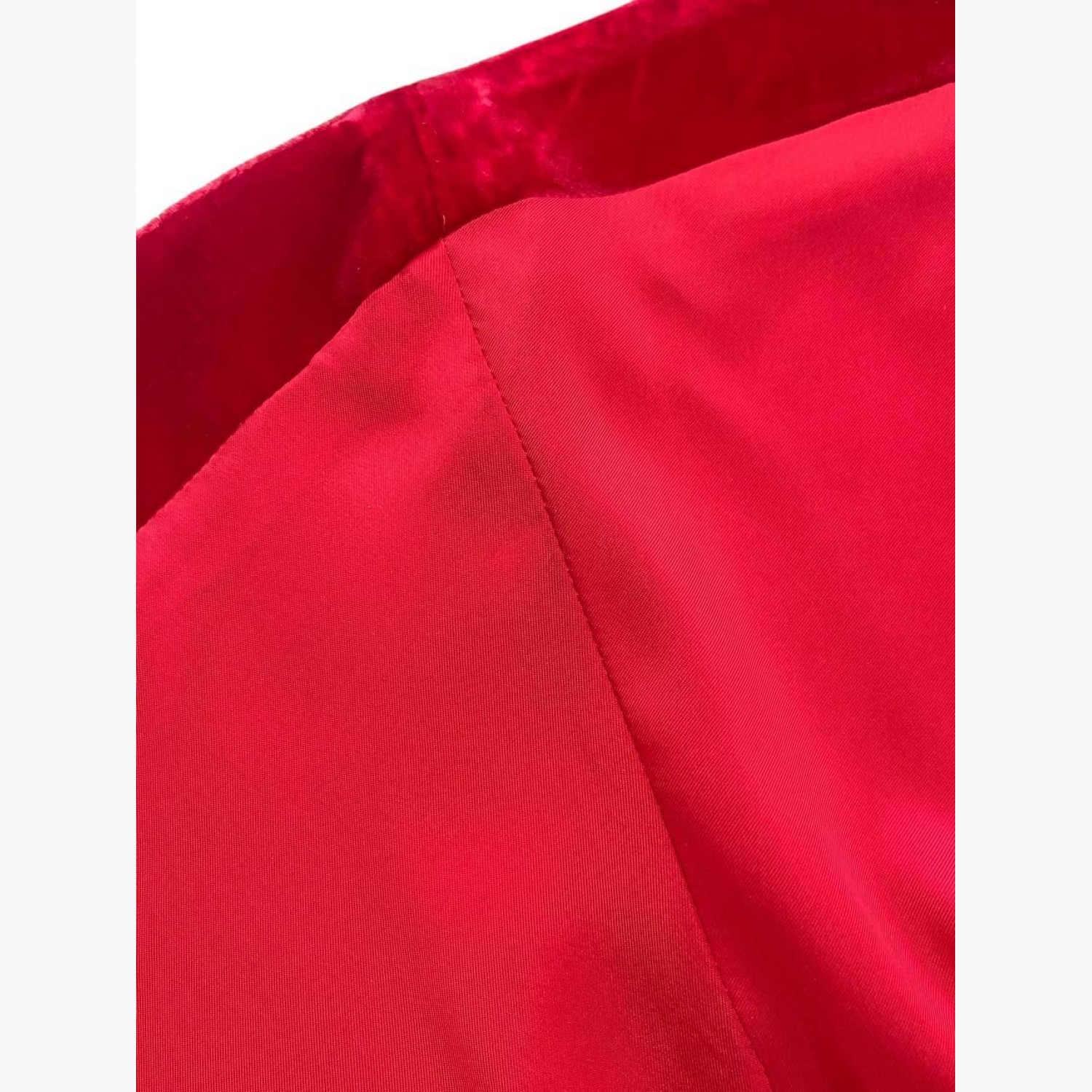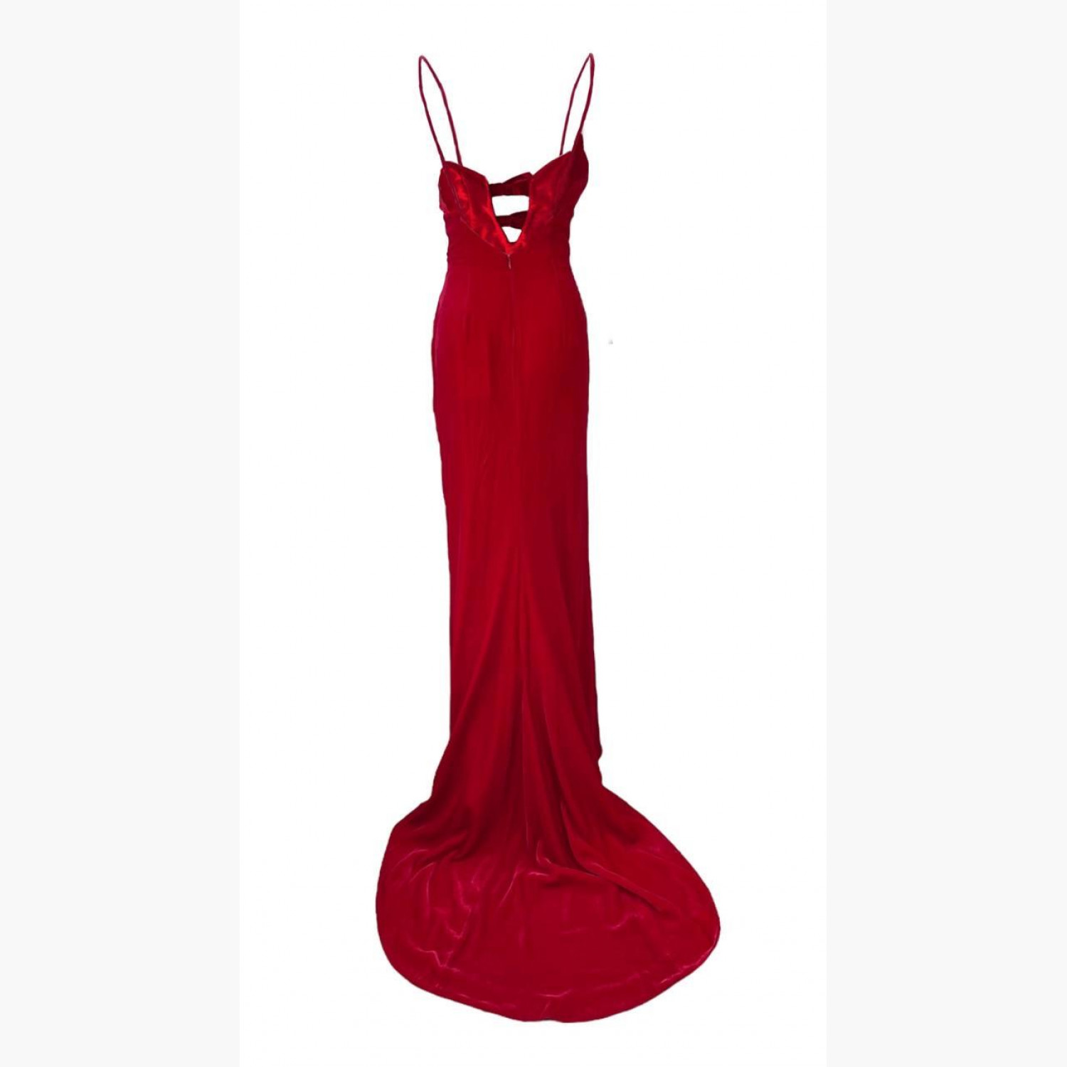 Красное вельветовое платье макси с длинным шлейфом. В зоне декольте — три банта. С биркой. Состав: основной материал — 82% вискоза, 18% шёлк; подкладка — 65% вискоза, 35% полиэстер. В отличном состоянии, есть пятна.