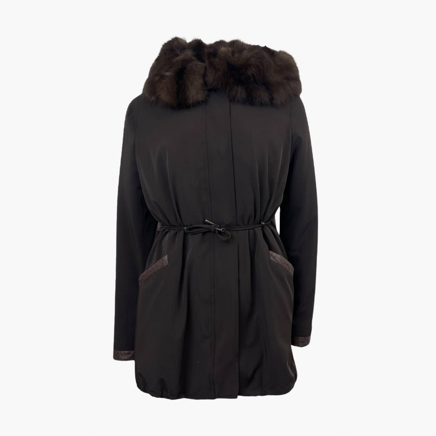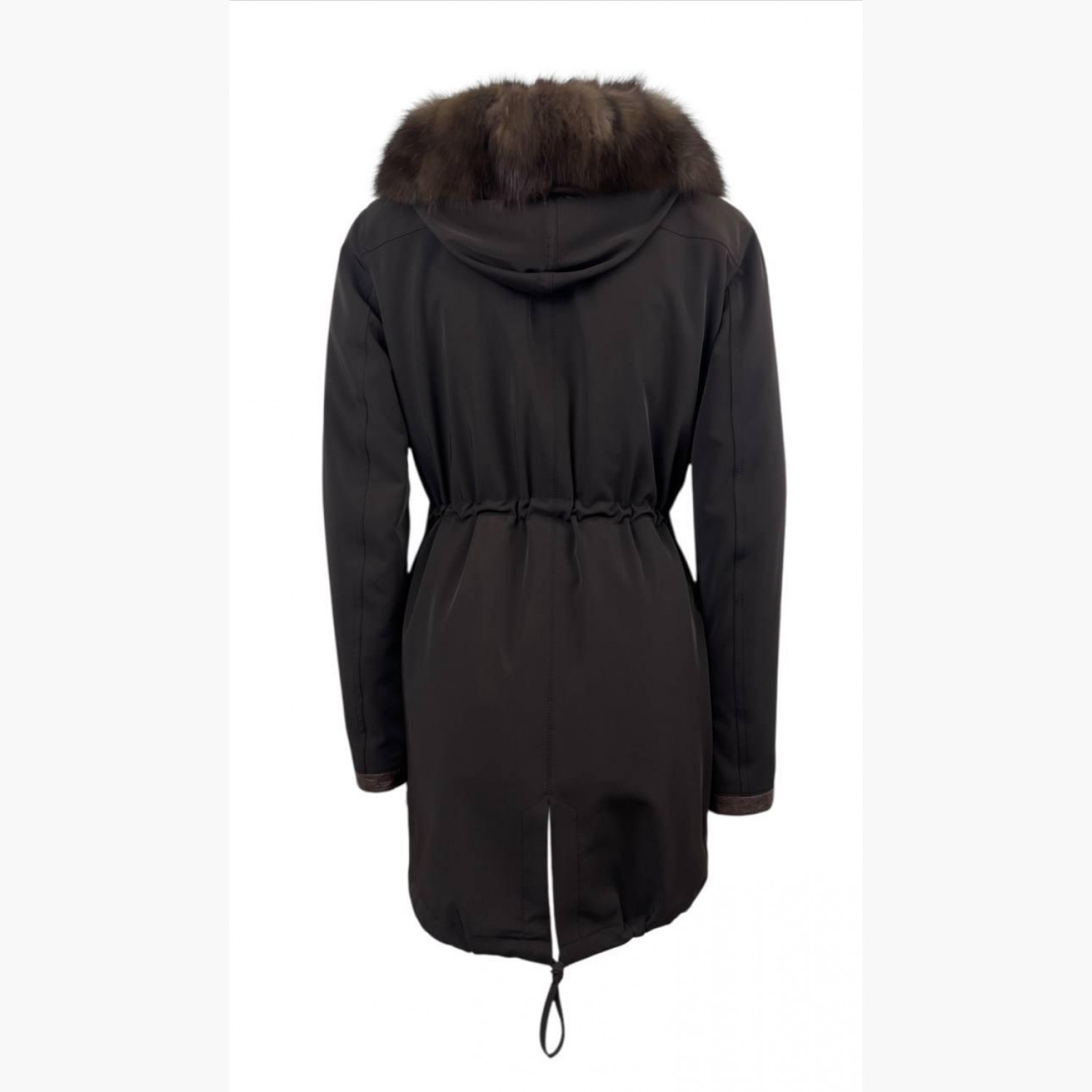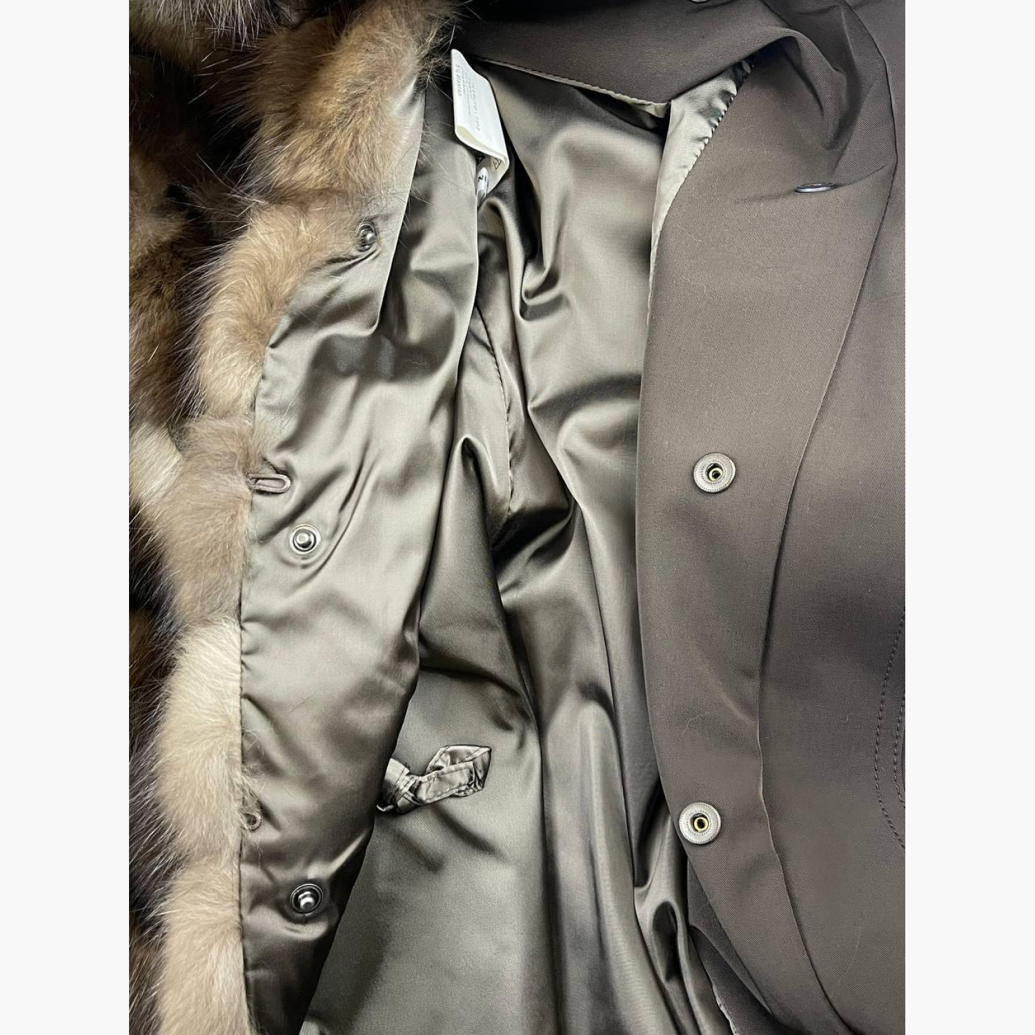 Парка-шуба выполнена из меха соболя. Состав: основной материал — 95% полиэстер, 5% эластан; подкладка — 97% полиамид, 3% полиуретан. В отличном состоянии, имеются незначительные следы носки.