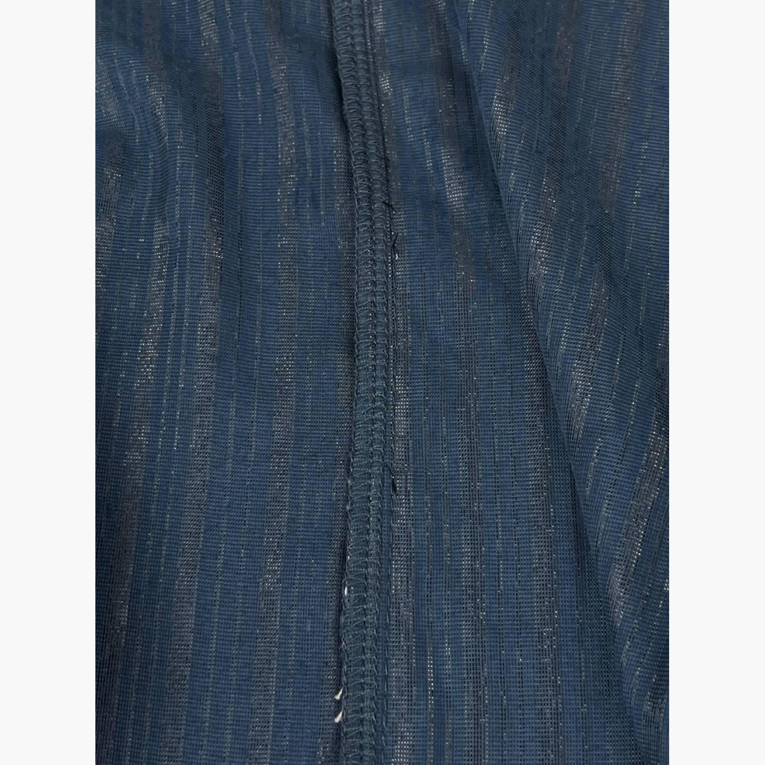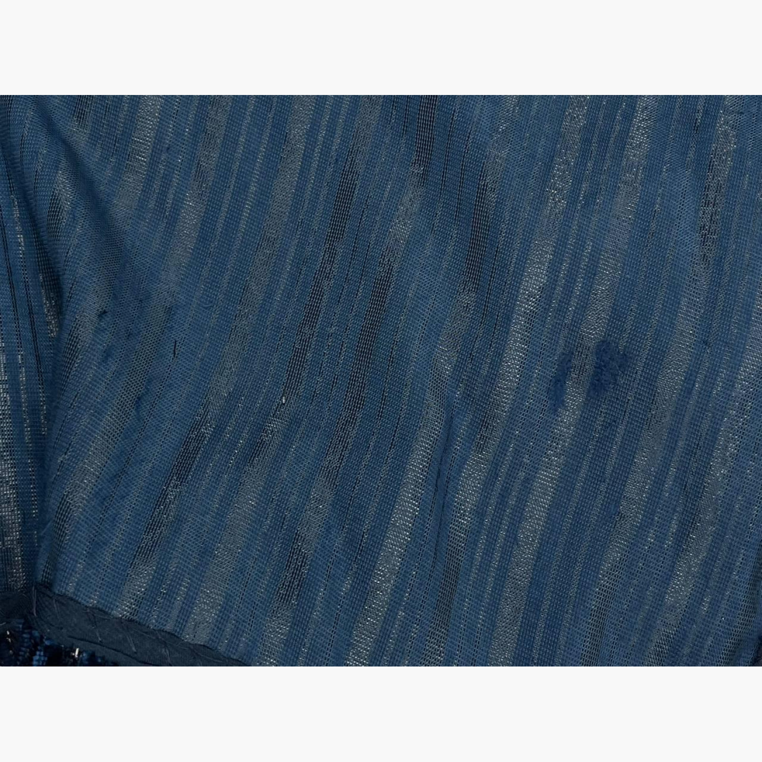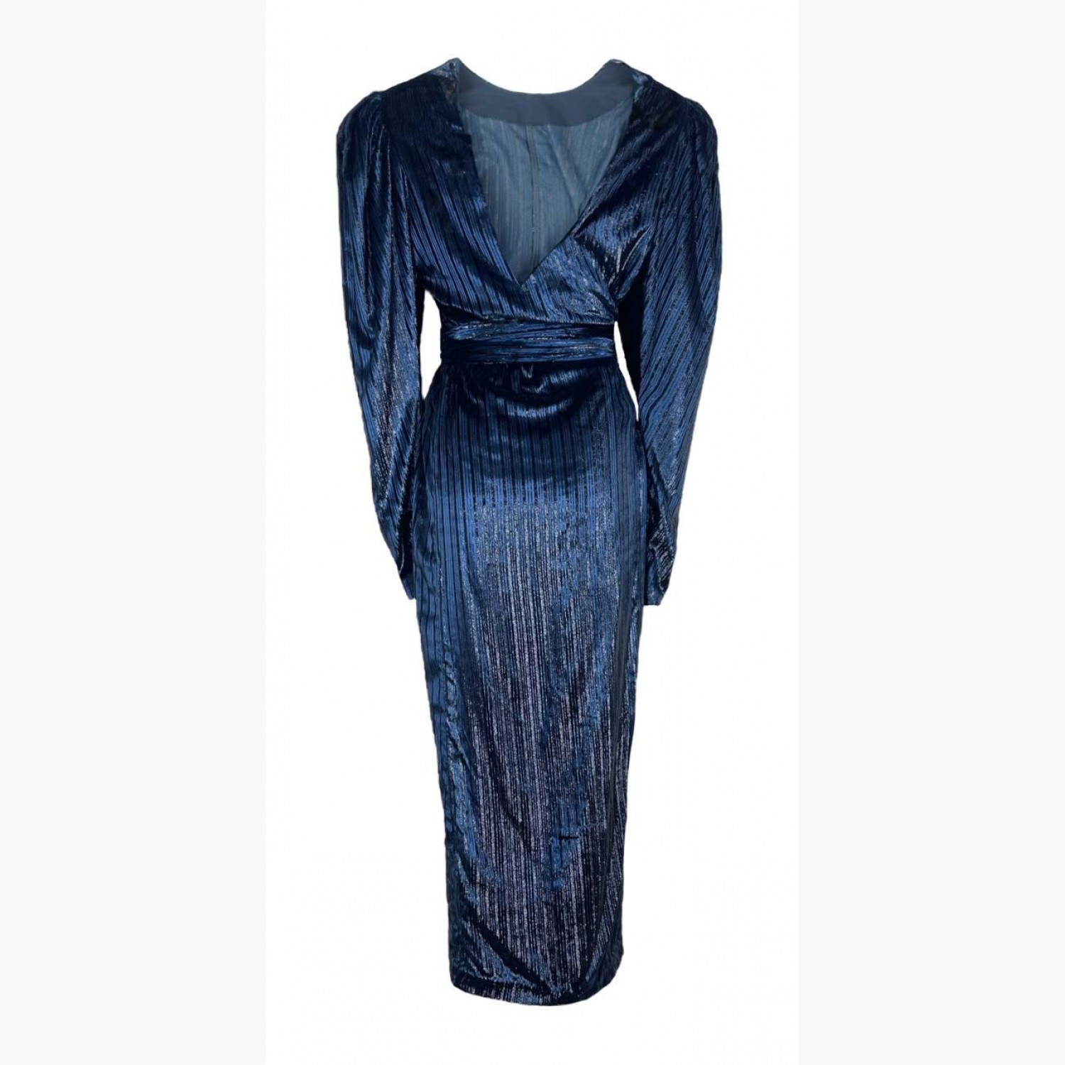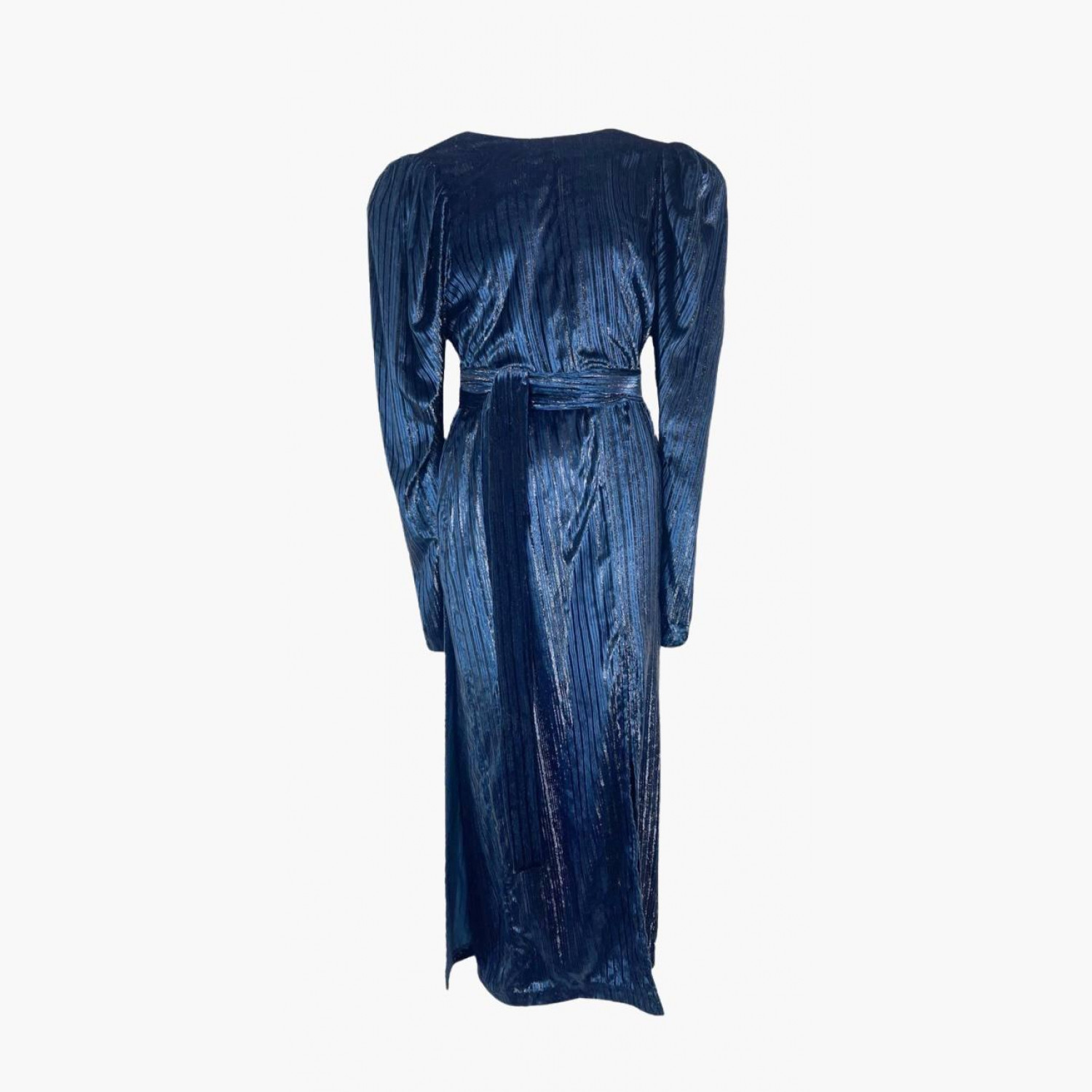 Синее блестящее платье с открытой спиной, на запах и с длинным поясом. Есть дополнительная пуговица. В отличном состоянии, есть незначительные следы носки.