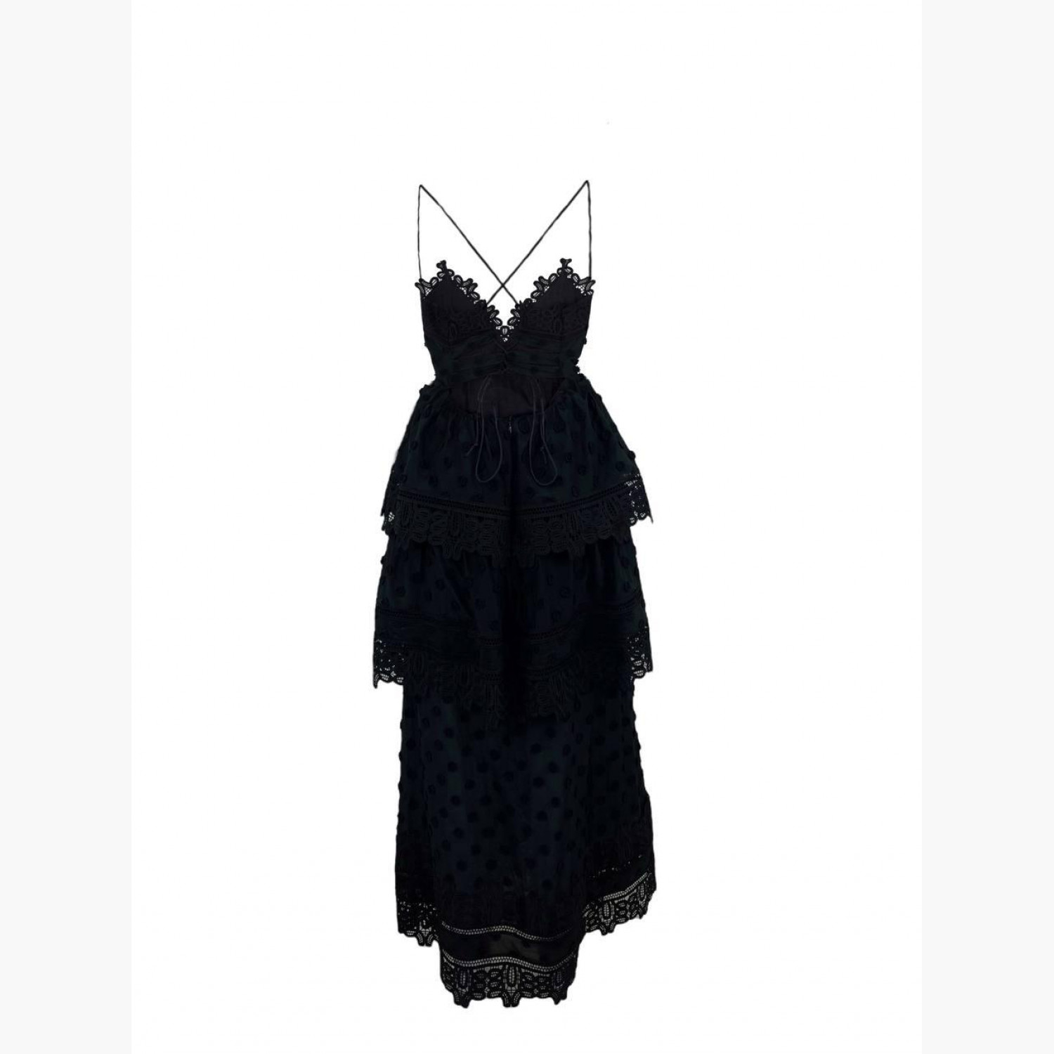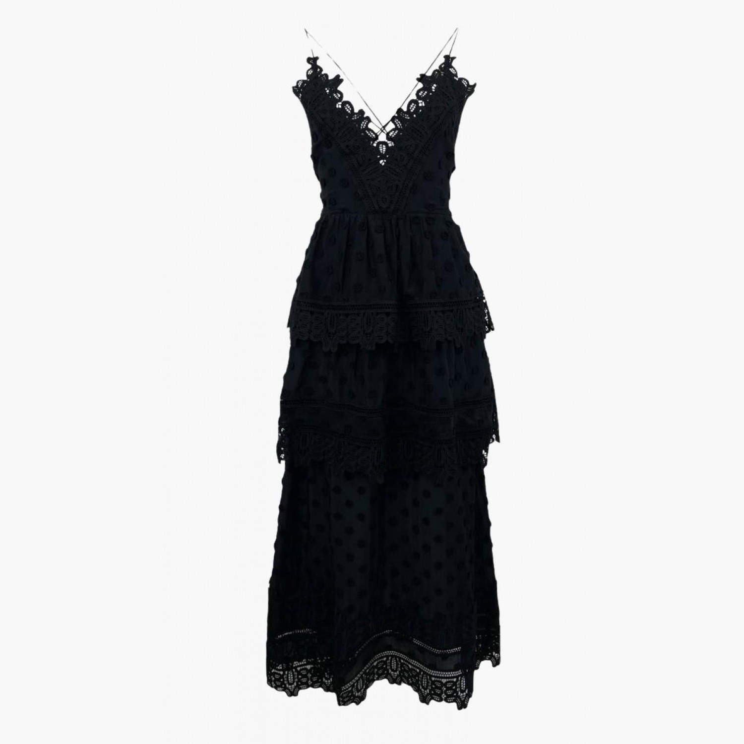 Черное гипюровое платье с открытой спиной на шнуровке. Состав: 70% хлопок, 30% тенсель. В отличном состоянии, есть незначительные следы носки.