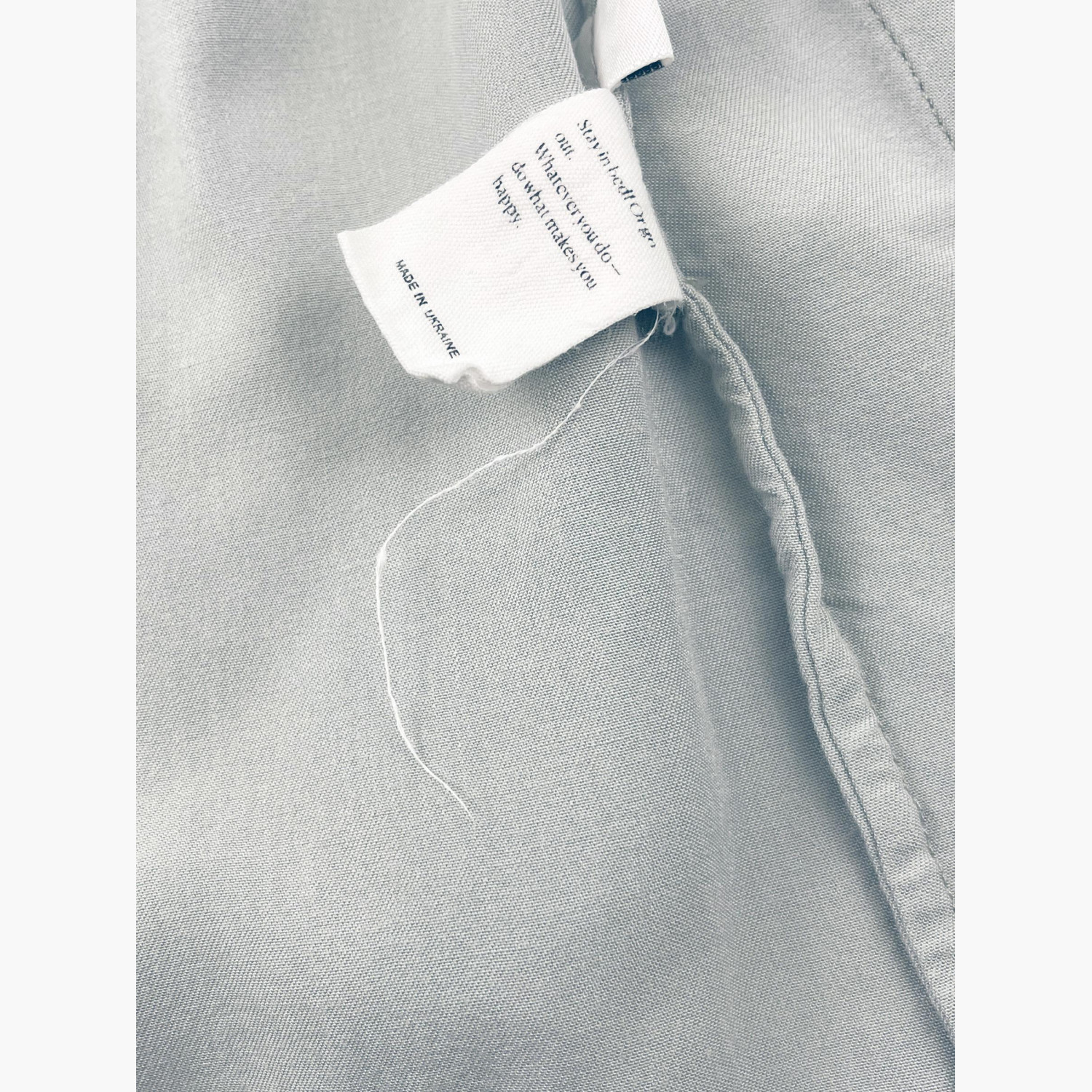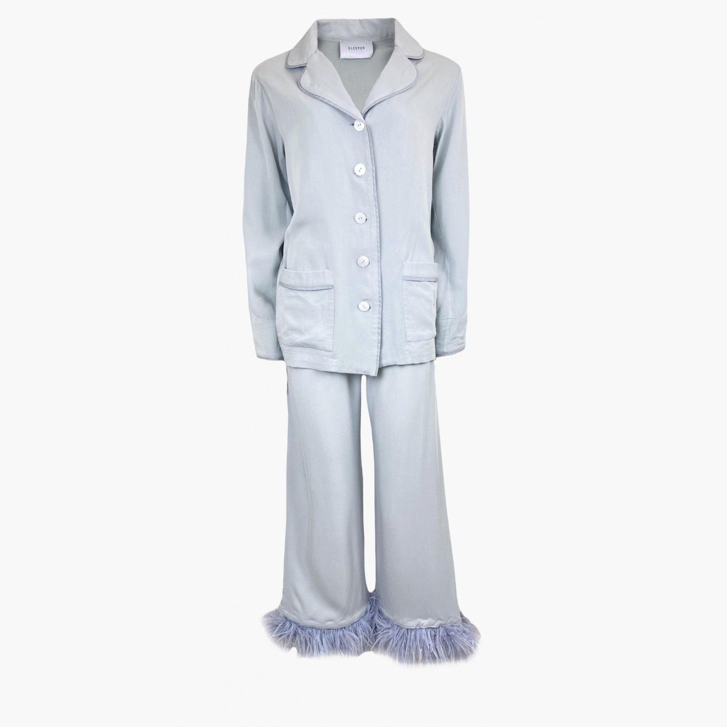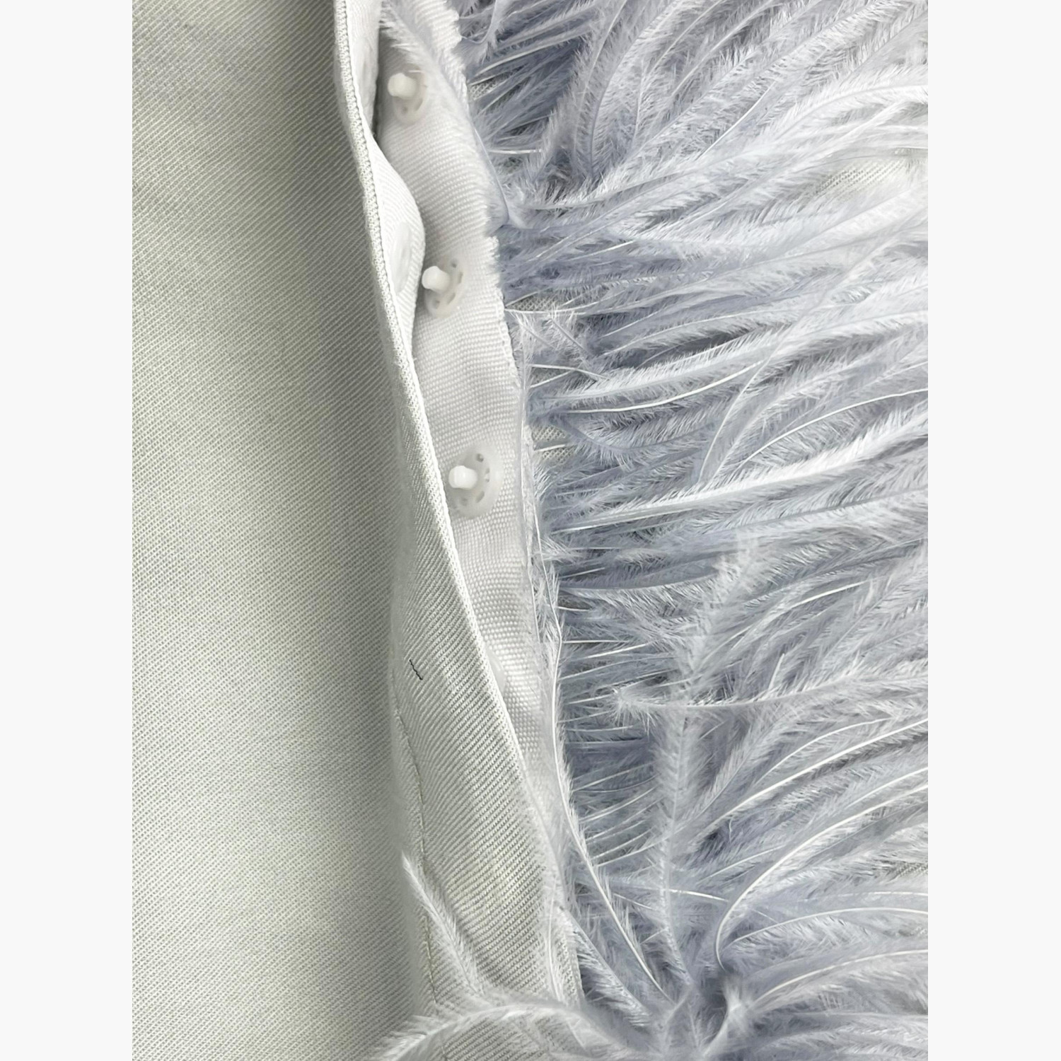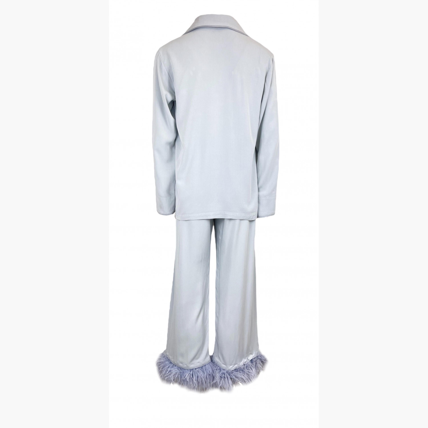 Костюм голубого оттенка. Низ штанов украшен съёмными перьями лавандового цвета. В очень хорошем состоянии, есть незначительные следы носки.