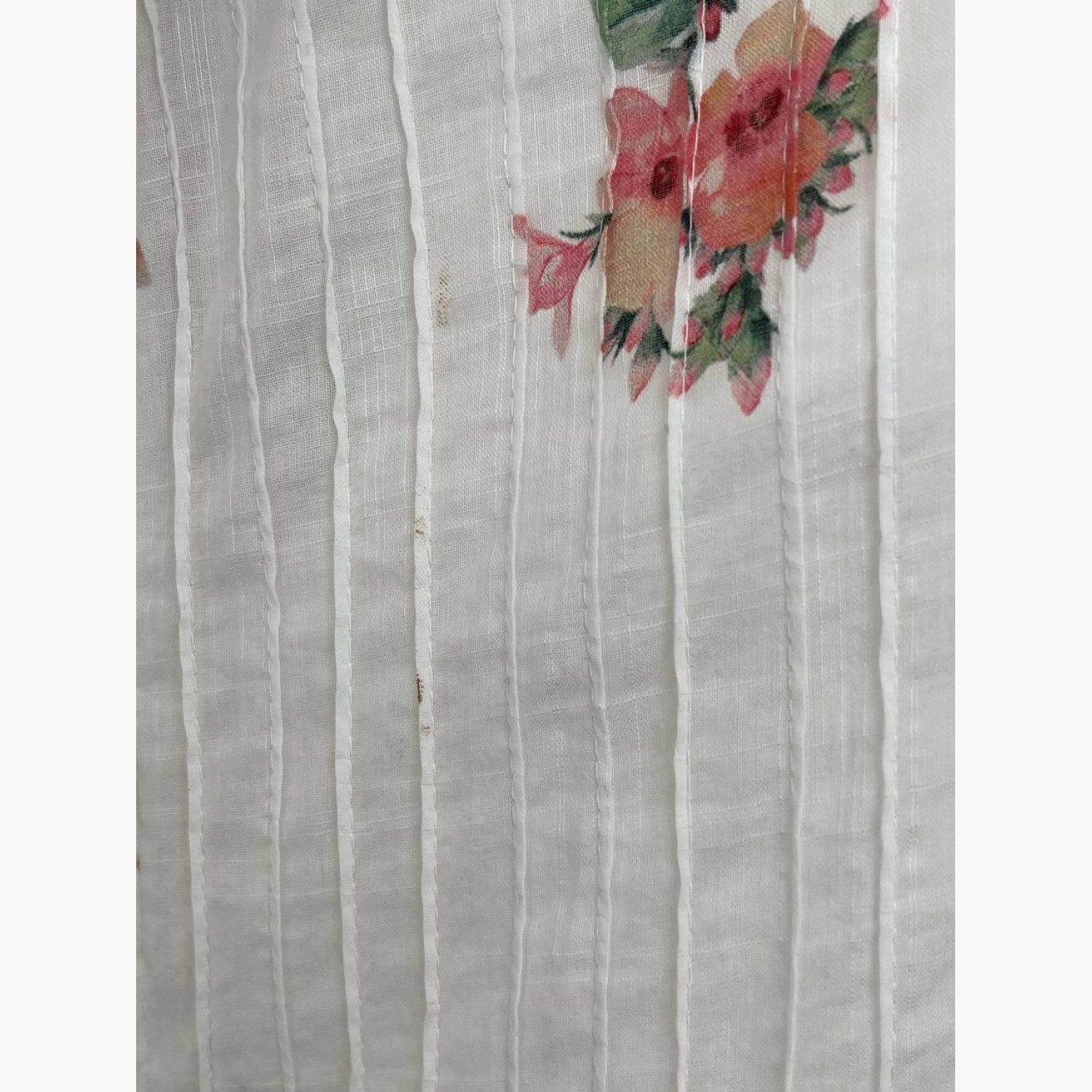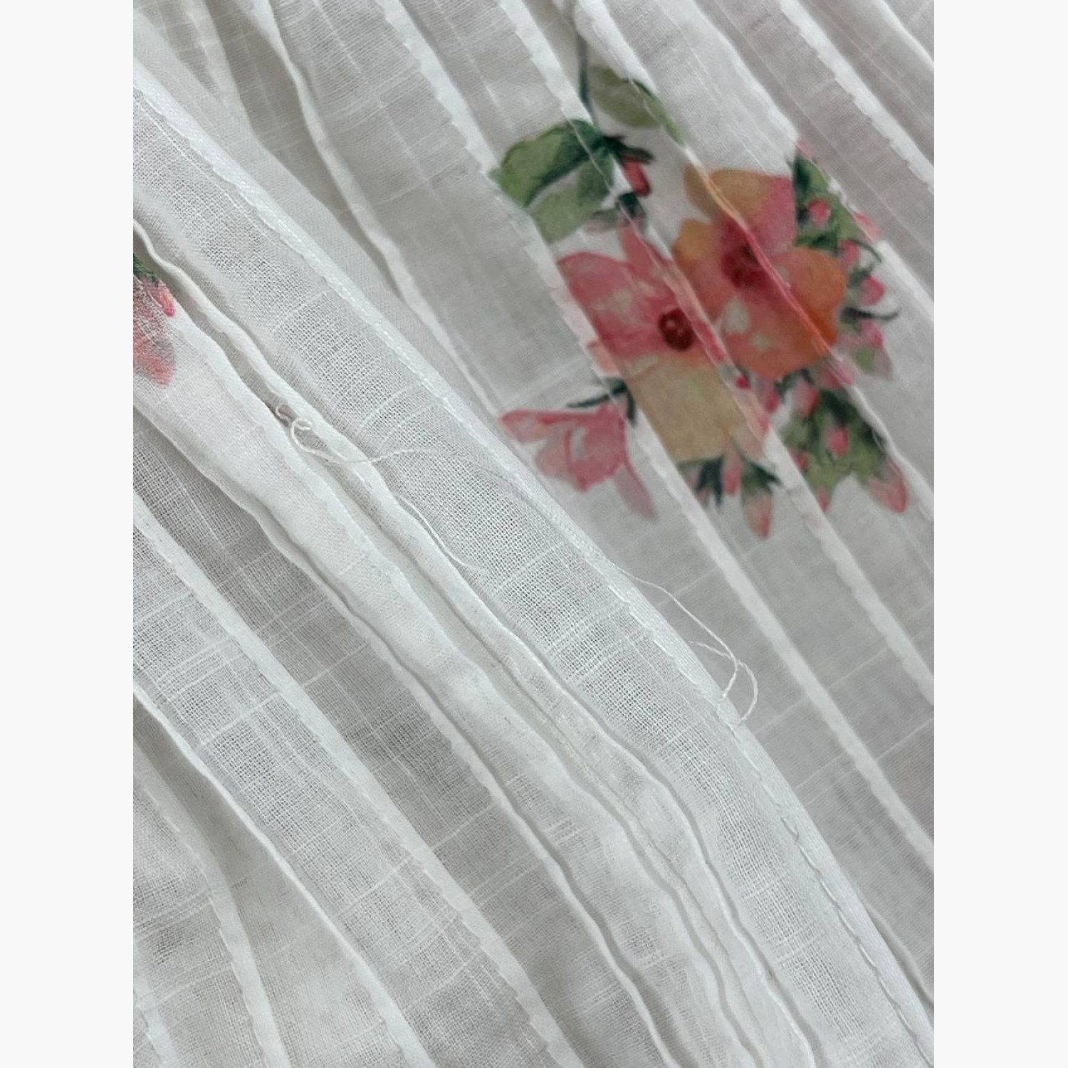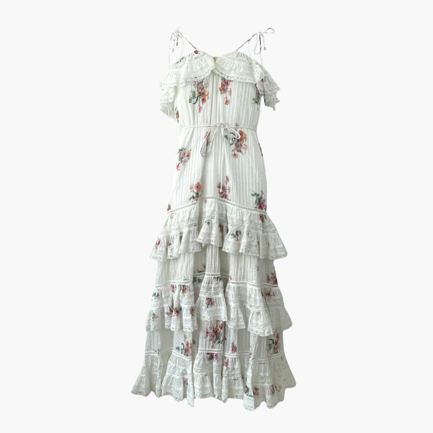 Белое платье с гипюровыми вставками в цветочном принте на бретельках. Состав: основной материал — 100% хлопок; подкладка — 100% хлопок. В очень хорошем состоянии, есть незначительные следы носки.