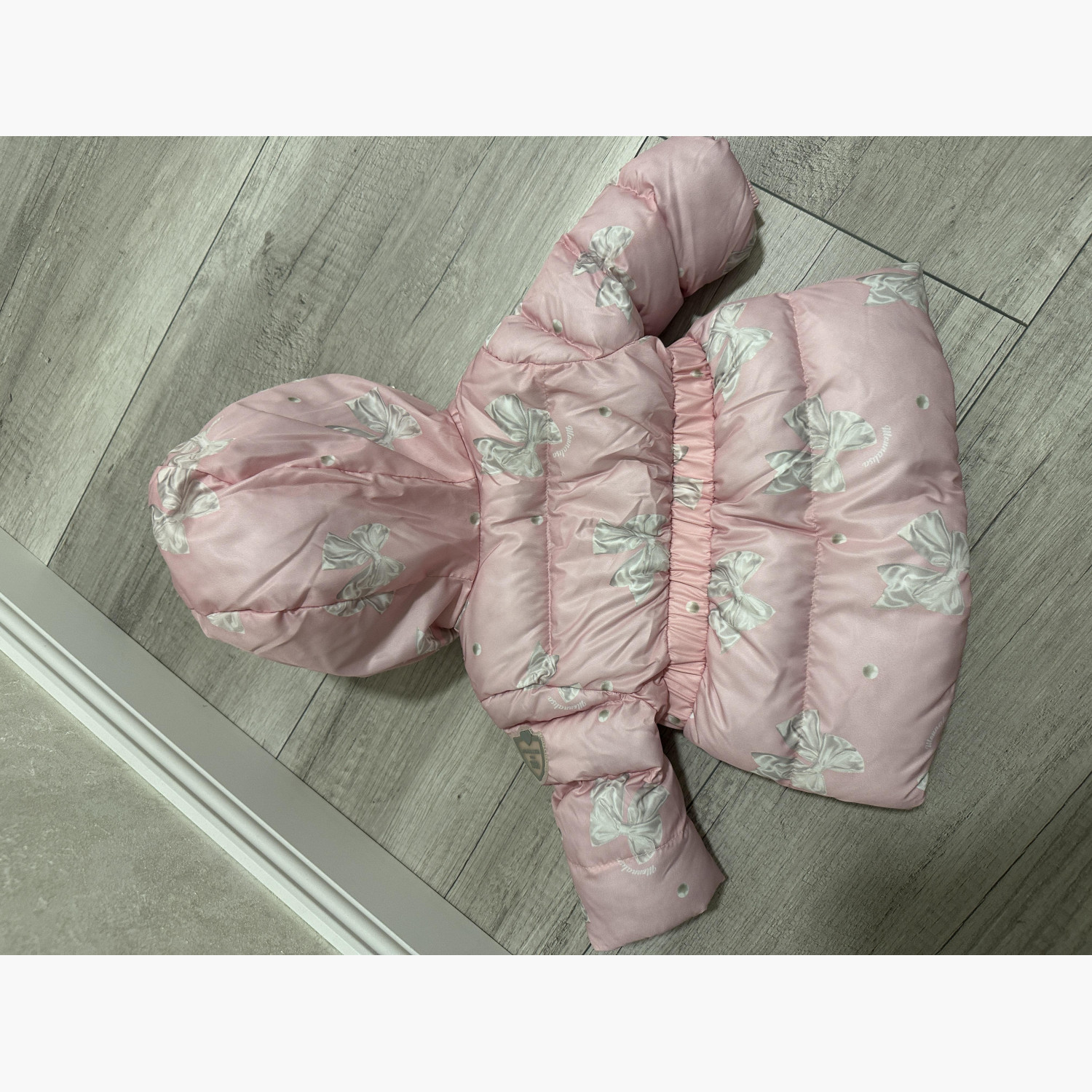 Long soft jacket with a hood. Size 6–9 months, but actually fits 9–12 months. Matte nylon with quilting. Hood and elastic waistband. Knitted collar and patch pockets.