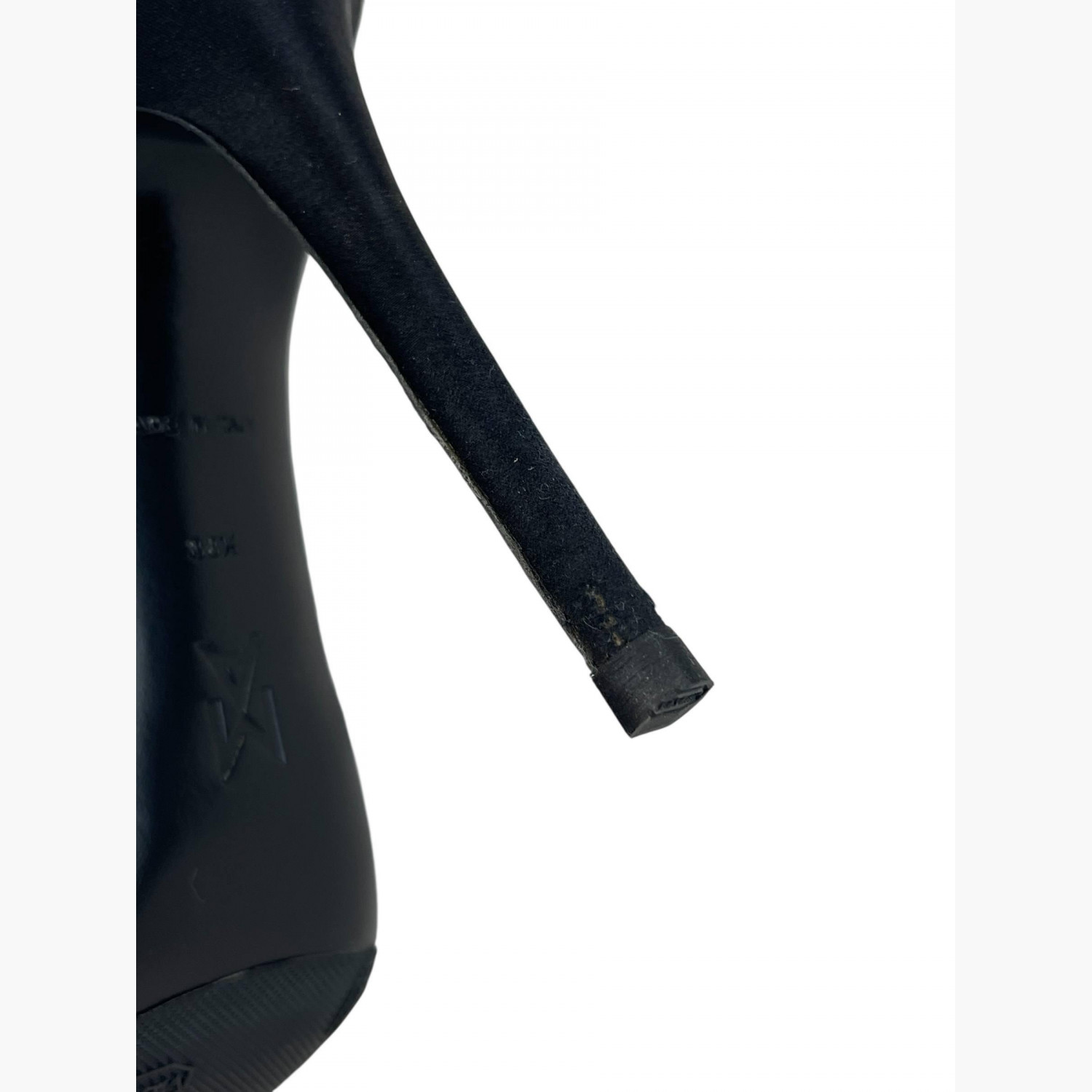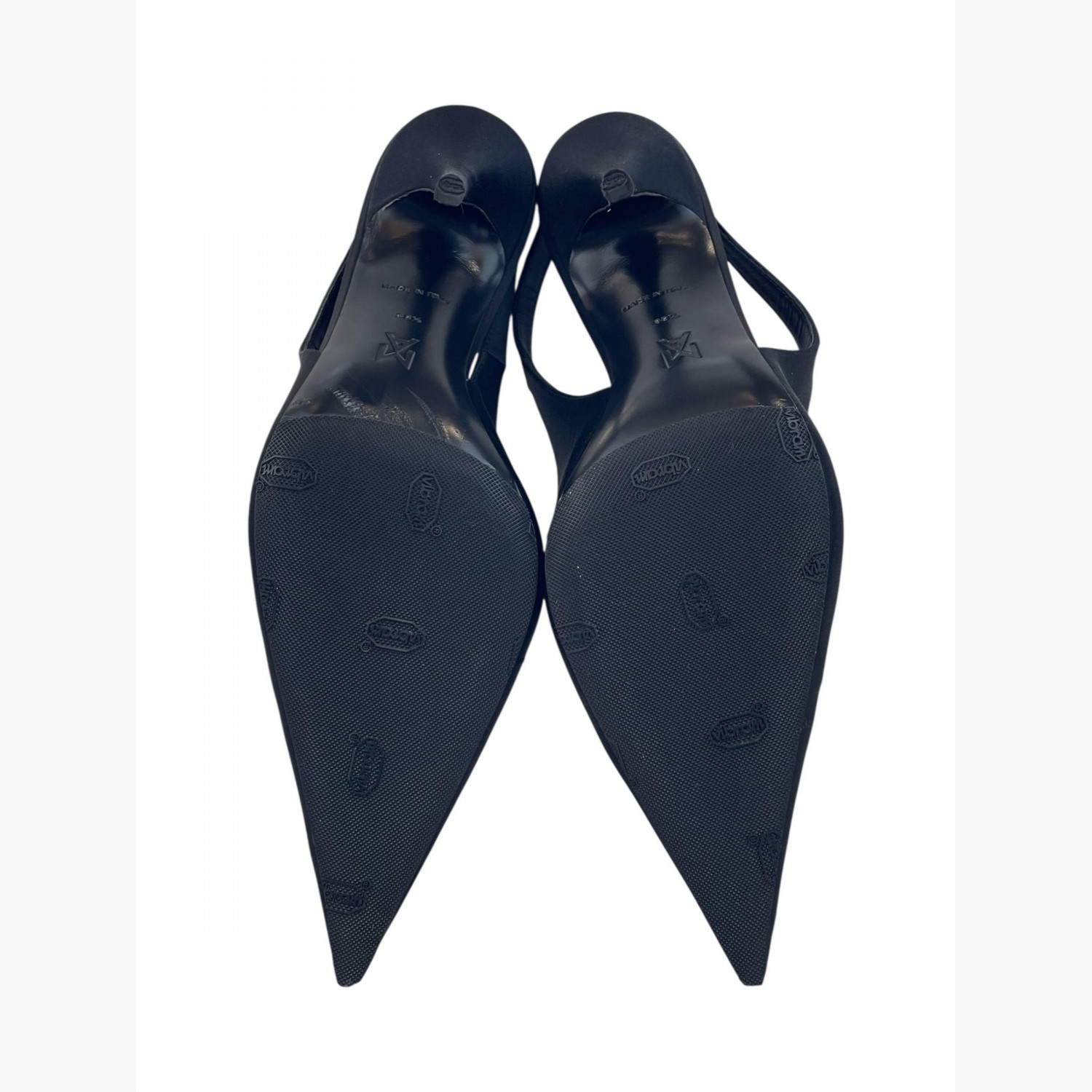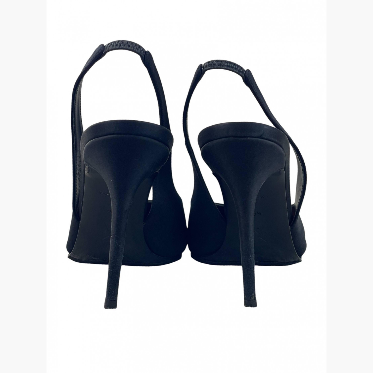 Black textile high-heeled shoes with an open back.In good condition, with signs of wear.