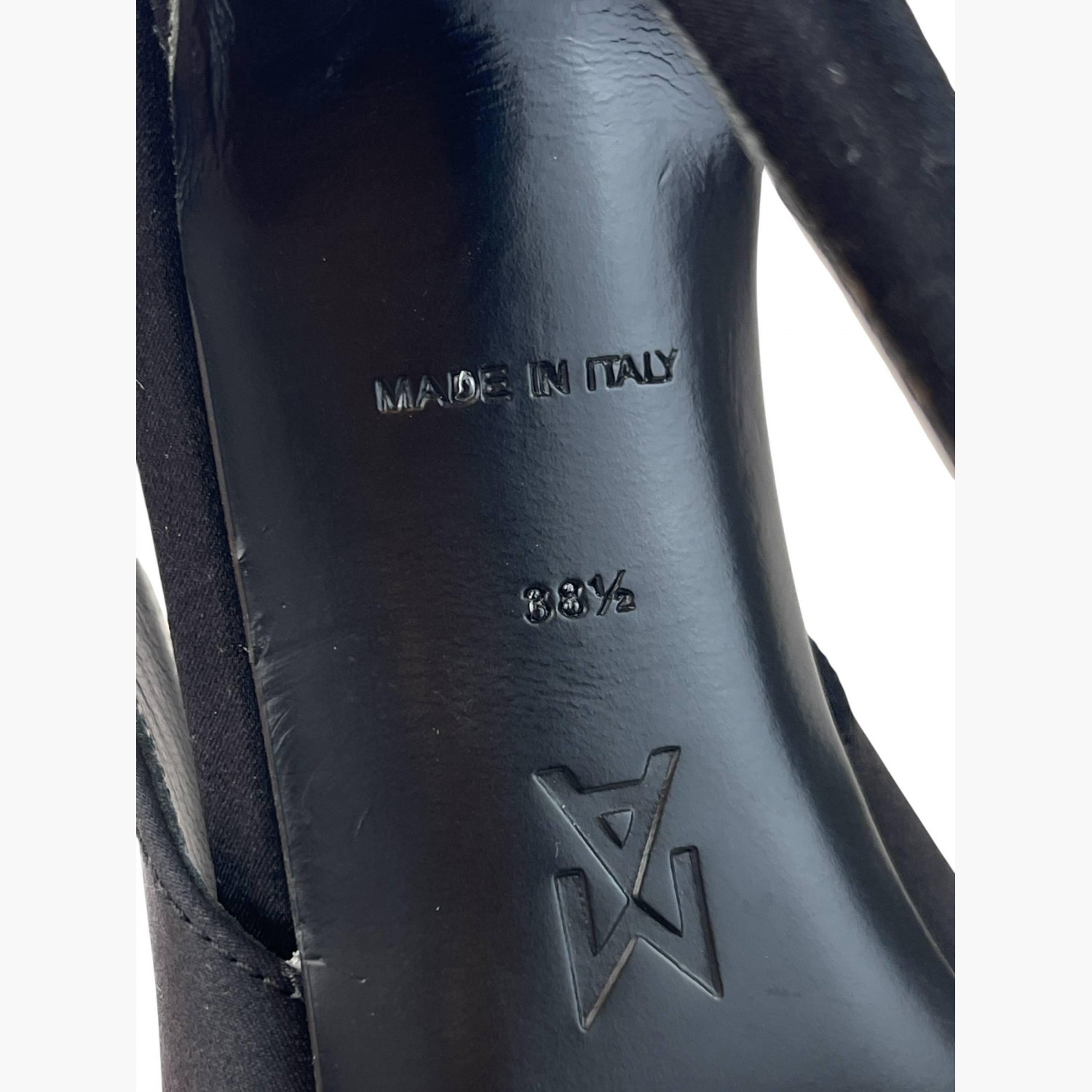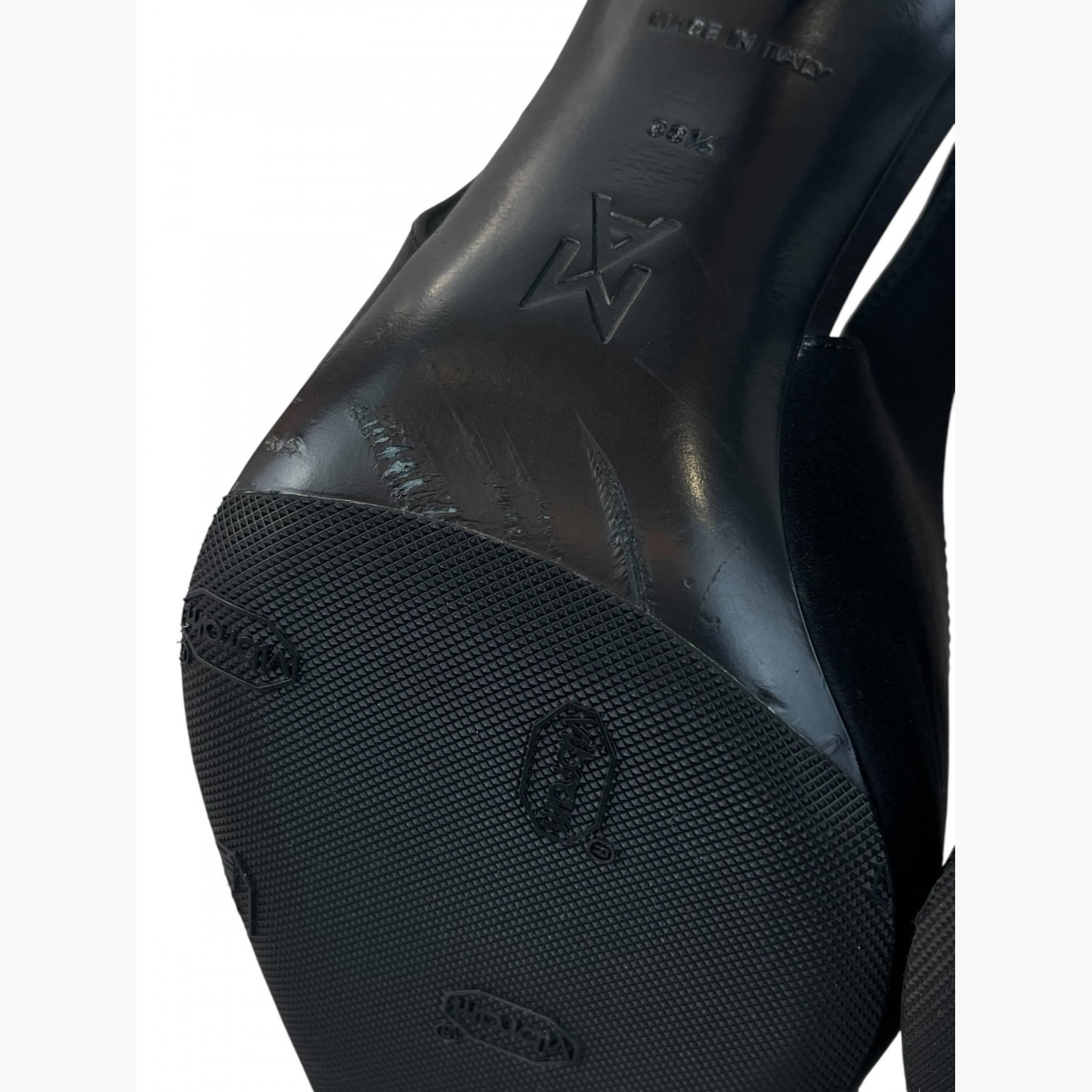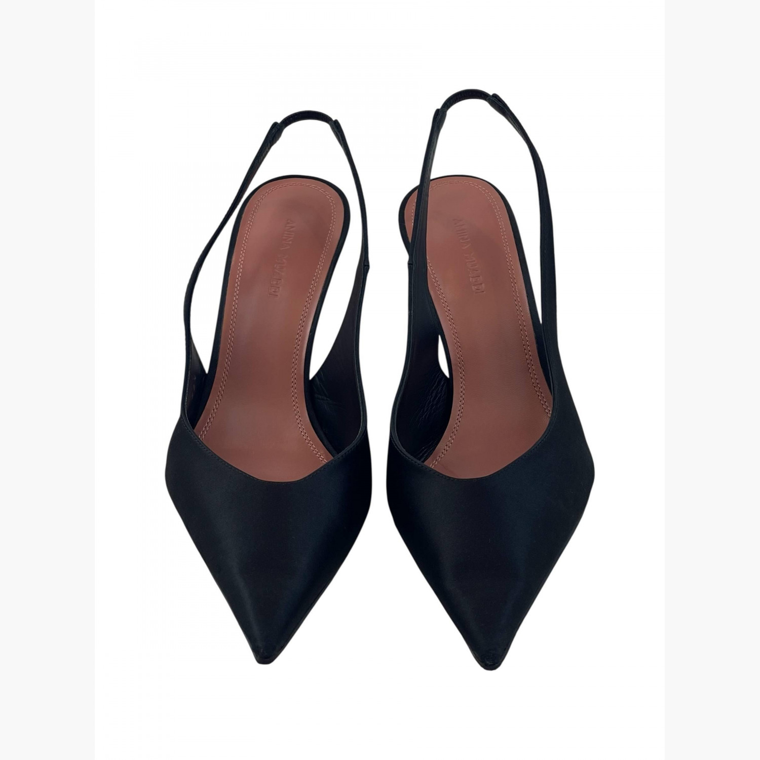 Black textile high-heeled shoes with an open back.In good condition, with signs of wear.