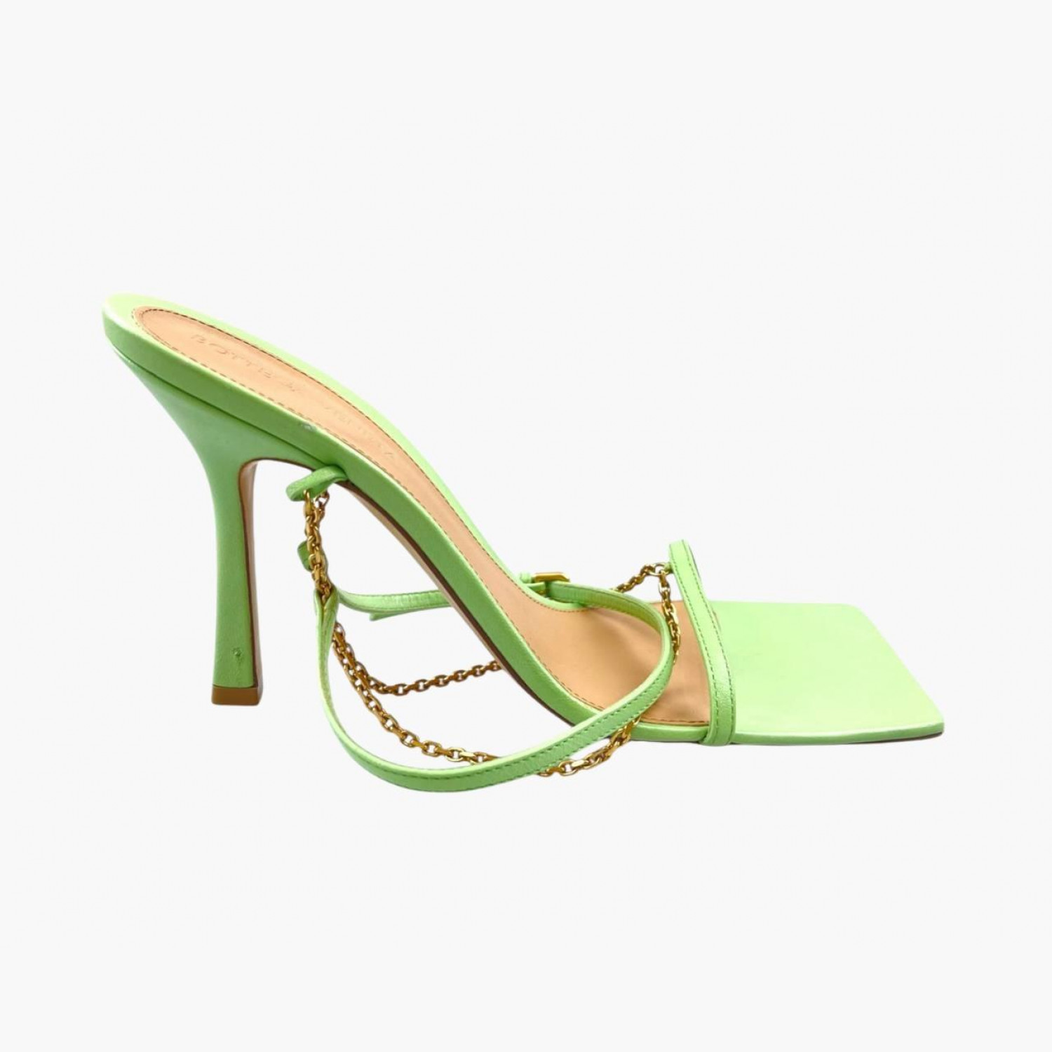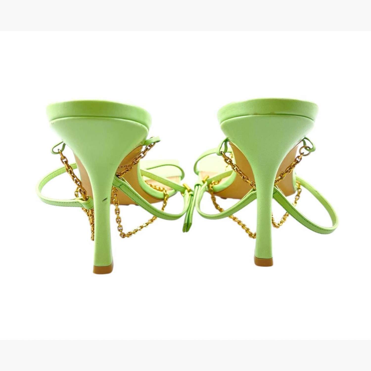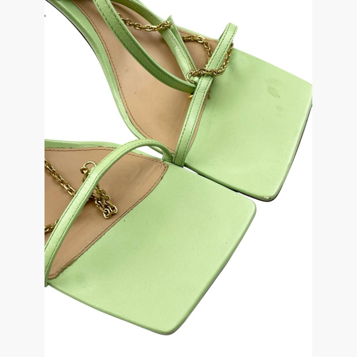 Green leather sandals with thin straps and a chain, featuring a square toe. In good condition, with wear marks.