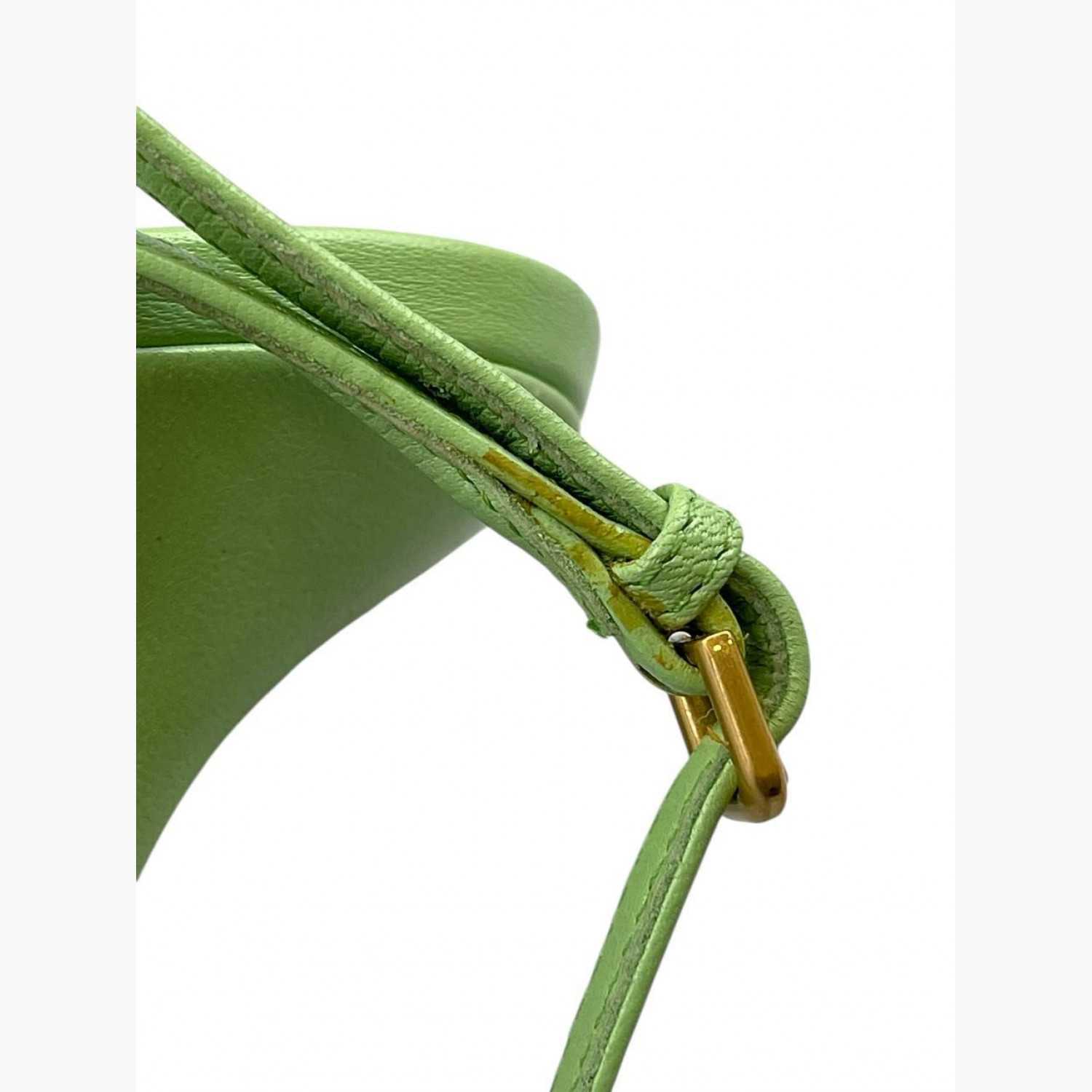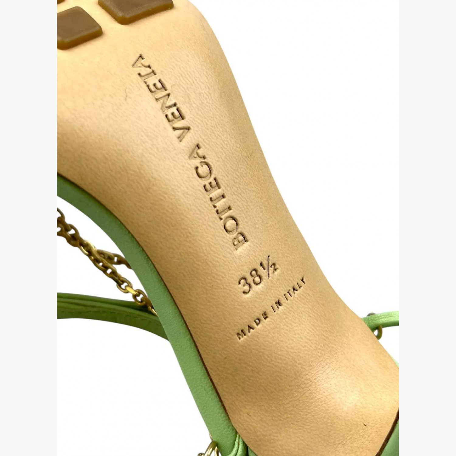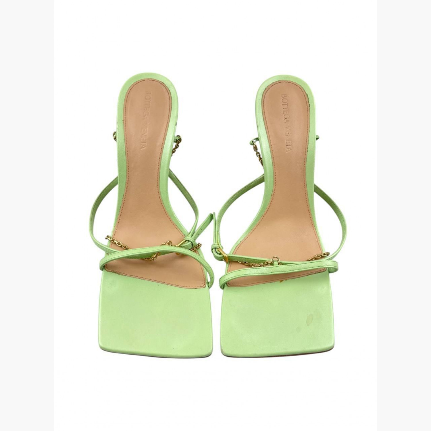 Green leather sandals with thin straps and a chain, featuring a square toe. In good condition, with wear marks.