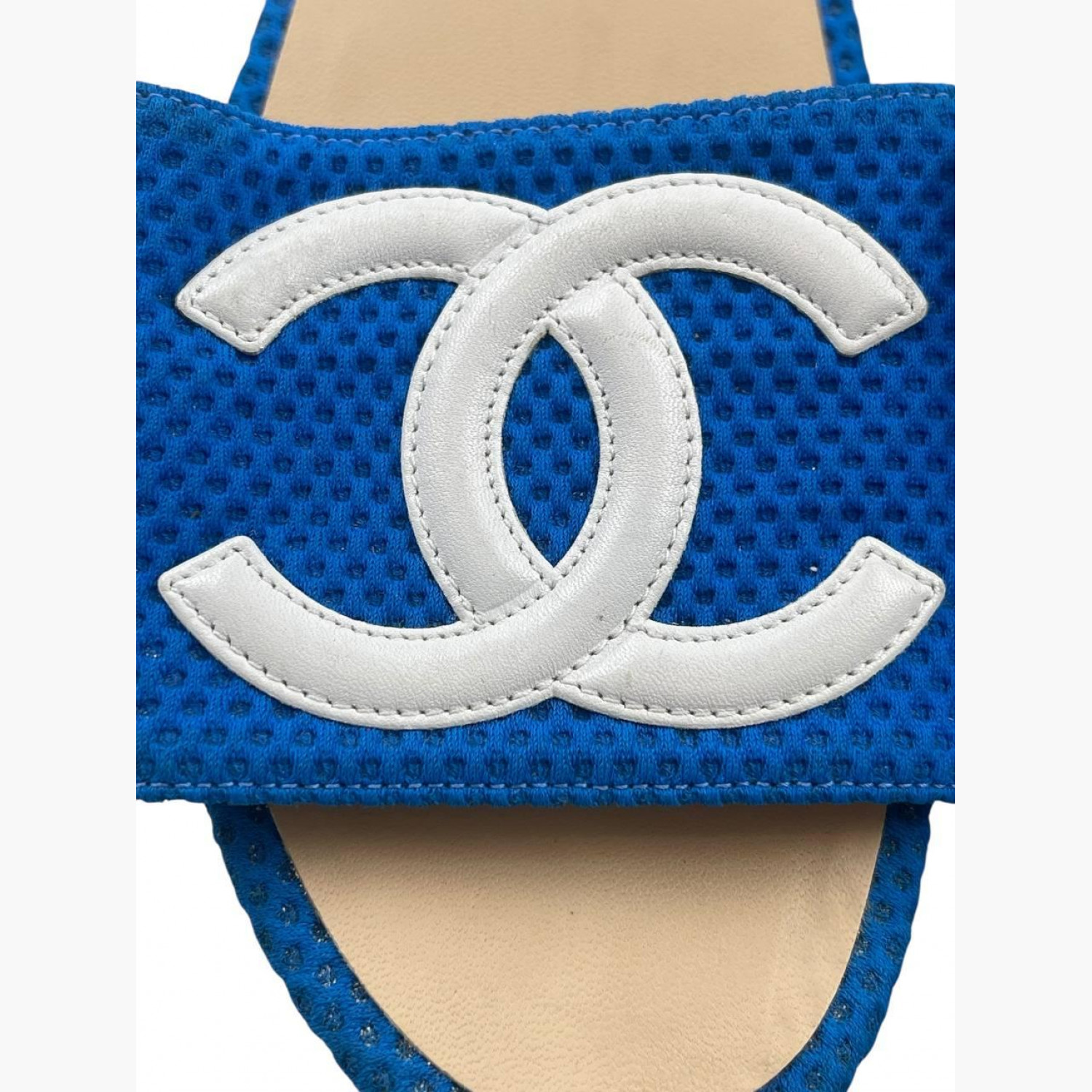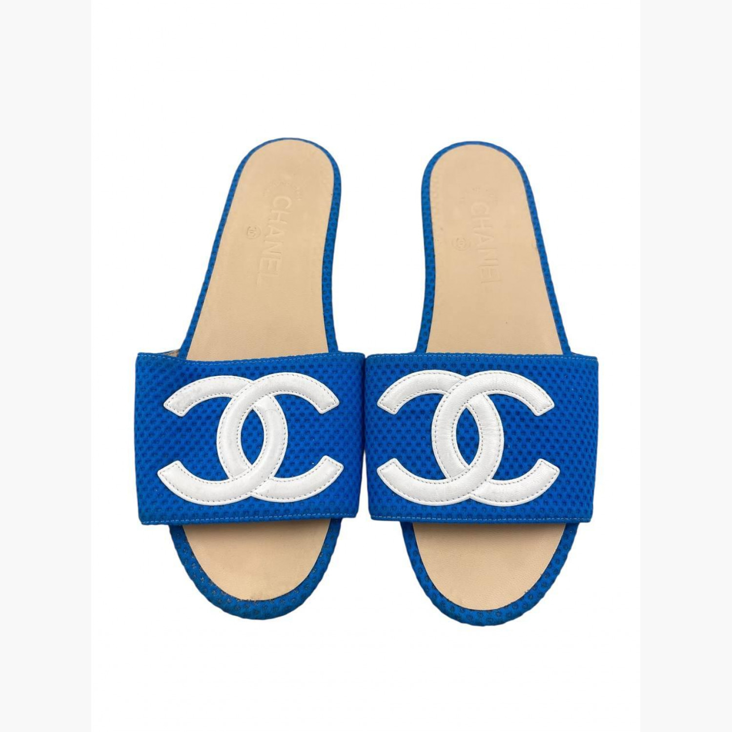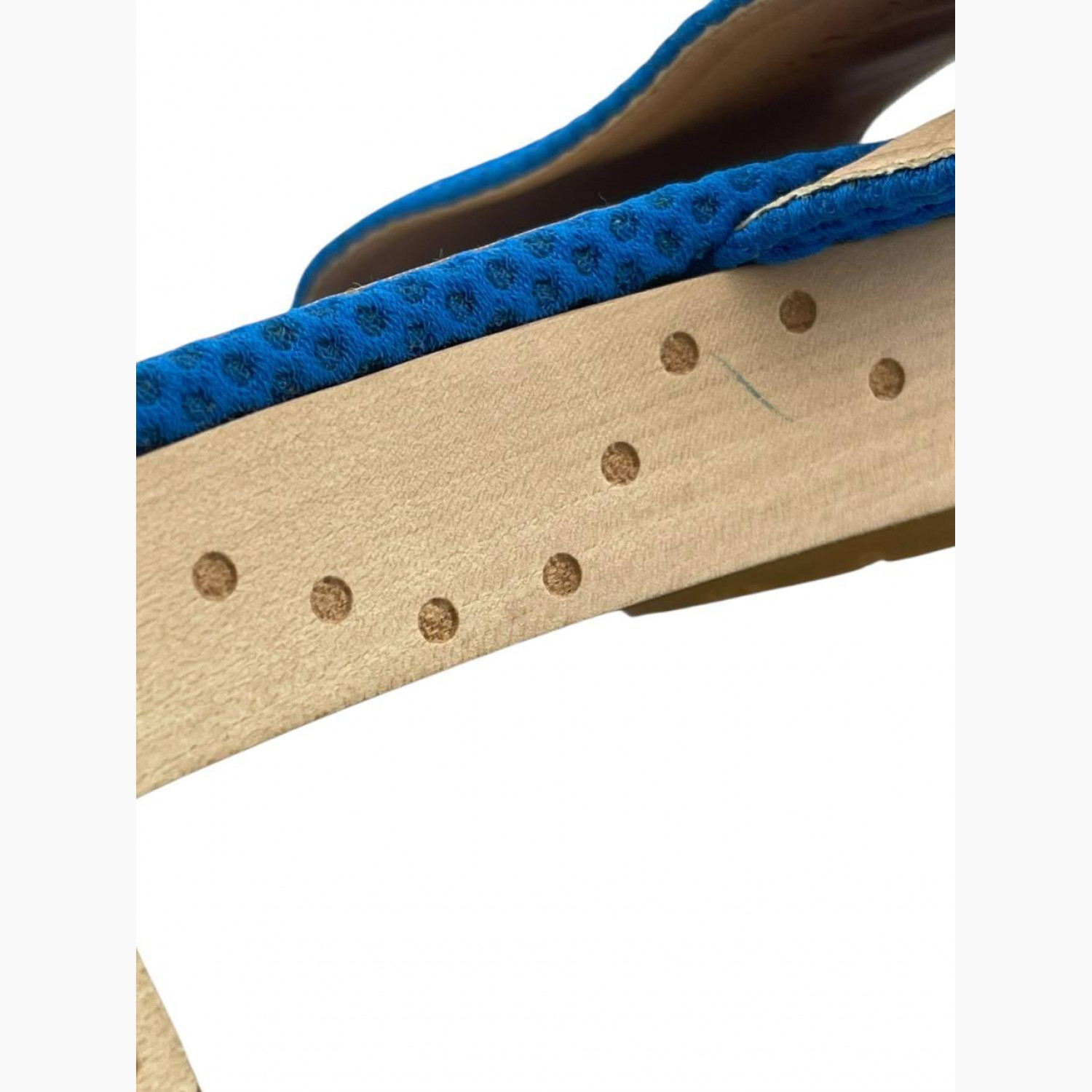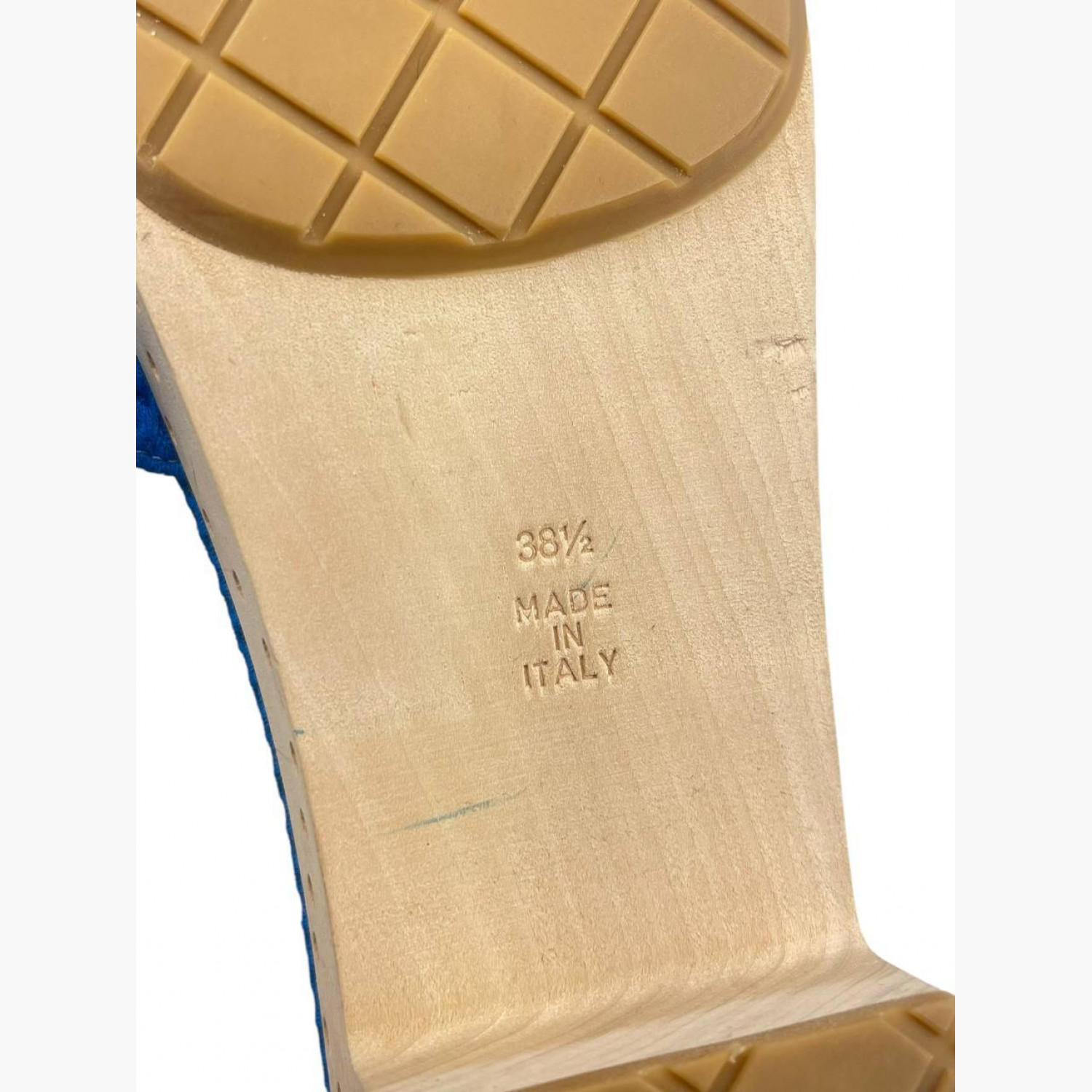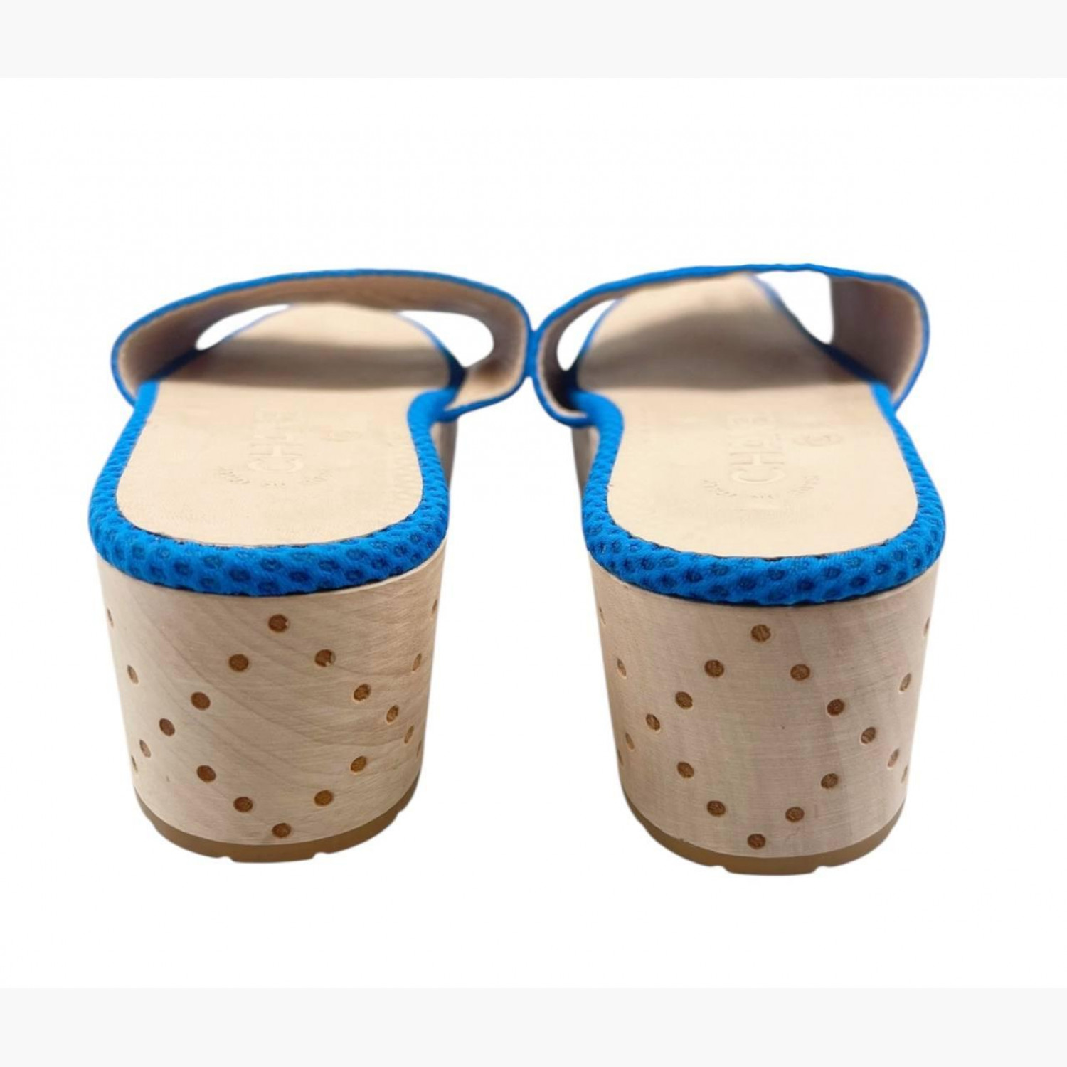 Blue textile slides with wooden sole, run small in size. In excellent condition, with minor wear marks.
