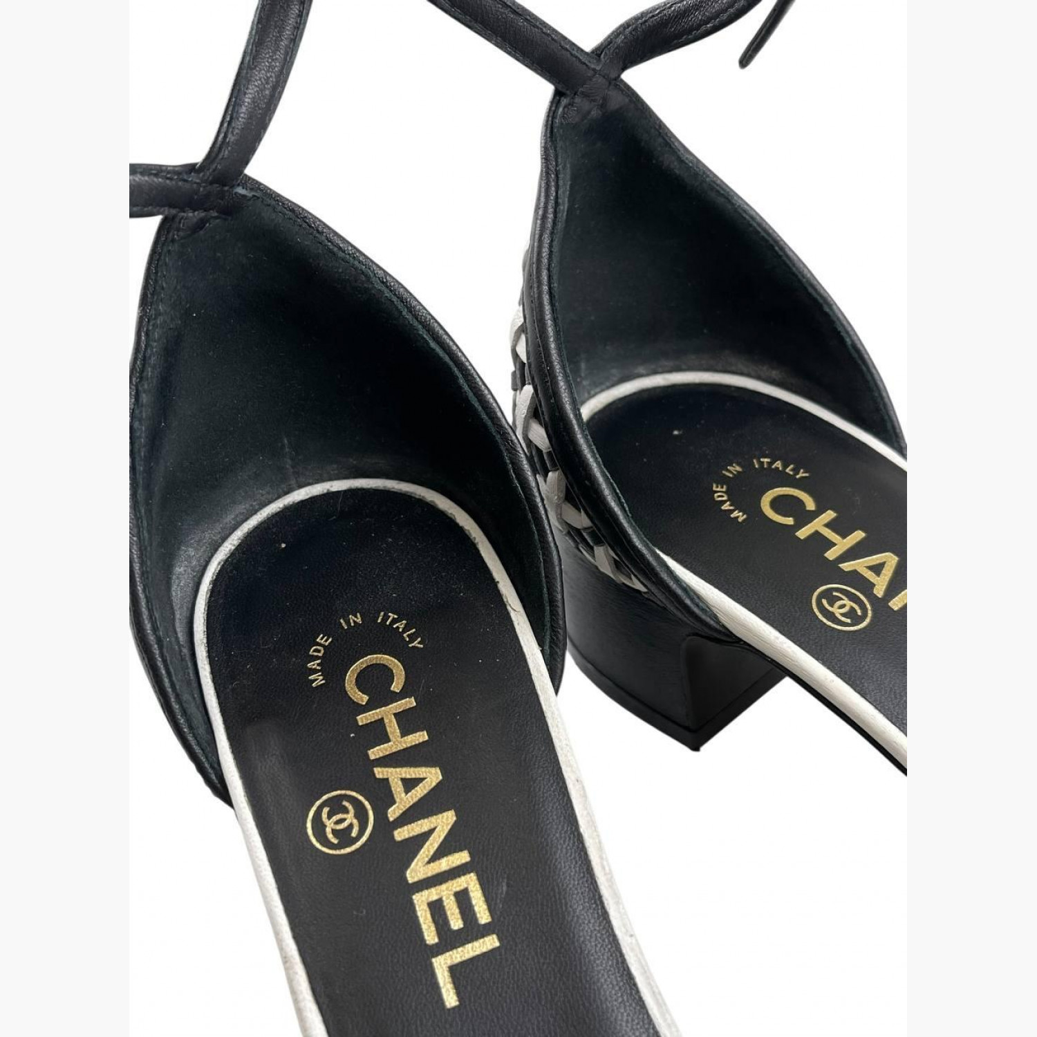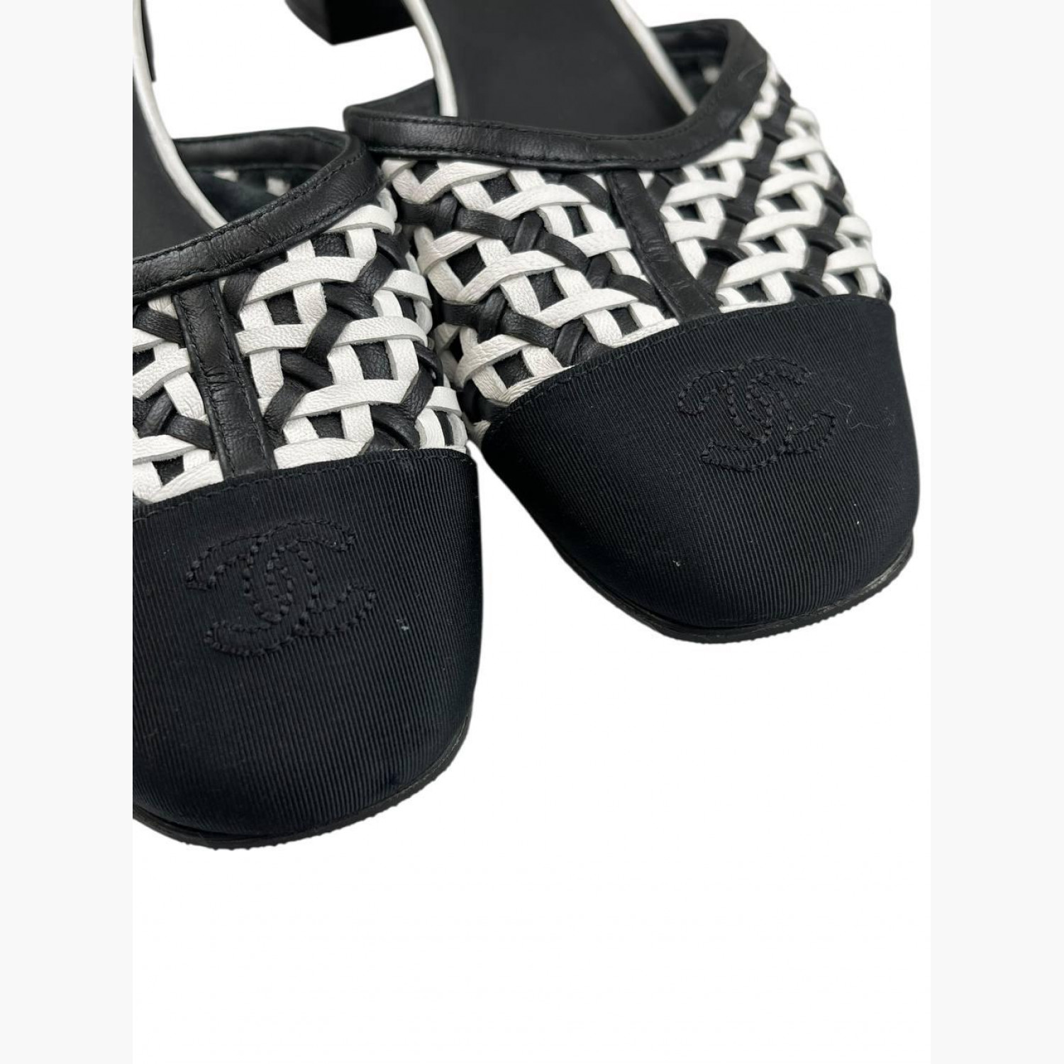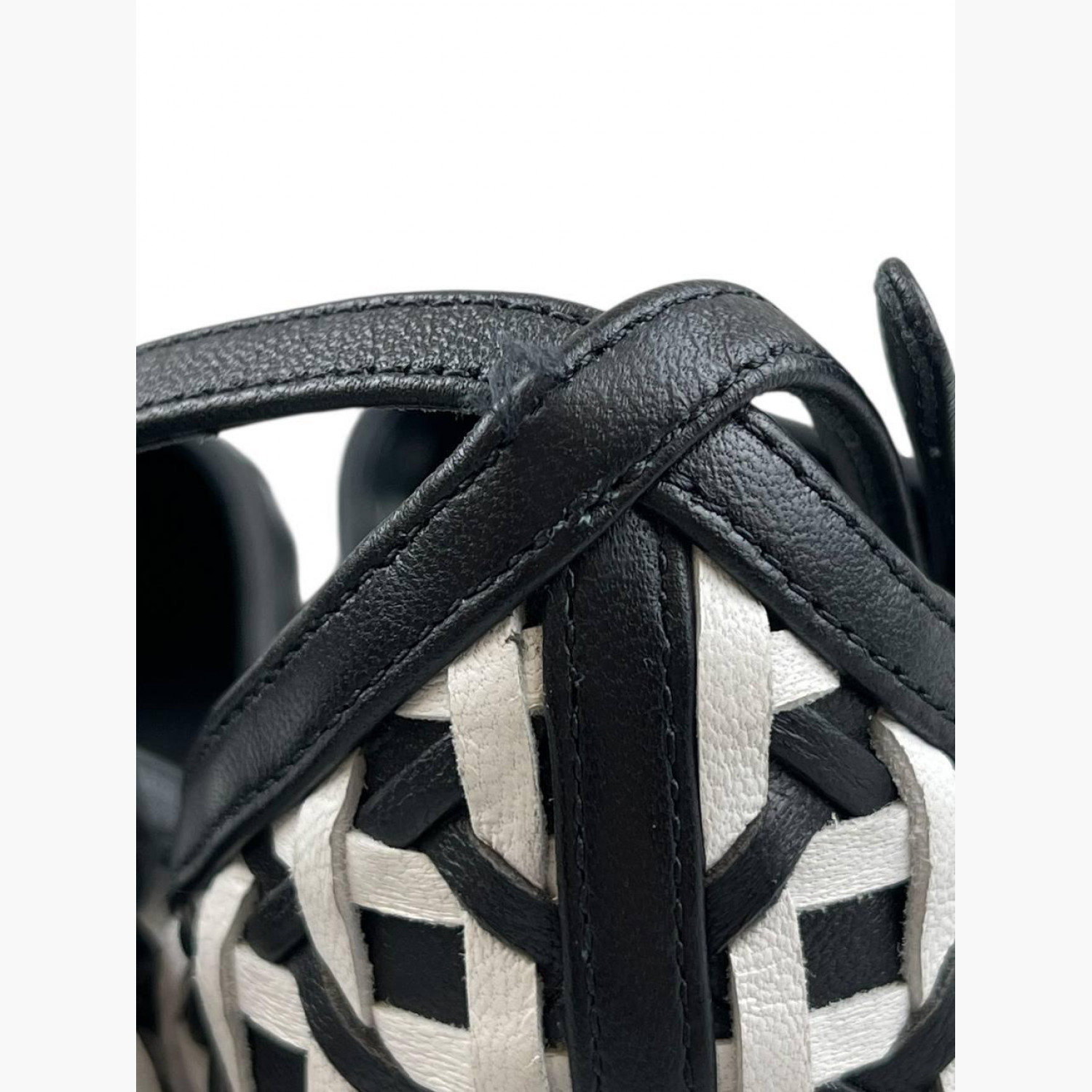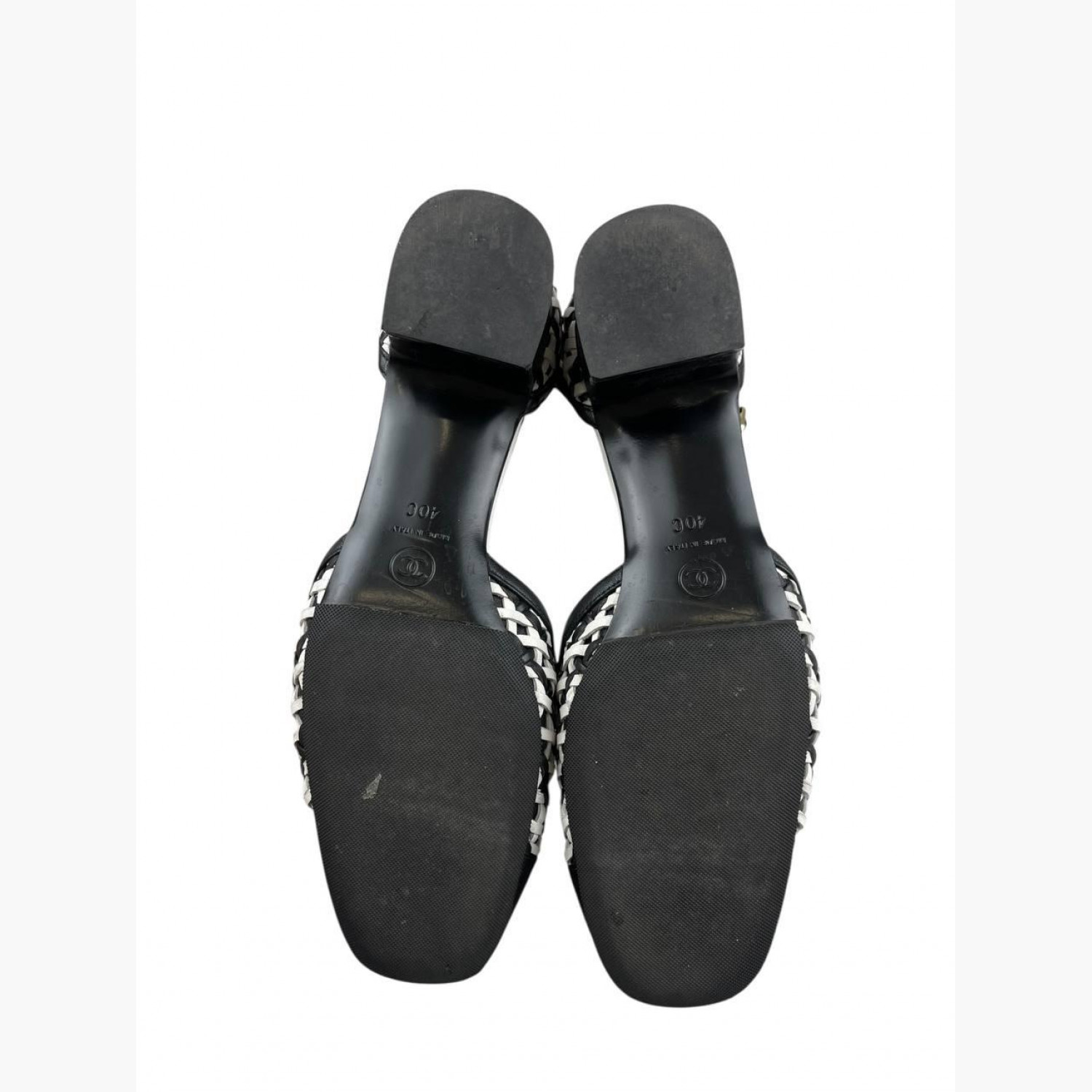 Black and white woven sandals with a round toe. In good condition, with wear marks.