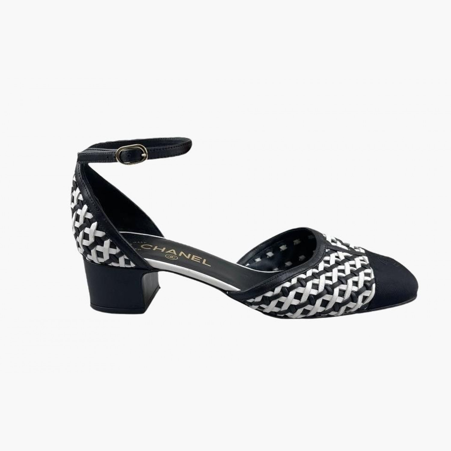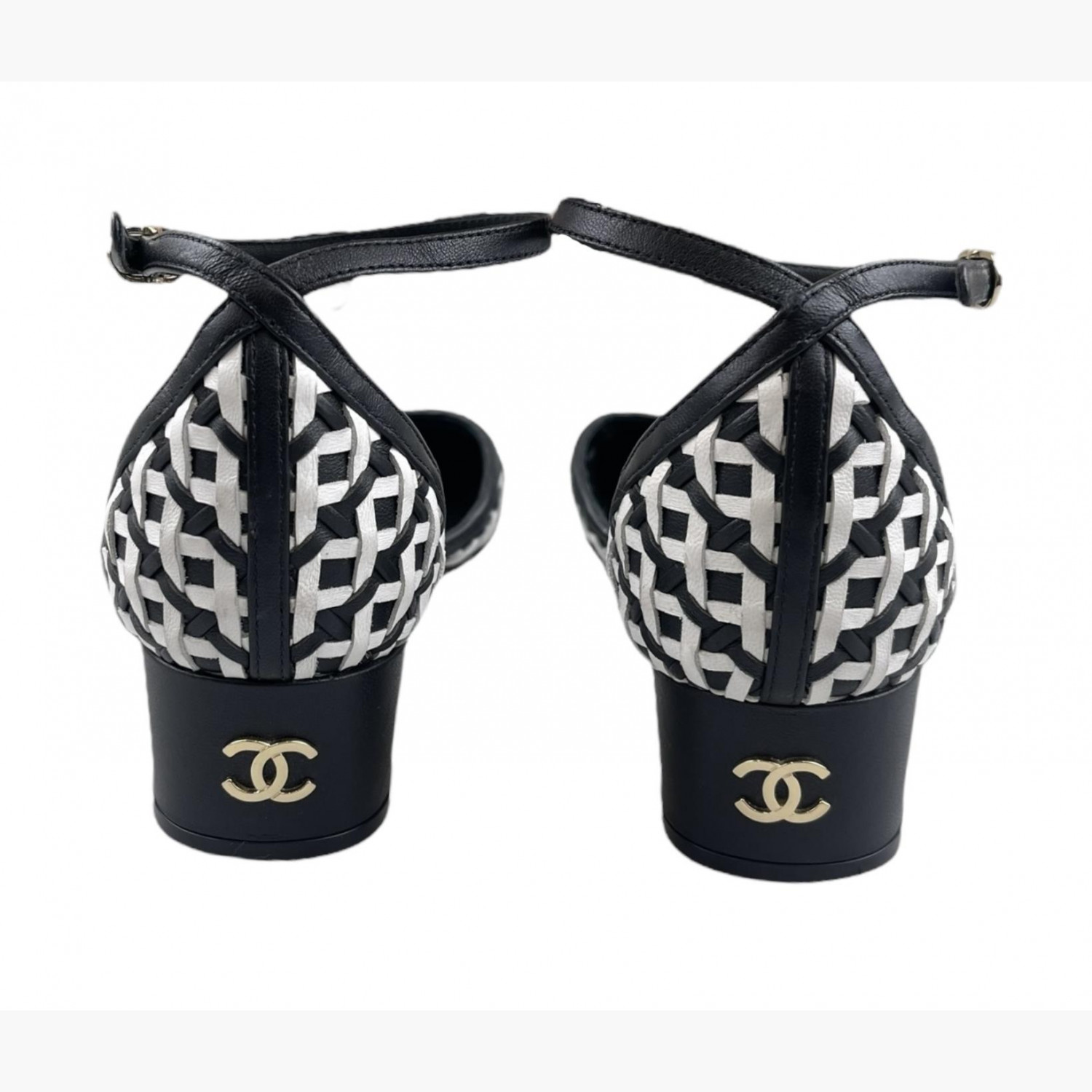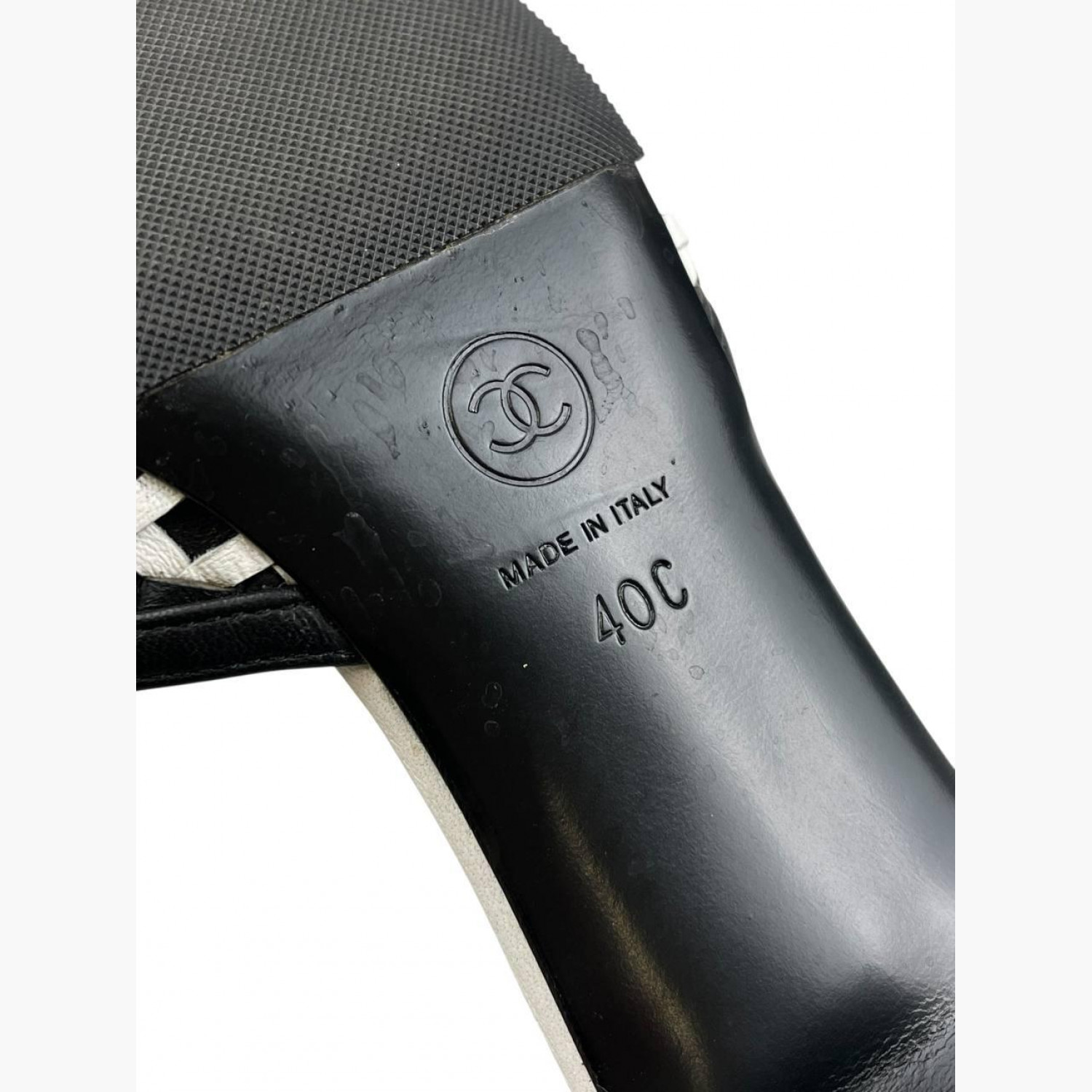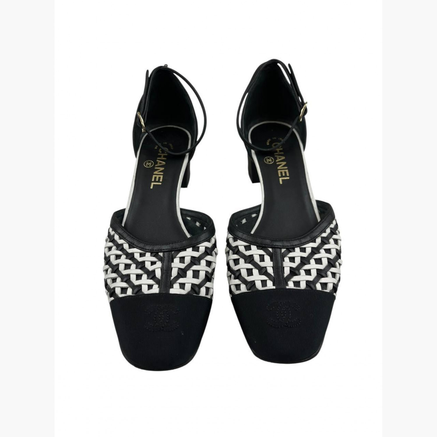 Black and white woven sandals with a round toe. In good condition, with wear marks.