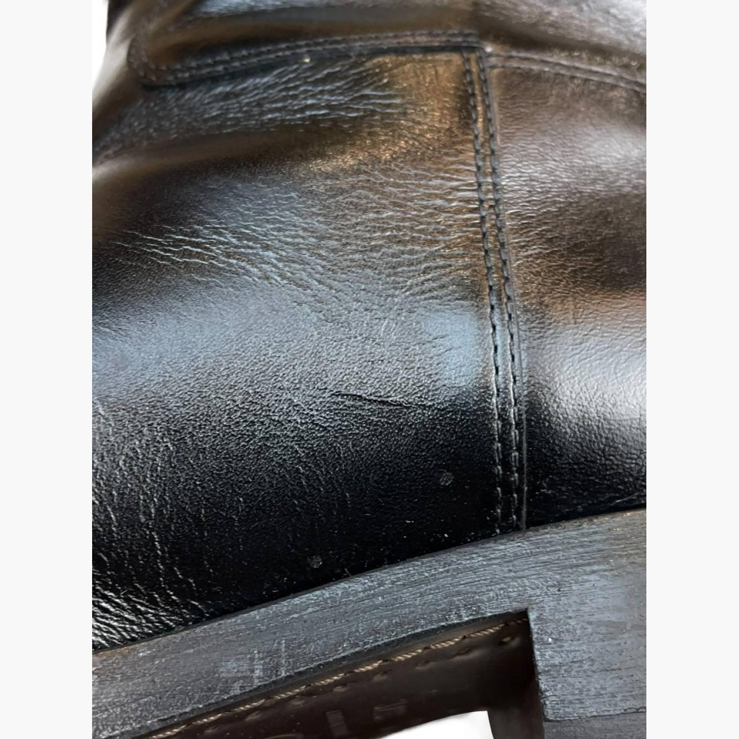 Black leather boots with a large textile logo on the side. In excellent condition, with minor wear marks.