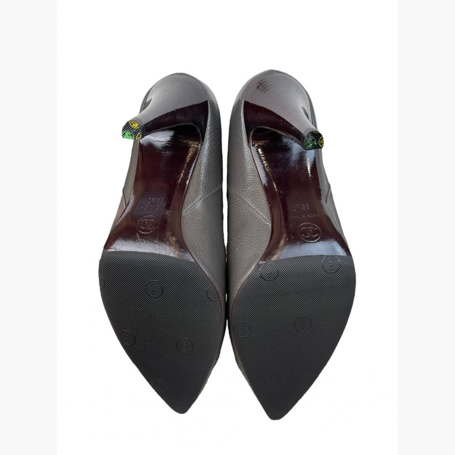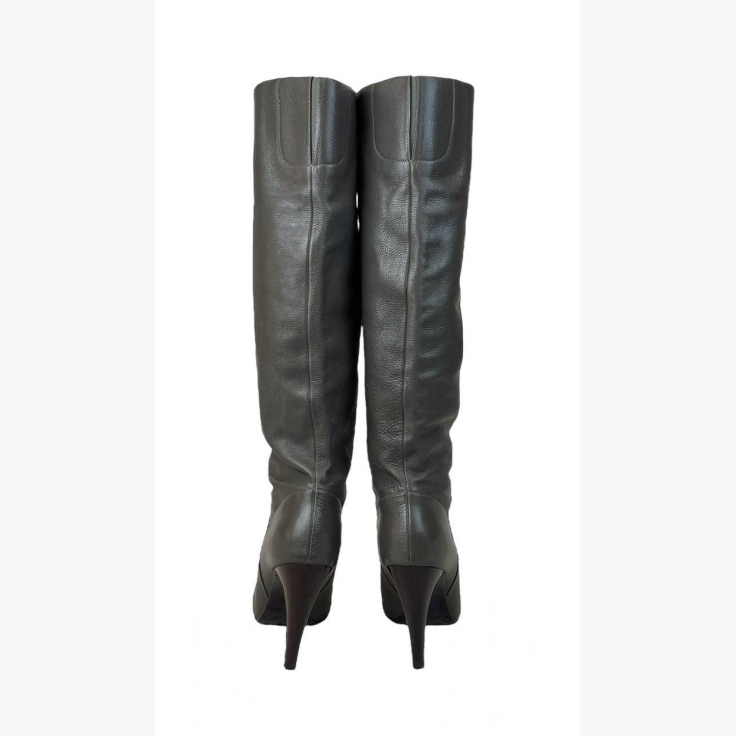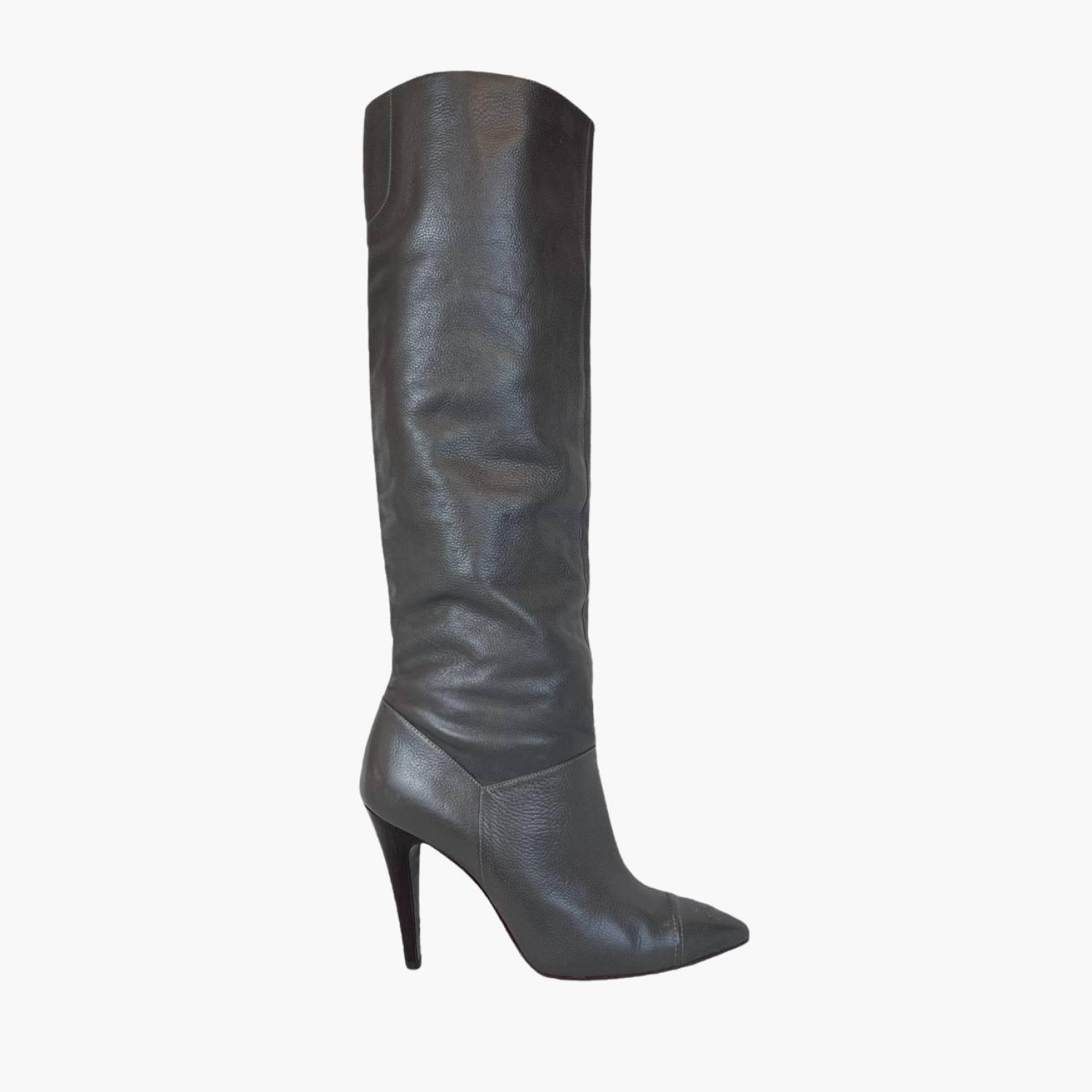 Grey leather heeled boots with a logo on the toe. In good condition, with wear marks.