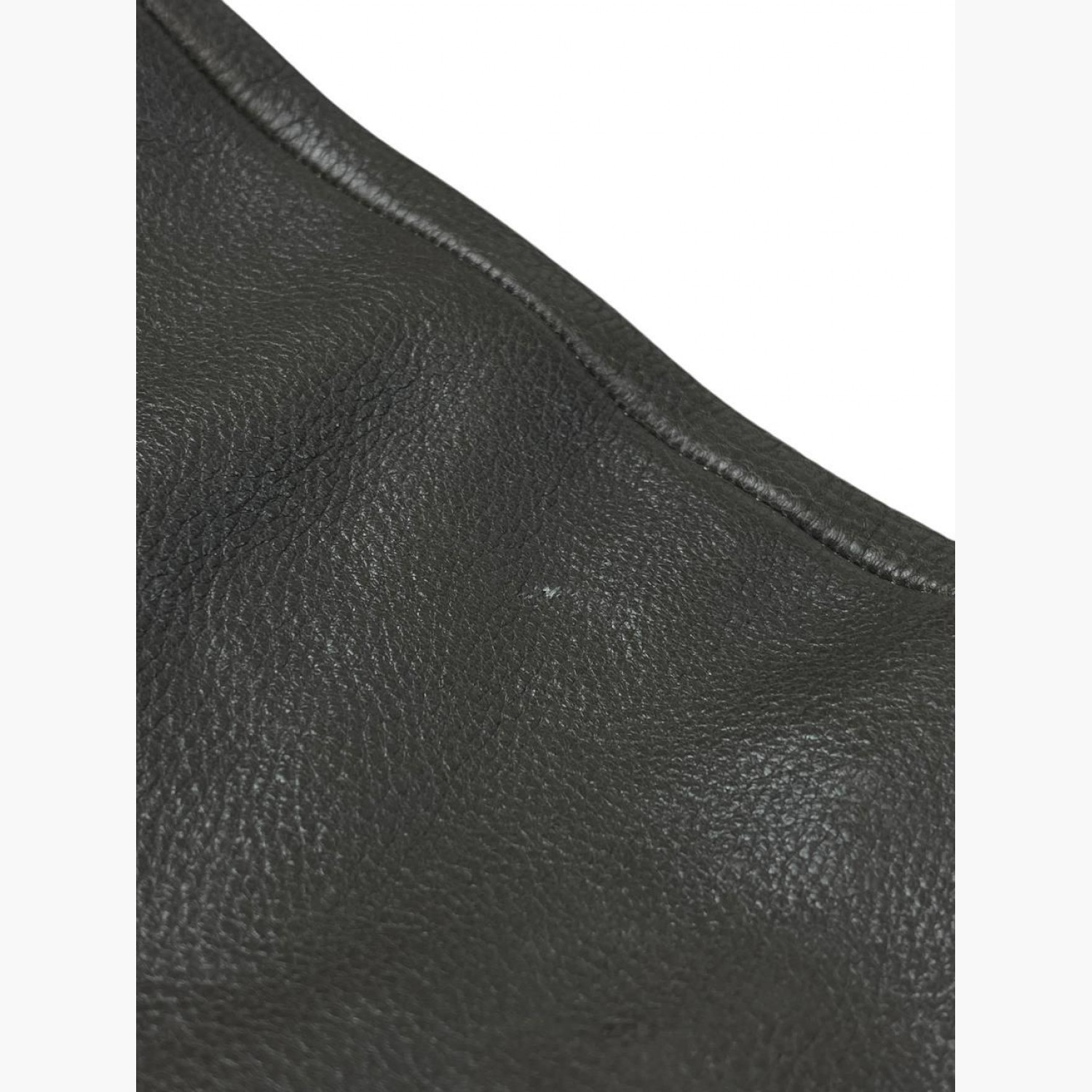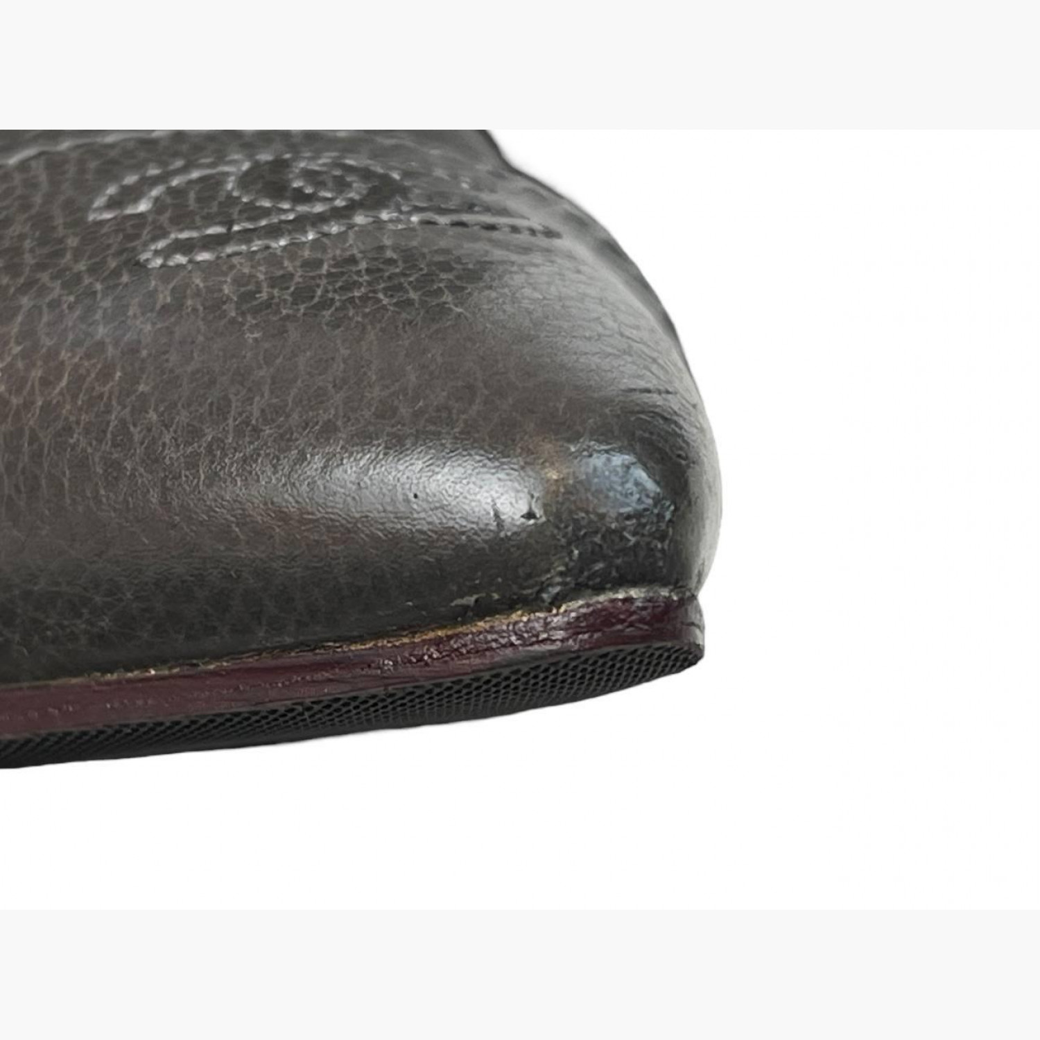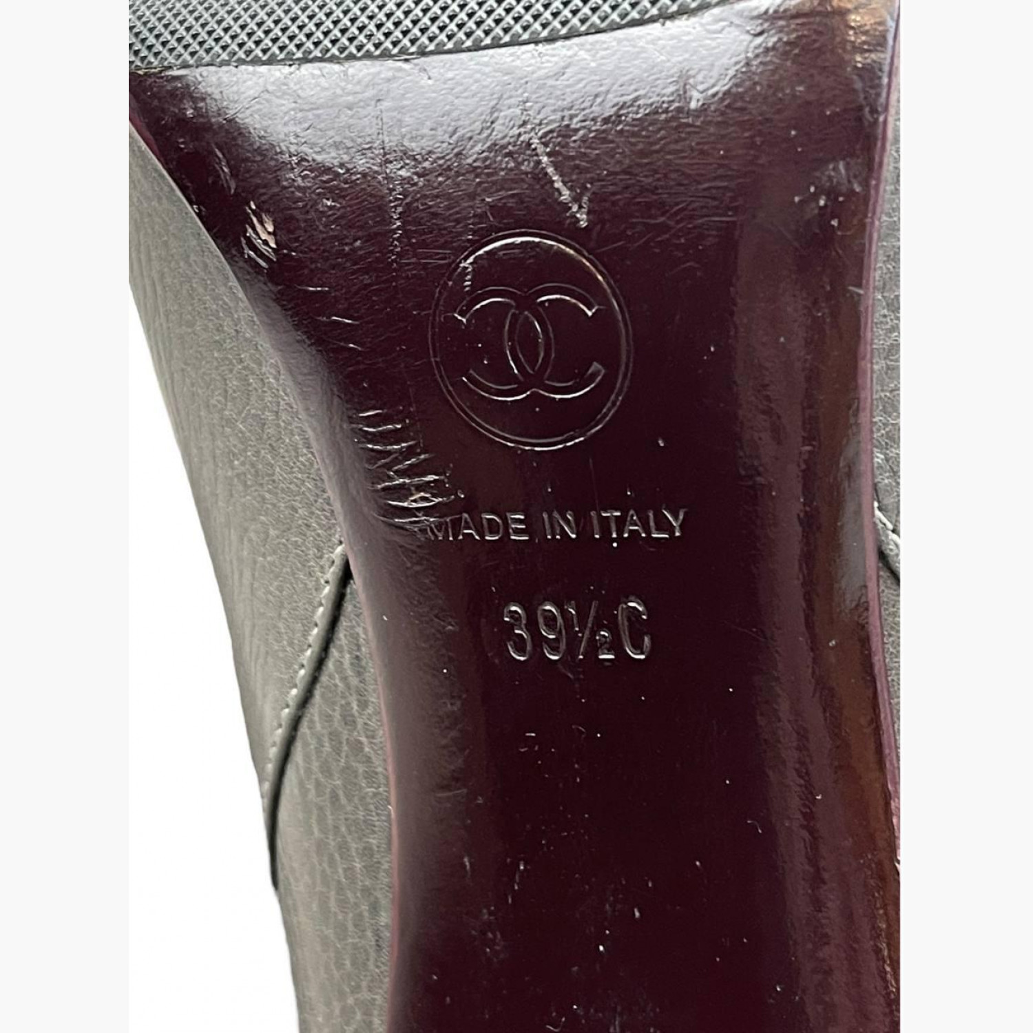 Grey leather heeled boots with a logo on the toe. In good condition, with wear marks.
